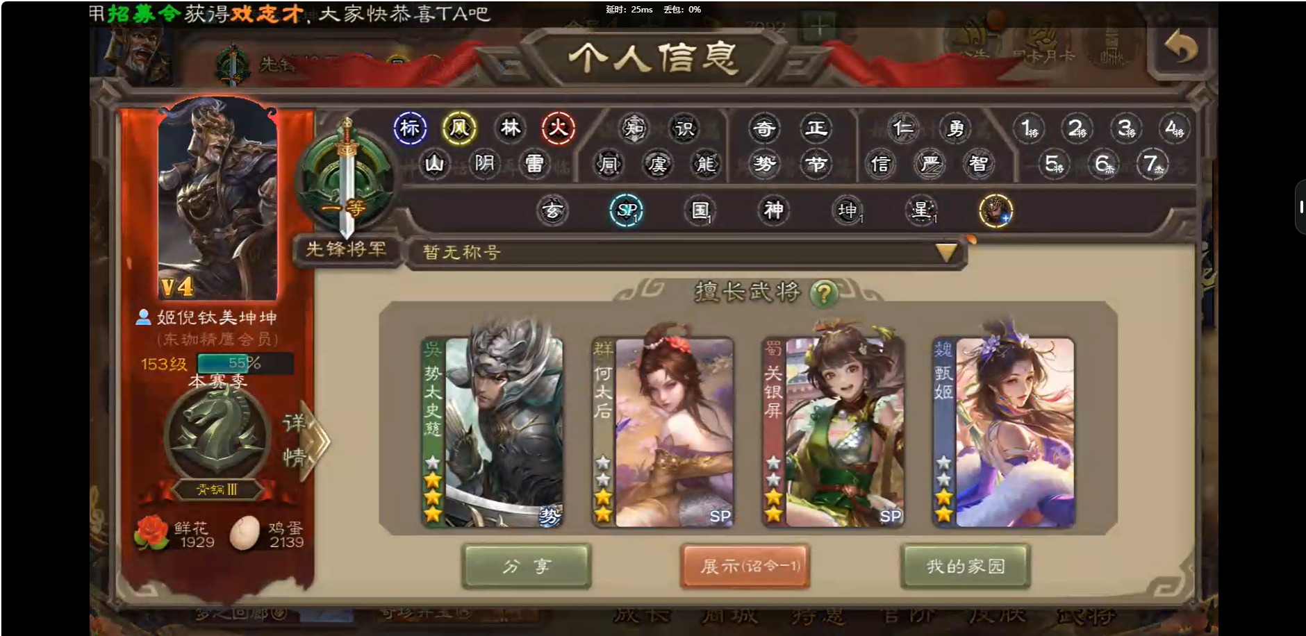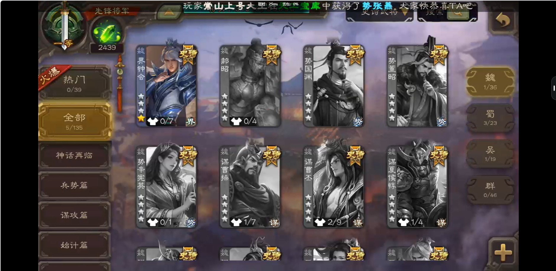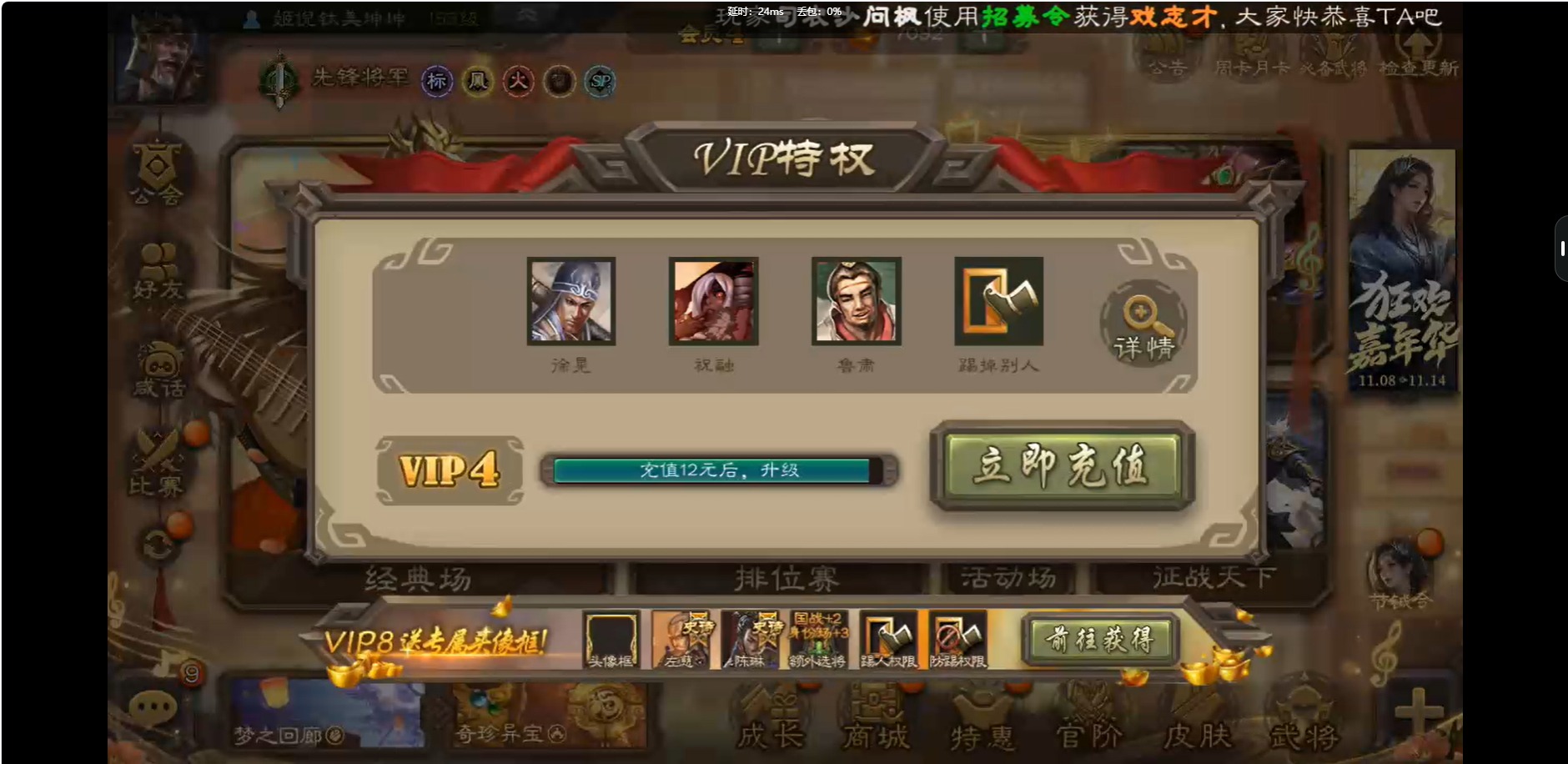 [14649357]vip4 先锋将军 179武将 1动态皮肤 5史诗武将 【魏国武将】:界钟会甄姬 【蜀国武将】:谯周傅佥关银屏谋关羽 【吴国武将】:势太史慈 【群国武将】:何太后