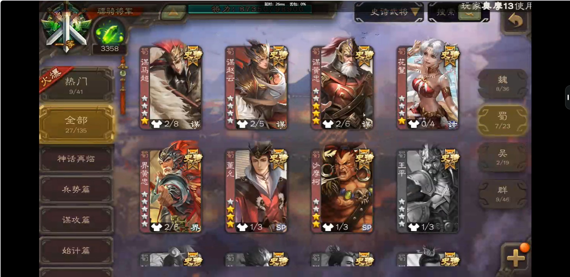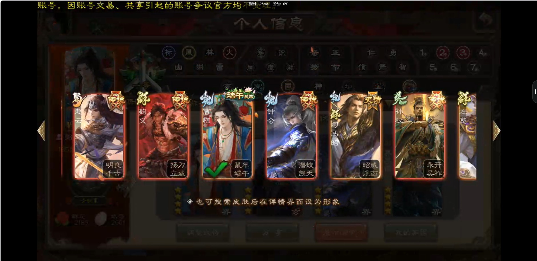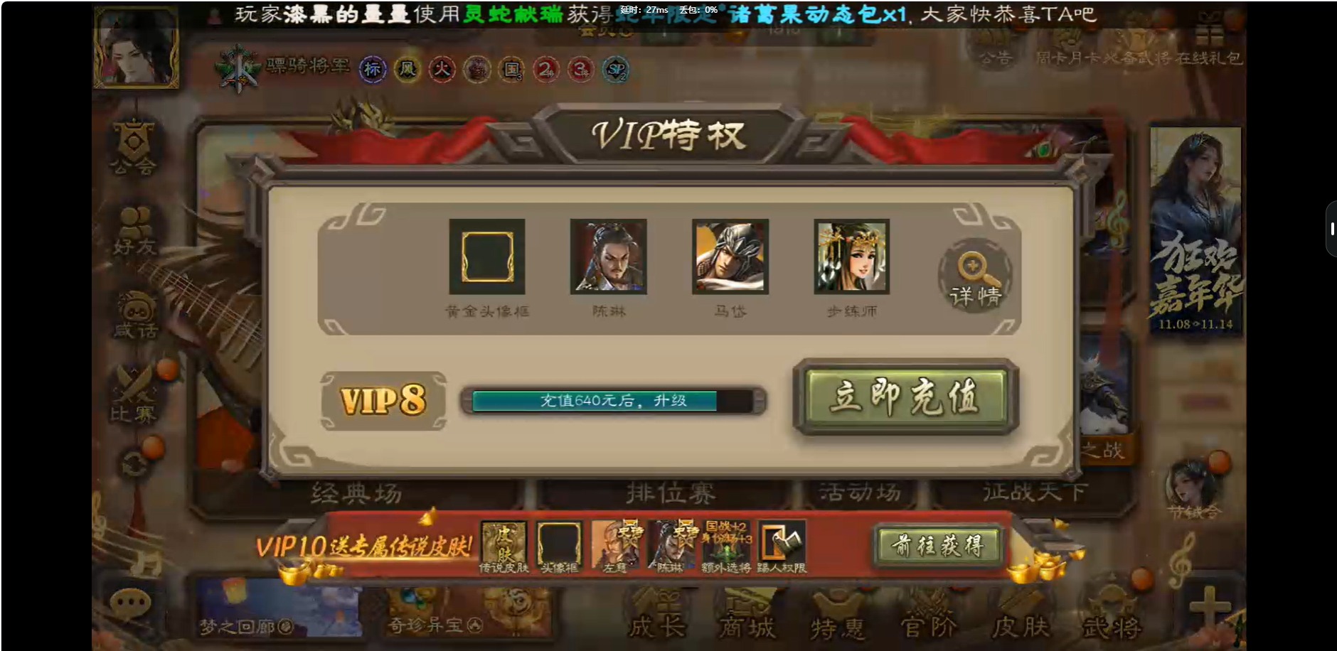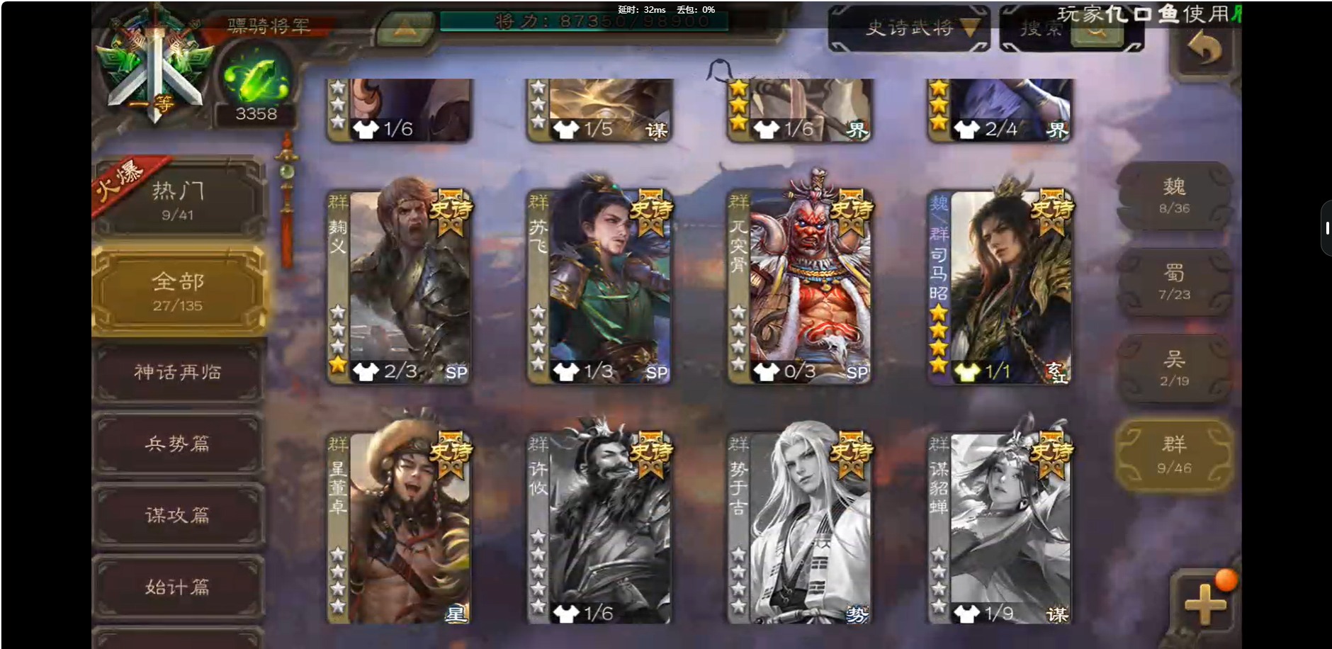 [14649692]vip8 骠骑将军 325武将 20动态皮肤 27史诗武将 【神将】:神赵云神刘备 【魏国武将】:曹髦界钟会界曹植 【蜀国武将】:谋黄忠谋赵云谋马超沙摩柯界黄忠花鬘董允 【吴国武将】:骆统界朱然 【群国武将】:星董卓群-司马昭左慈兀突骨苏飞麹义界左慈界李儒谋张角