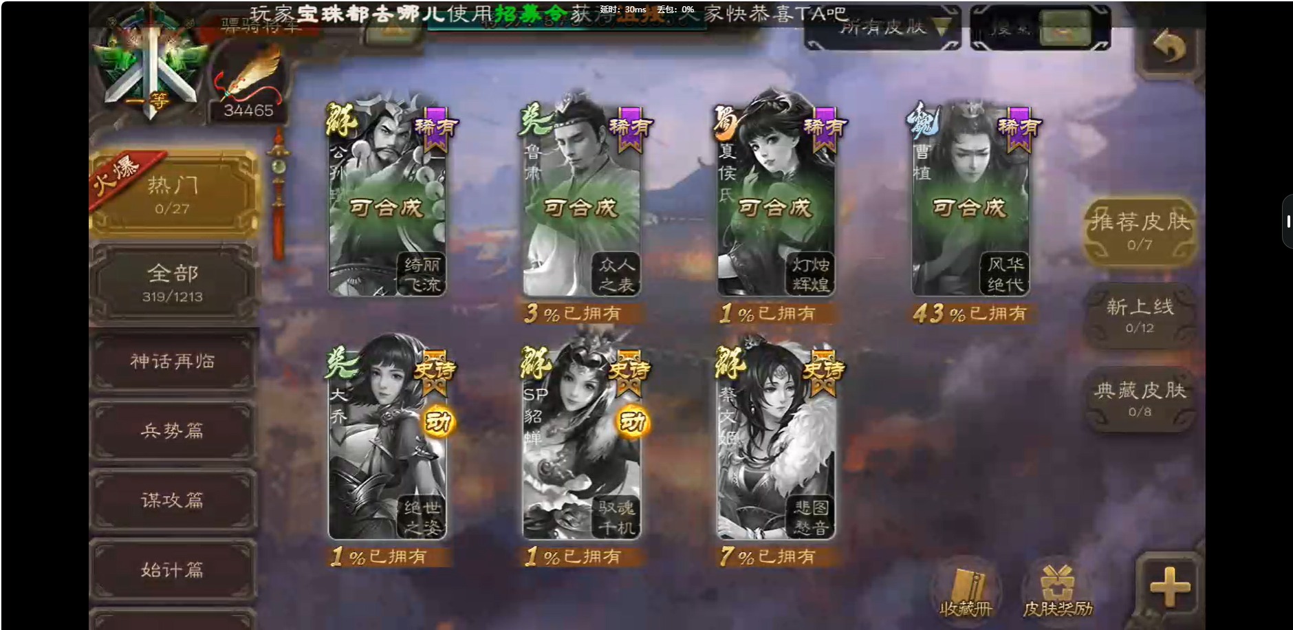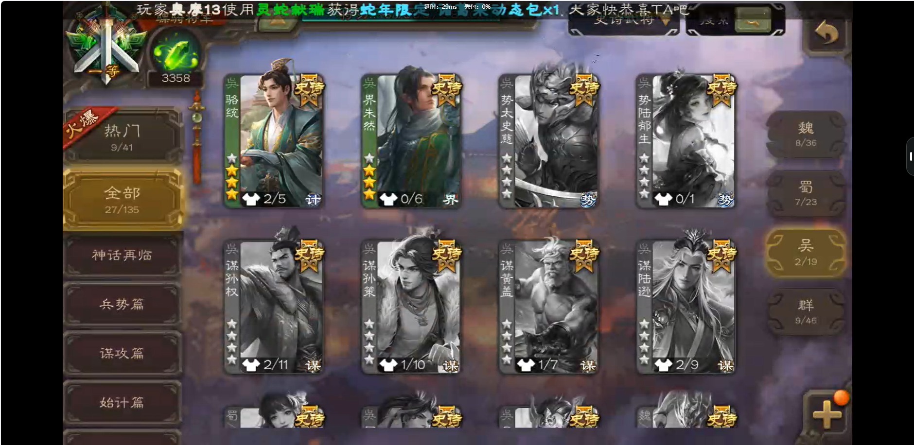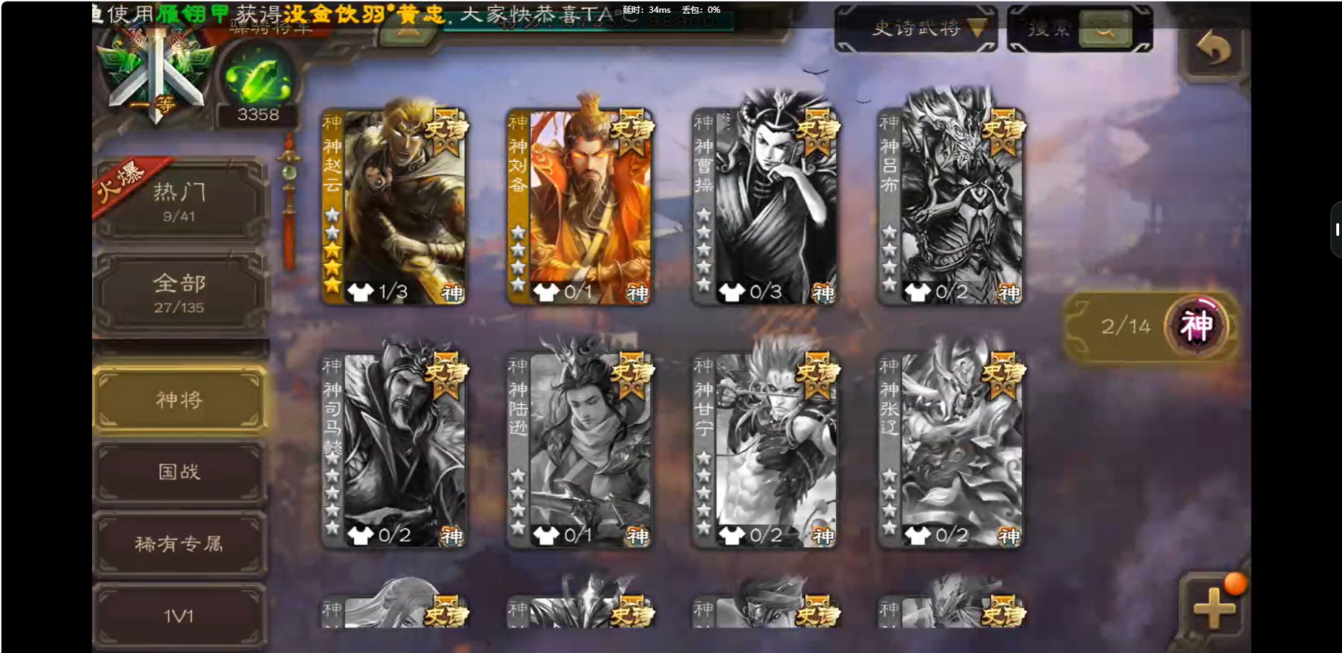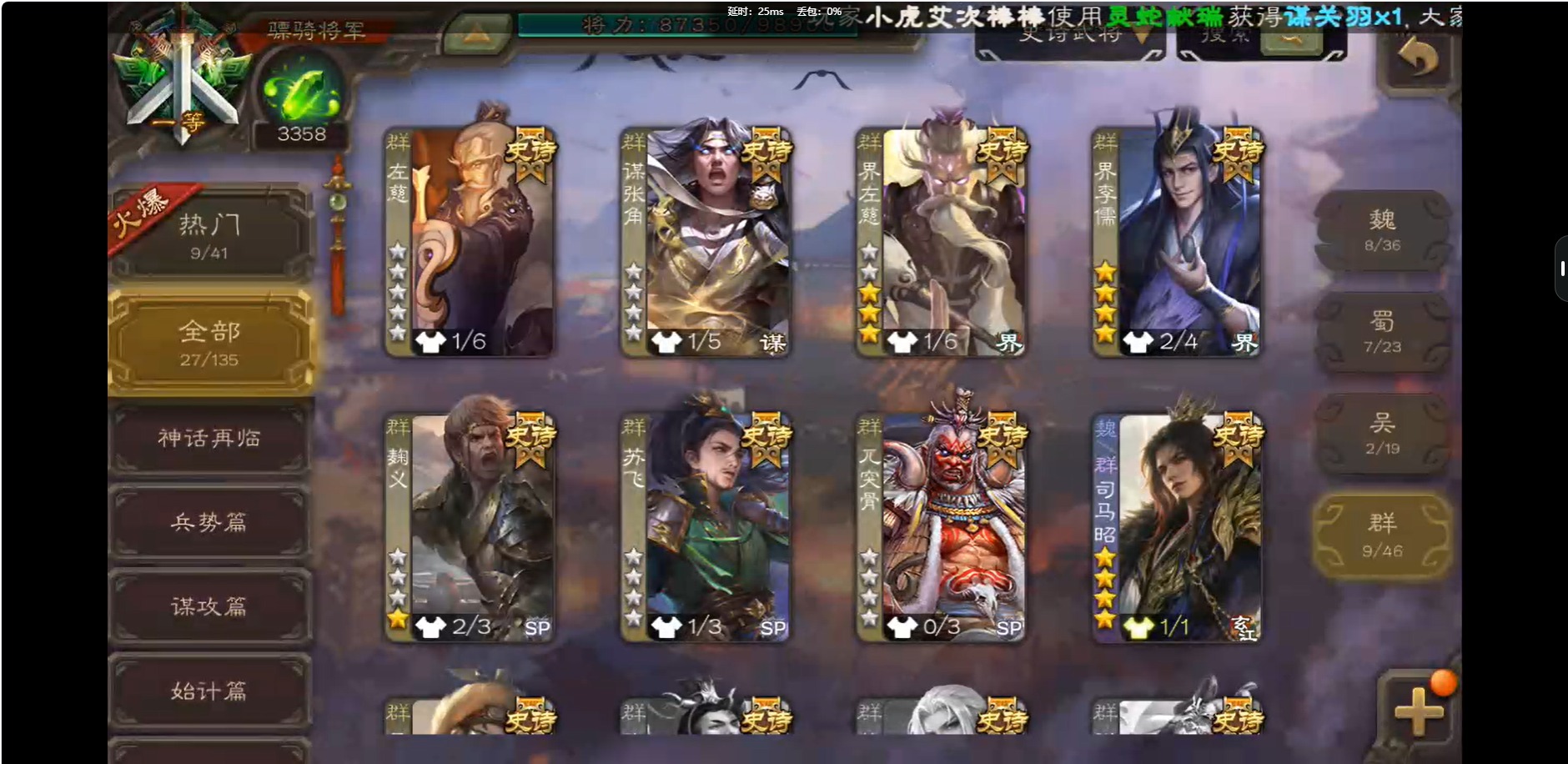 [14649692]vip8 骠骑将军 325武将 20动态皮肤 27史诗武将 【神将】:神赵云神刘备 【魏国武将】:曹髦界钟会界曹植 【蜀国武将】:谋黄忠谋赵云谋马超沙摩柯界黄忠花鬘董允 【吴国武将】:骆统界朱然 【群国武将】:星董卓群-司马昭左慈兀突骨苏飞麹义界左慈界李儒谋张角