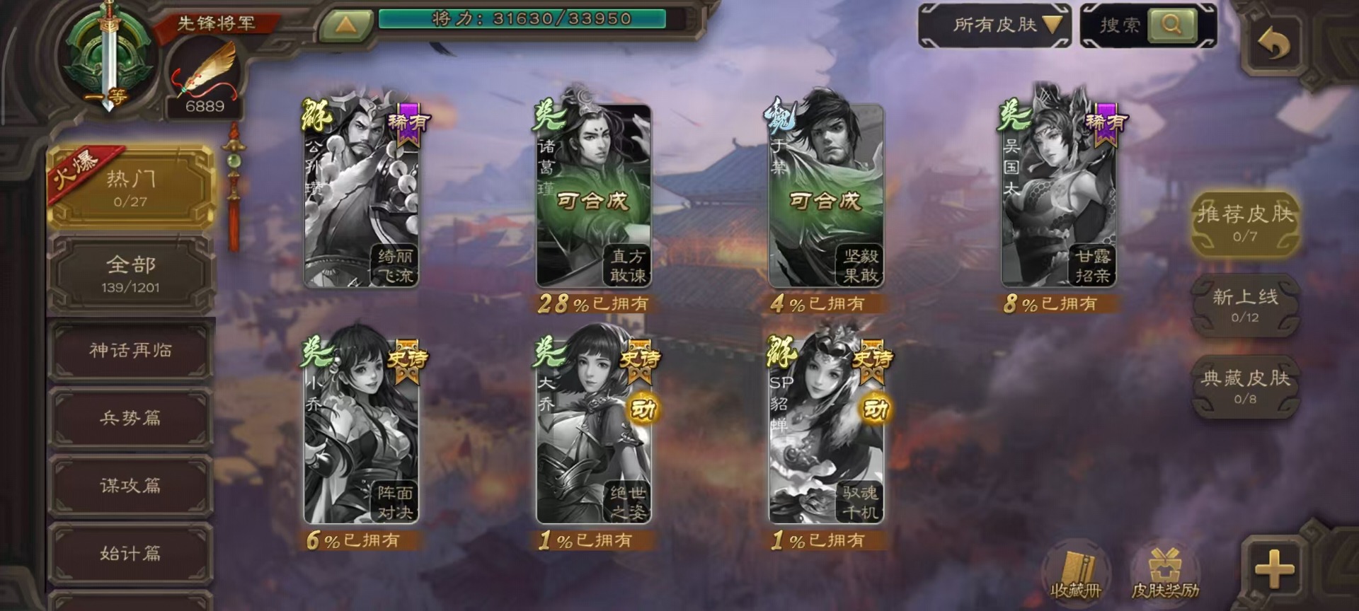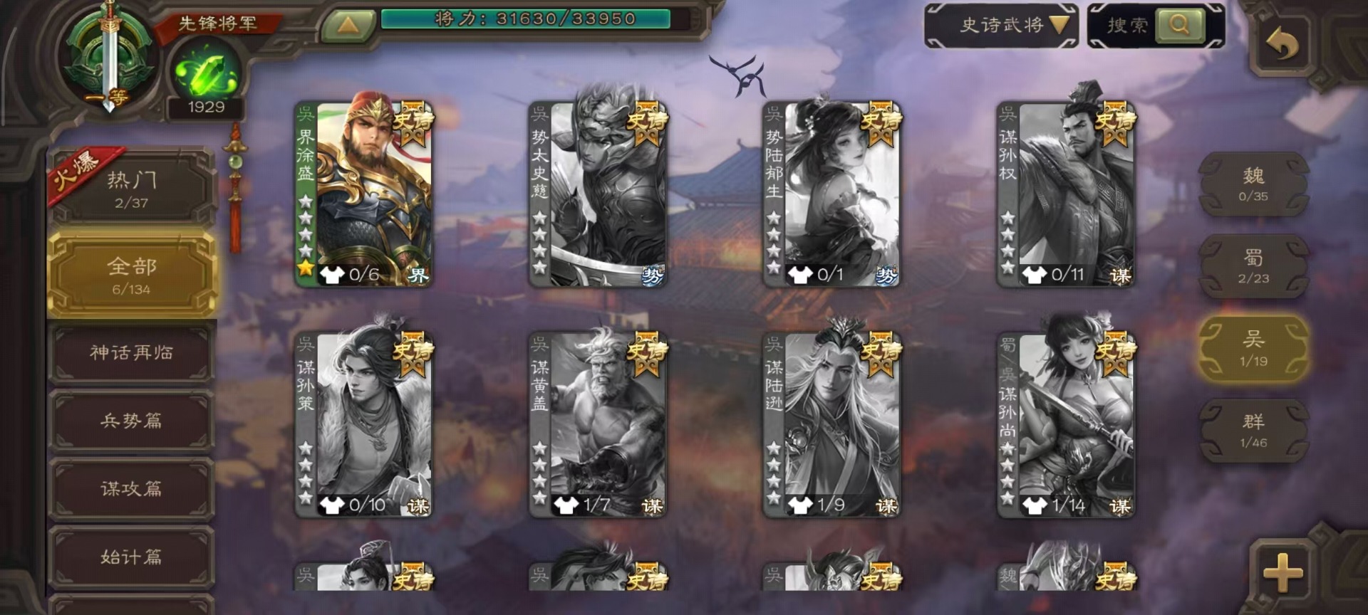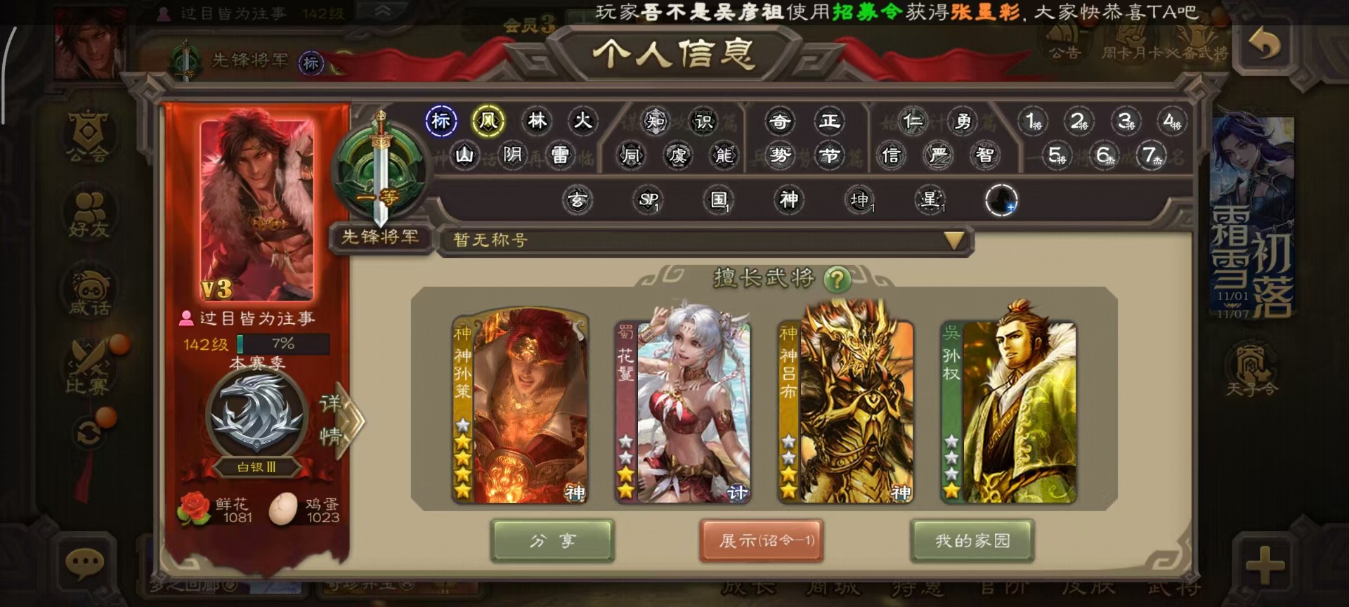 [14649851]vip3 先锋将军 163武将 5动态皮肤 6史诗武将 【神将】:神吕布神孙策 【蜀国武将】:沙摩柯花鬘 【吴国武将】:界徐盛 【群国武将】:麹义