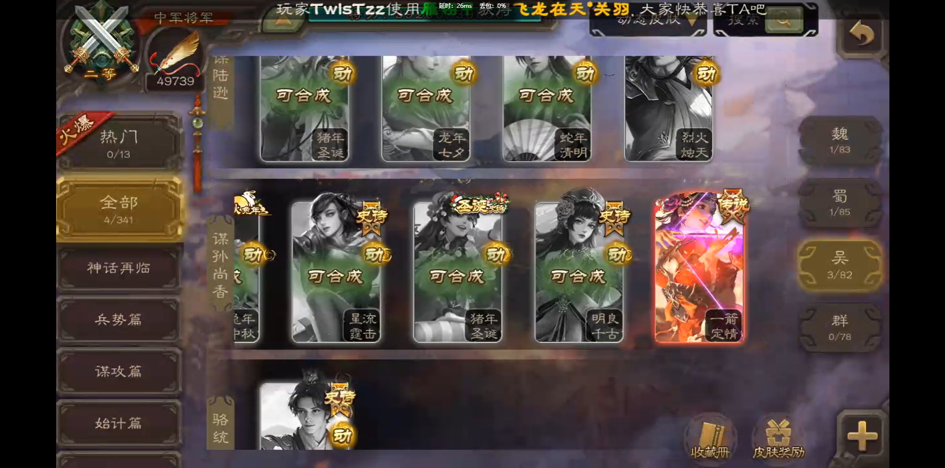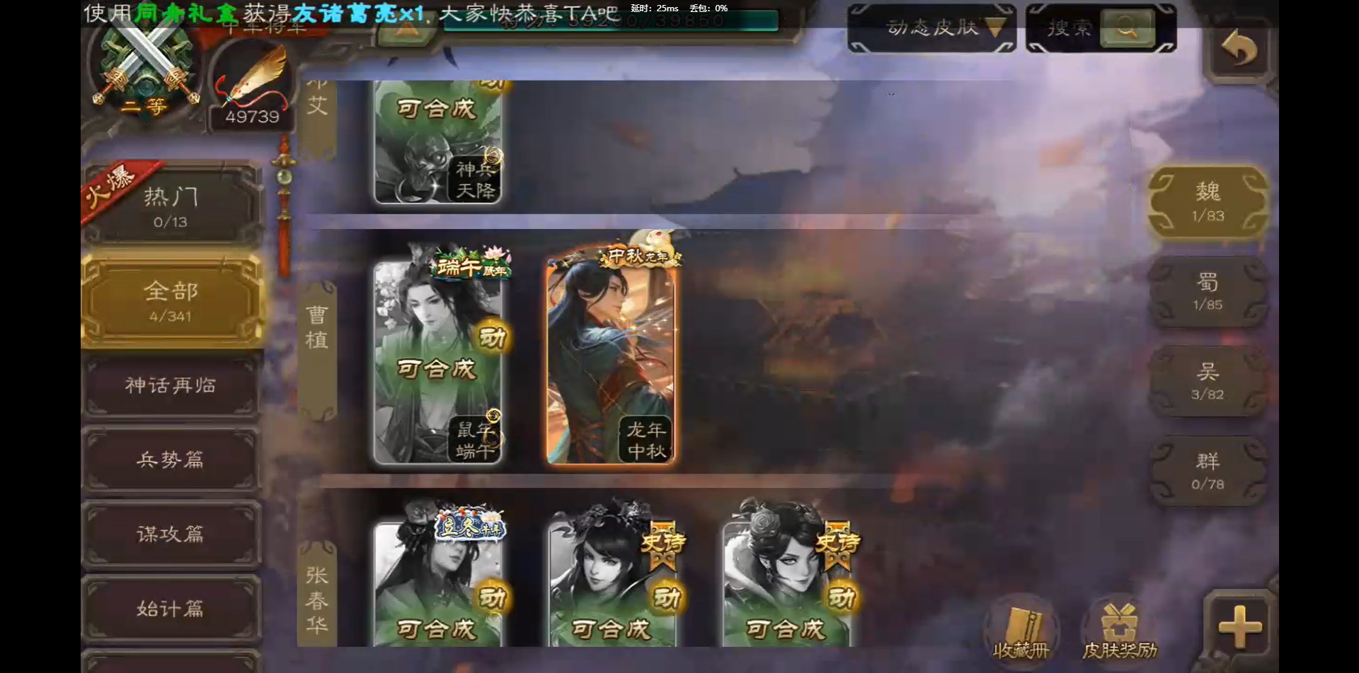 [14650101]vip4 中军将军 186武将 4动态皮肤 8史诗武将 【魏国武将】:程昱戏志才曹植曹冲甄姬司马懿许褚夏侯惇郭嘉曹仁曹操张辽 【蜀国武将】:谋马超谯周sp孙尚香 【吴国武将】:势太史慈吴景孙寒华 【群国武将】:麹义蔡夫人