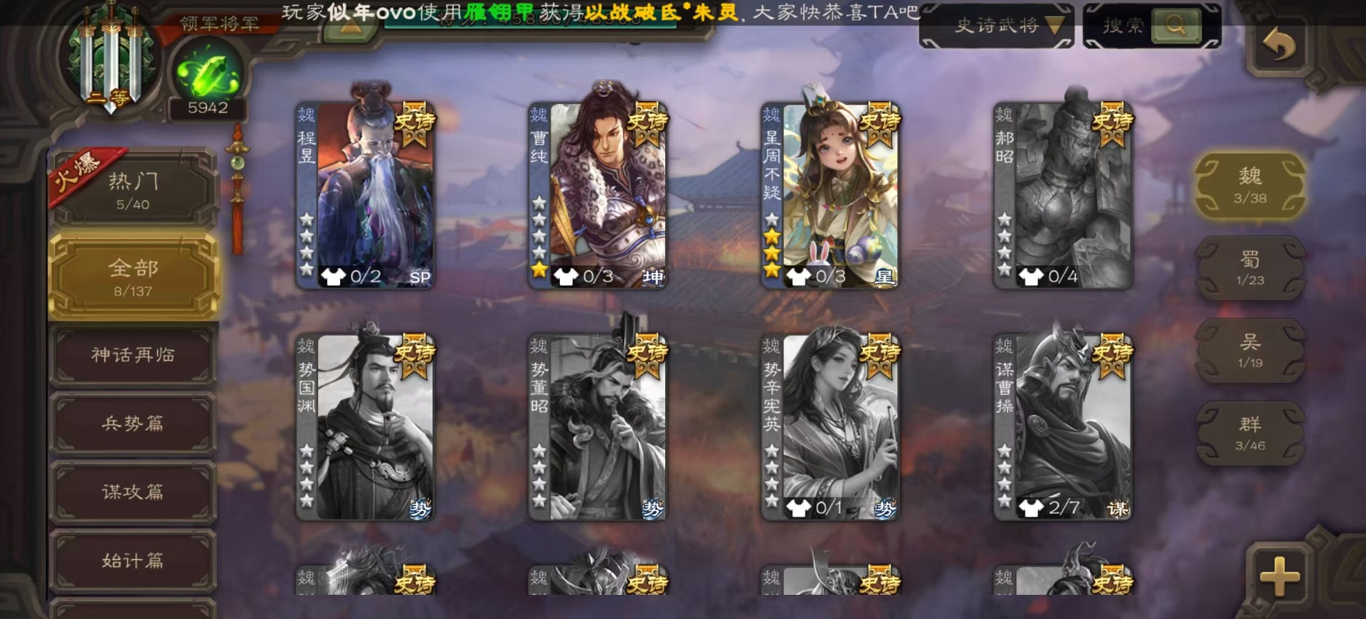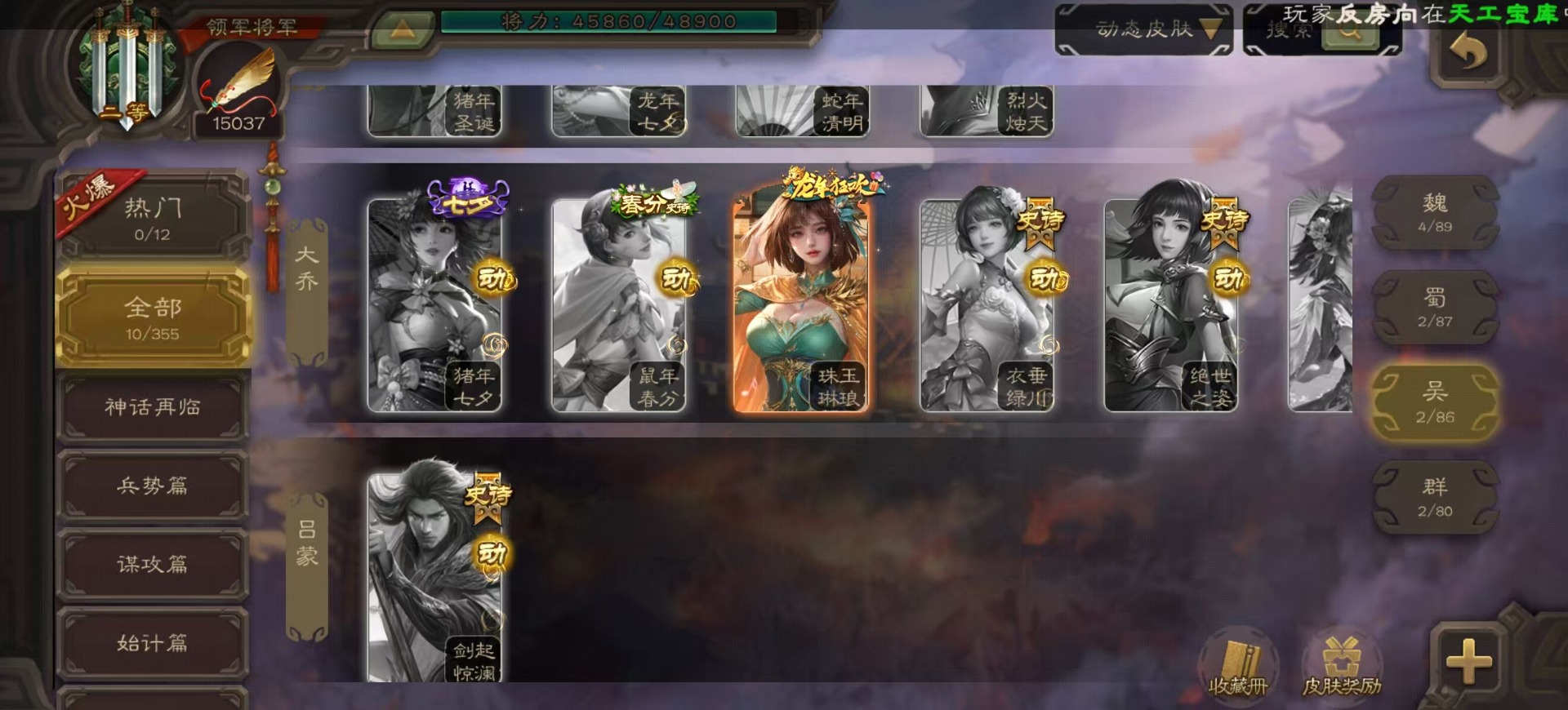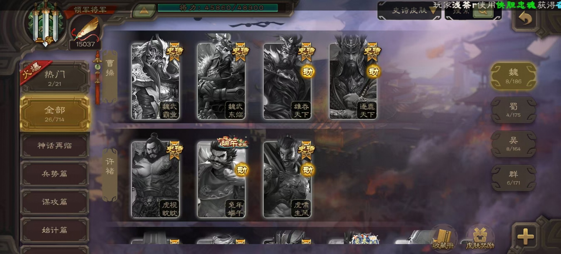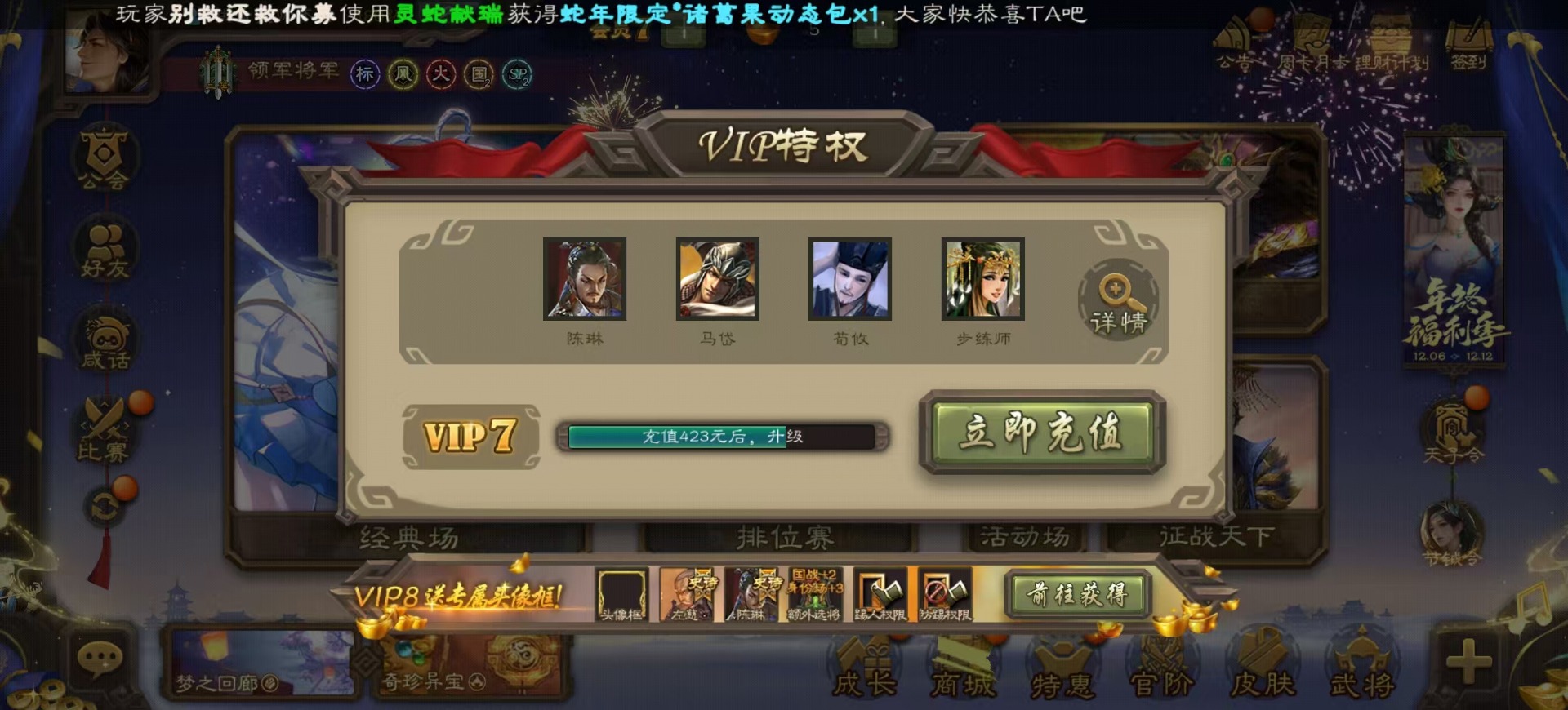 [14659199]vip7 领军将军 1武将 10动态皮肤 8史诗武将 【魏国武将】:星周不疑程昱曹纯 【蜀国武将】:沙摩柯 【吴国武将】:界徐盛 【群国武将】:左慈星黄忠杜预