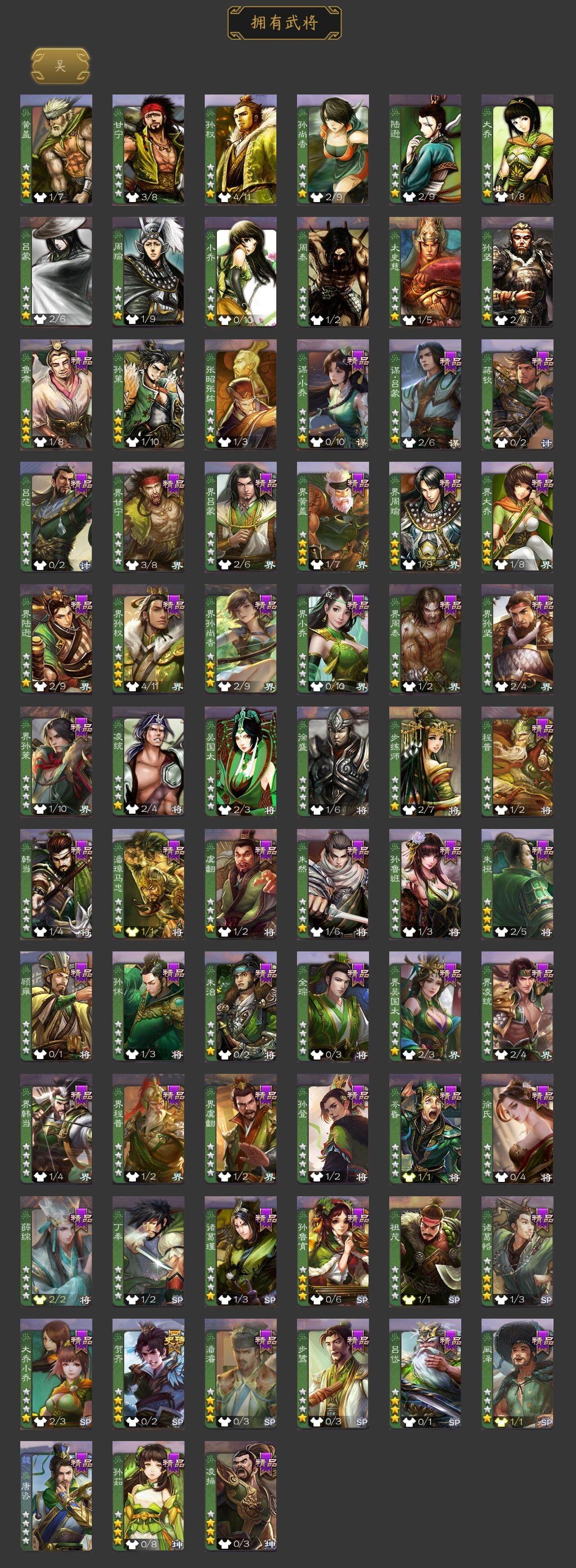 [14693470]【600】官阶:骠骑将军;vip等级:vip8;史诗武将数量:14;动态皮肤数量:7;武将总数:300;史诗宝珠数量:9;将魂数量:1652;神将:6;魏国史诗武将:0;蜀国史诗武将:0;吴国史诗武将:1;群史诗武将:6 神曹操神赵云神张辽神吕蒙神周瑜神诸葛亮杨修曹纯戏志才贺齐左慈郑玄审配沮授李傕许攸神曹操-玄天通冥动态马超-牛年春节动态黄月英-鼠年春节动态界马超-牛年春节动态界黄月英-鼠年春节动态周处-义除三害动态孙权-永开吴祚动态孙权-猪年端午动态界孙权-猪年端午动态孙鲁班-牛年端午动态兀突骨-鼠年春节动态