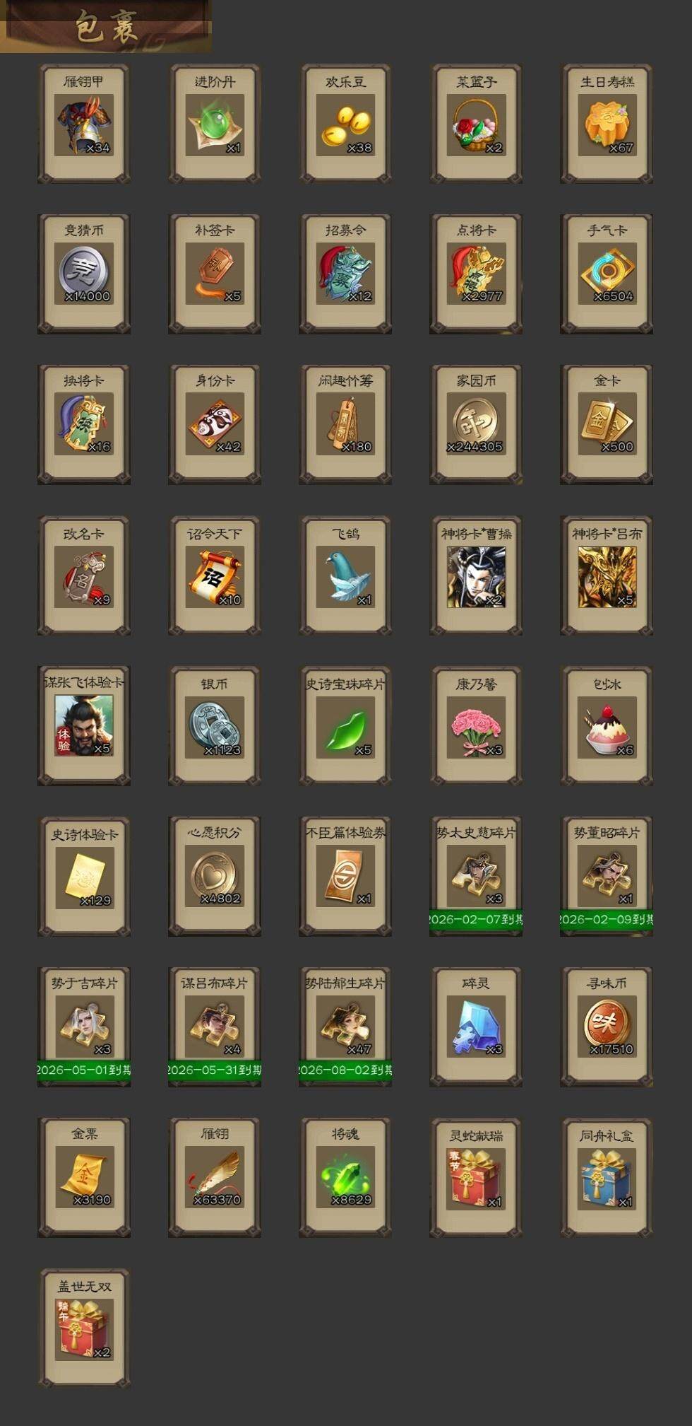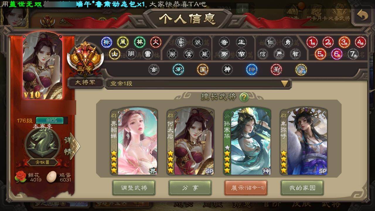 [14694777]【14】官阶:大将军;vip等级:vip10;史诗武将数量:42;动态皮肤数量:45;武将总数:360;史诗宝珠数量:0;将魂数量:8629;神将:9;魏国史诗武将:35;蜀国史诗武将:7;吴国史诗武将:5;群史诗武将:17 神赵云神陆逊神甘宁神郭嘉神太史慈神关羽神吕蒙神周瑜神诸葛亮星周不疑杨修文鸯王元姬界钟会曹婴曹纯戏志才马云騄谋赵云谋马超赵襄张星彩沙摩柯谯周吴景孙寒华留赞界朱然界徐盛左慈郑玄张让星黄忠麹义南华老仙祢衡沮授界左慈界李儒公孙康杜预卑弥呼谋张角张绣李傕许攸神郭嘉-虎年清明动态神太史慈-勇撼日月动态神甘宁-万人辟易动态神陆逊-绽焰摧枯动态神周瑜-焰腾麒麟动态神赵云-神龙天降星周不疑-才广志宏动态张昌蒲-龙年端午(动态)星周不疑-龙年清明动态曹叡-睥睨天下动态许褚-兔年端午动态王基-奇兵胜敌动态许褚-虎啸生风动态界许褚-虎啸生风动态王异-轻燕掠影动态界王异-轻燕掠影动态辛宪英-鼠年春节动态戏志才-举棋若定动态杨修-鼠年端午动态曹婴-锋芒毕露动态朱灵-以战破氐动态司马师-牛年中秋动态司马昭-昭威淮南(动态)张辽-龙生九子(动态)诸葛亮-龙年限定动态关羽-明良千古动态赵云-牛年春节动态诸葛亮-虎年中秋动态界赵云-牛年春节动态马云騄-明良千古动态小乔-兔年七夕动态孙策-兔年清明动态孙寒华-威灵尽显动态孙权-牛年七夕动态陆逊-猪年圣诞动态大乔-绝世之姿动态周瑜-鼠年春节动态界周瑜-鼠年春节动态界大乔-绝世之姿动态界陆逊-猪年圣诞动态界孙权-牛年七夕动态孙茹-烟水悠悠动态刘赞-灵魂歌王动态鲁肃-蛇年端午动态文鸯-势若万钧动态貂蝉-忧君难寐动态卑弥呼-呼风唤雨动态杜预-龙吟破竹动态貂蝉-绝世倾城动态左慈-役使鬼神动态界貂蝉-绝世倾城动态曹节-猪年大雪动态何太后-蛇蝎为心动态张鲁-虎年冬至动态sp赵云-威名尽显动态