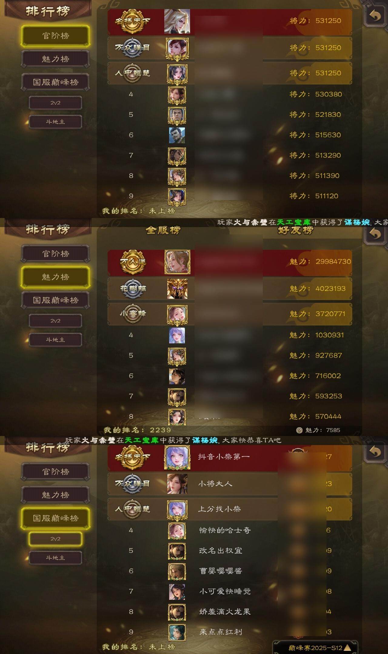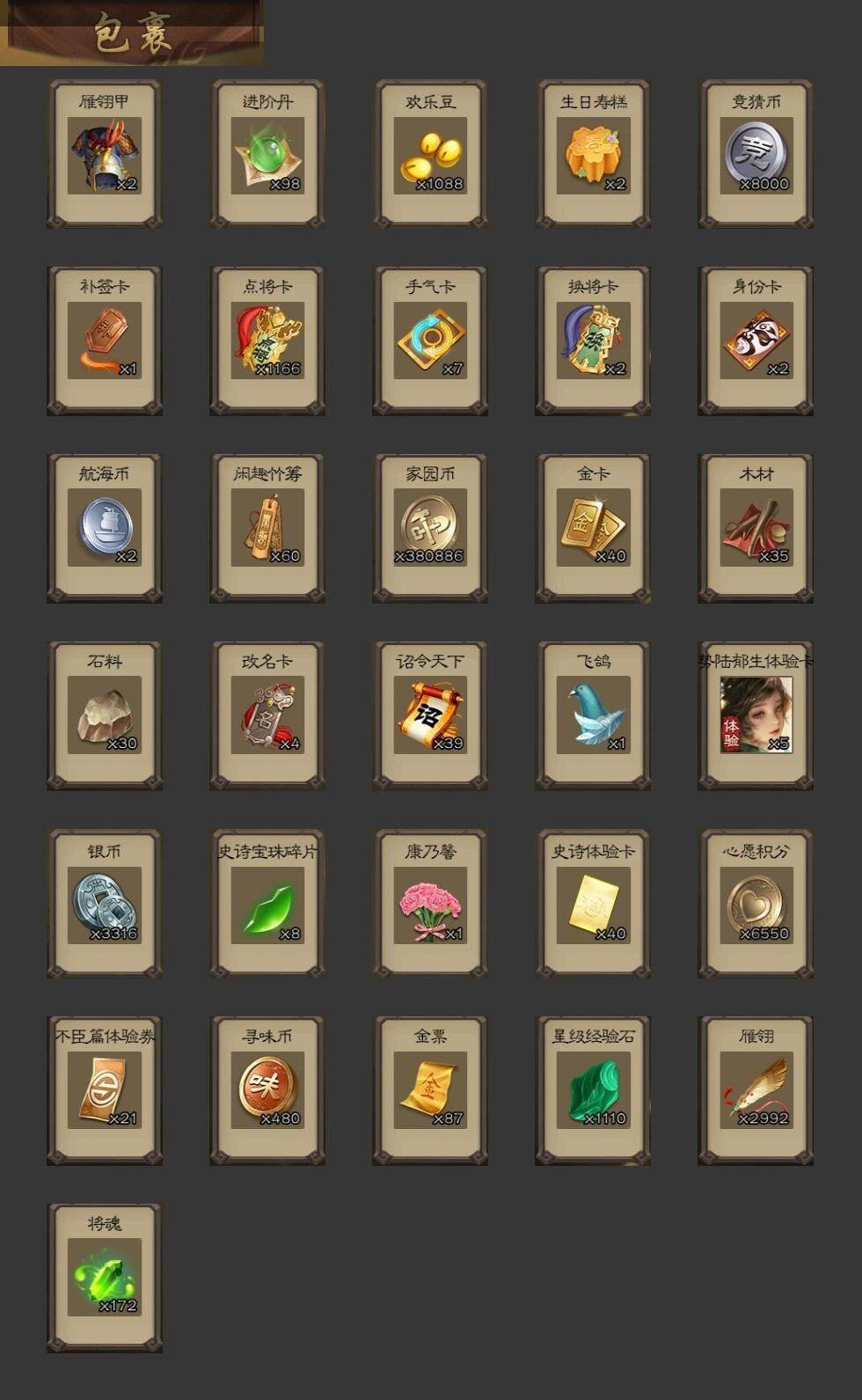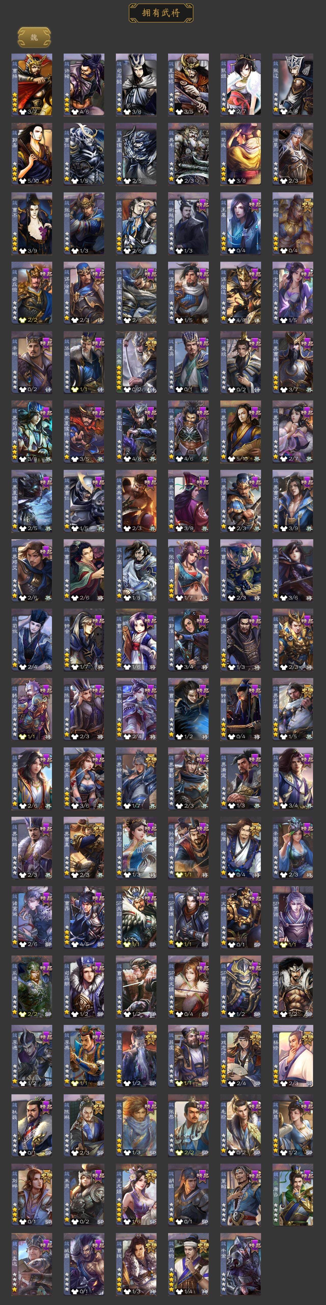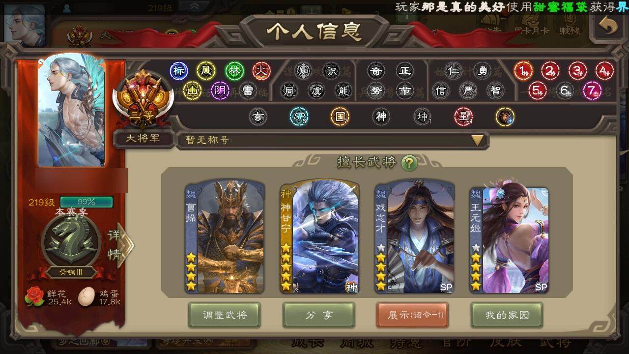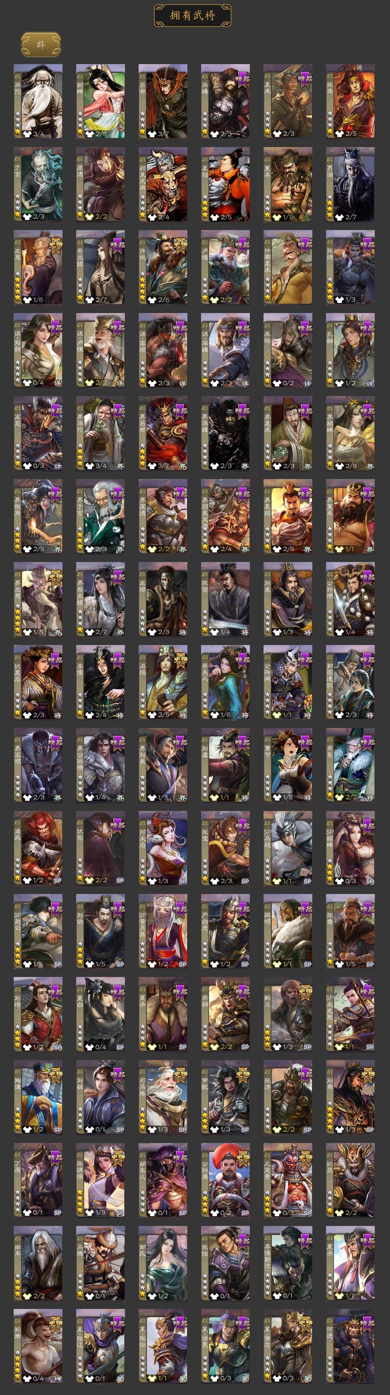 [14694855]【22】官阶:大将军;vip等级:vip9;史诗武将数量:47;动态皮肤数量:24;武将总数:398;史诗宝珠数量:0;将魂数量:172;神将:6;魏国史诗武将:18;蜀国史诗武将:11;吴国史诗武将:4;群史诗武将:14 神赵云神陆逊神甘宁神张辽神吕蒙神周瑜杨修文鸯王元姬马钧界钟会界于禁界曹真嵇康郝昭陈琳曹纯戏志才刘晔关索马云騄谋赵云谋马超周群赵襄张星彩王平谯周花鬘董允骆统界朱然界徐盛贺齐左慈张琪瑛星黄忠陶谦司马徽审配麹义祢衡刘焉沮授界左慈公孙康张绣许攸神郭嘉-虎年清明动态神甘宁-万人辟易动态神吕蒙-兼资文武动态神诸葛亮-观星唤雨许褚-兔年端午动态荀彧-驱虎吞狼动态曹丕-猪年端午动态邓艾-神兵天降动态界曹丕-猪年端午动态界邓艾-神兵天降动态辛宪英-鼠年春节动态程昱-泰山捧日动态戏志才-举棋若定动态曹纯-虎年春节动态诸葛亮-龙年限定动态刘备-明良千古动态马超-牛年春节动态张飞-明良千古动态赵云-截江救主动态黄月英-鼠年春节动态界刘备-明良千古动态界赵云-截江救主动态界马超-牛年春节动态界黄月英-鼠年春节动态赵襄-猪年春节动态诸葛果-蛇年限定动态孙权-牛年七夕动态大乔-鼠年春分动态界大乔-鼠年春分动态界孙权-牛年七夕动态凌统-长风破浪动态界凌统-长风破浪动态张角-黄天当立动态许攸-盛气凌人动态刘焉-雄踞益州动态星甘宁-肝胆相照动态