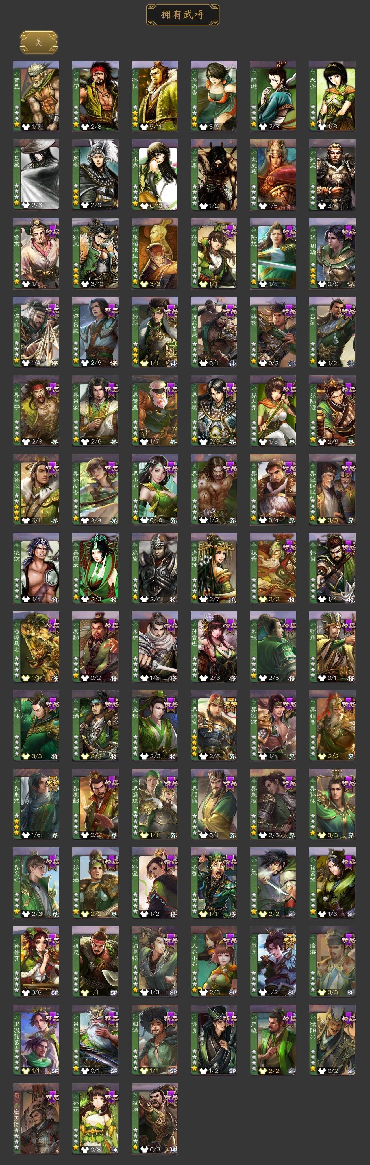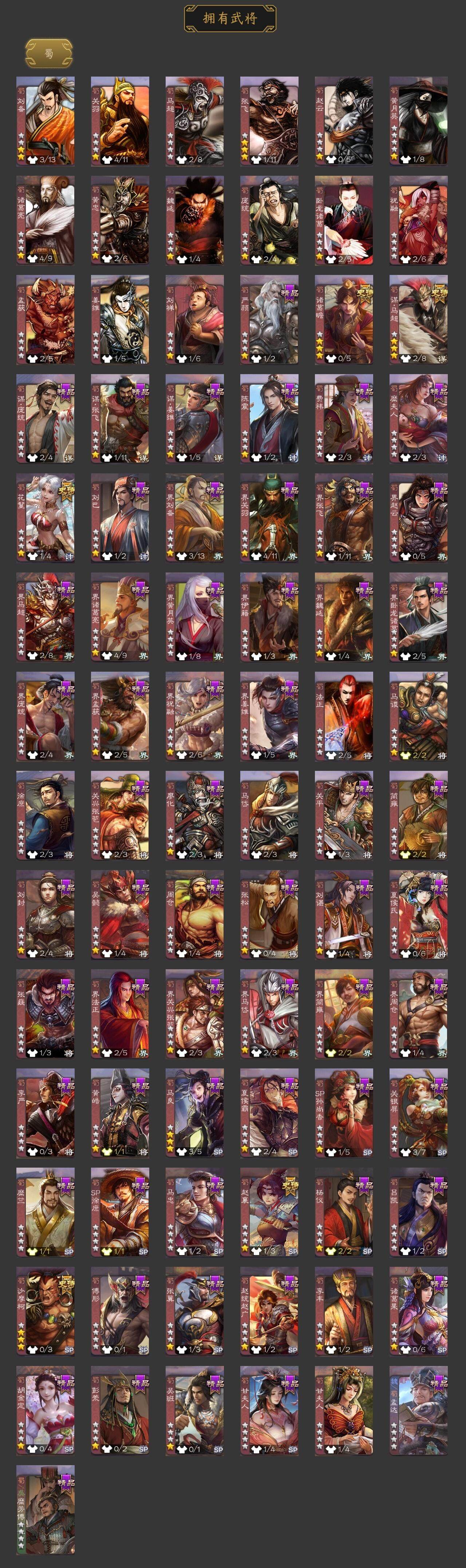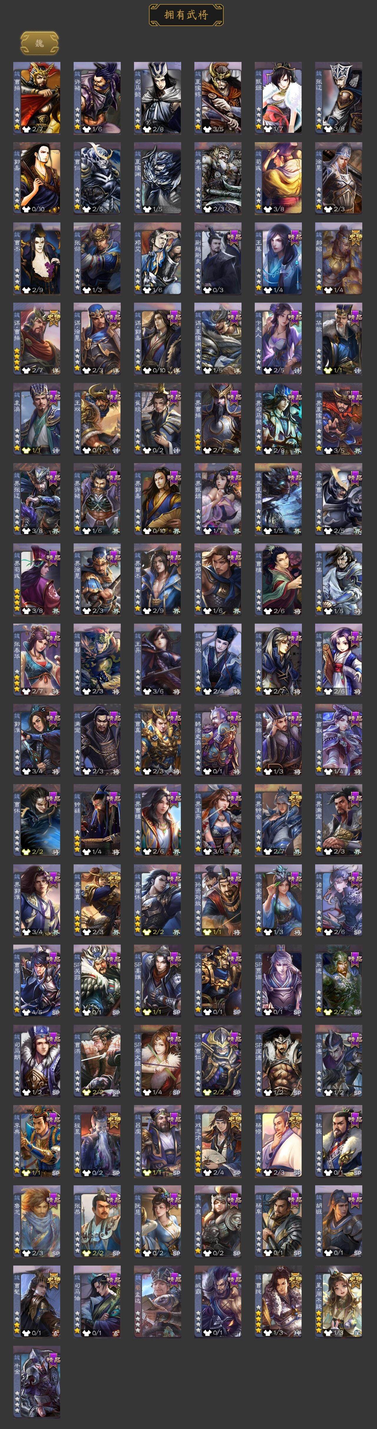 [14694870]【33】官阶:大将军;vip等级:vip9;史诗武将数量:27;动态皮肤数量:21;武将总数:354;史诗宝珠数量:9;将魂数量:3223;神将:6;魏国史诗武将:12;蜀国史诗武将:5;吴国史诗武将:3;群史诗武将:8 神赵云神荀彧神关羽神吕蒙神周瑜神诸葛亮曹髦星周不疑谋曹操杨修界钟会界曹真郝昭曹纯戏志才谋马超诸葛瞻赵襄沙摩柯花鬘界朱然界徐盛贺齐谋郭嘉谋貂蝉左慈星黄忠沮授公孙康谋张角李傕神荀彧-虎年清明动态神荀彧-匡汉延祚动态神刘备-龙兴海内神吕蒙-心生万象神关羽-佑子伐吴星周不疑-才广志宏动态sp蔡文姬-兔年冬日动态荀彧-驱虎吞狼动态王粲-笔翰如流动态张春华-雪中舞刃动态曹纯-虎年春节动态刘备-龙御天下动态卧龙诸葛-龙跃凤鸣动态关索-依心缱绻动态李丰-太仓聚粟动态周瑜-运筹帷幄动态孙权-永开吴祚动态孙策-虎踞江东动态孙权-牛年七夕动态孙尚香-兔年春节动态界孙权-牛年七夕动态袁绍-声震寰宇动态吕布-傲睨万物动态苏飞-肝胆相照动态