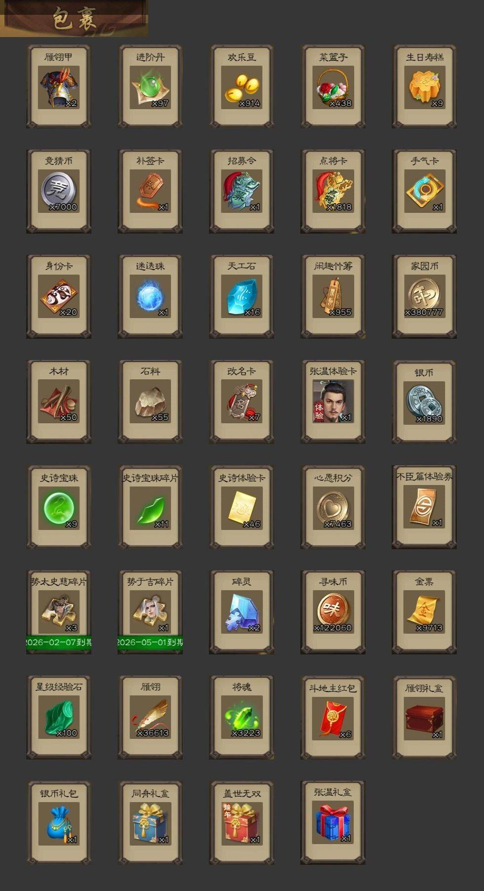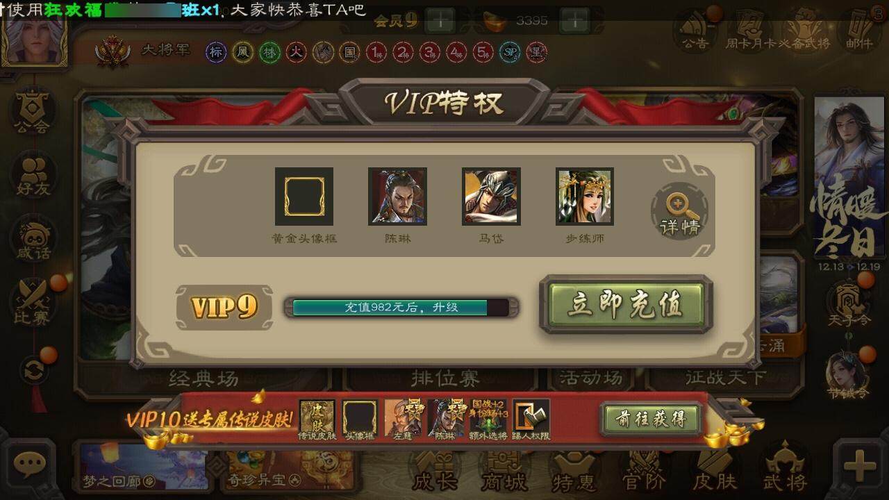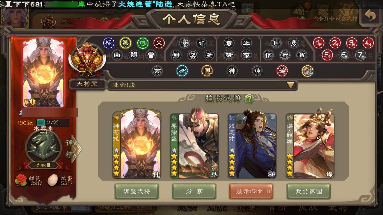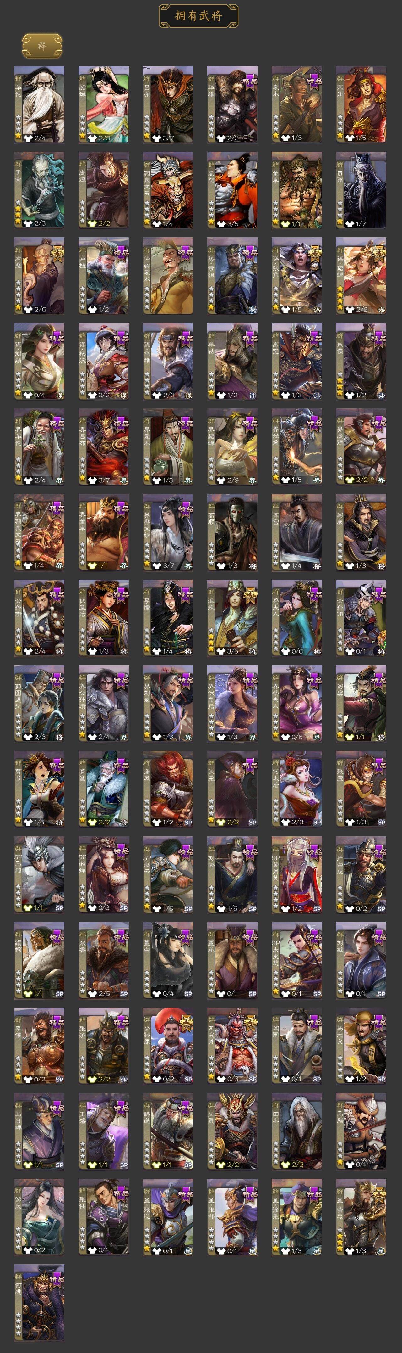 [14694870]【33】官阶:大将军;vip等级:vip9;史诗武将数量:27;动态皮肤数量:21;武将总数:354;史诗宝珠数量:9;将魂数量:3223;神将:6;魏国史诗武将:12;蜀国史诗武将:5;吴国史诗武将:3;群史诗武将:8 神赵云神荀彧神关羽神吕蒙神周瑜神诸葛亮曹髦星周不疑谋曹操杨修界钟会界曹真郝昭曹纯戏志才谋马超诸葛瞻赵襄沙摩柯花鬘界朱然界徐盛贺齐谋郭嘉谋貂蝉左慈星黄忠沮授公孙康谋张角李傕神荀彧-虎年清明动态神荀彧-匡汉延祚动态神刘备-龙兴海内神吕蒙-心生万象神关羽-佑子伐吴星周不疑-才广志宏动态sp蔡文姬-兔年冬日动态荀彧-驱虎吞狼动态王粲-笔翰如流动态张春华-雪中舞刃动态曹纯-虎年春节动态刘备-龙御天下动态卧龙诸葛-龙跃凤鸣动态关索-依心缱绻动态李丰-太仓聚粟动态周瑜-运筹帷幄动态孙权-永开吴祚动态孙策-虎踞江东动态孙权-牛年七夕动态孙尚香-兔年春节动态界孙权-牛年七夕动态袁绍-声震寰宇动态吕布-傲睨万物动态苏飞-肝胆相照动态