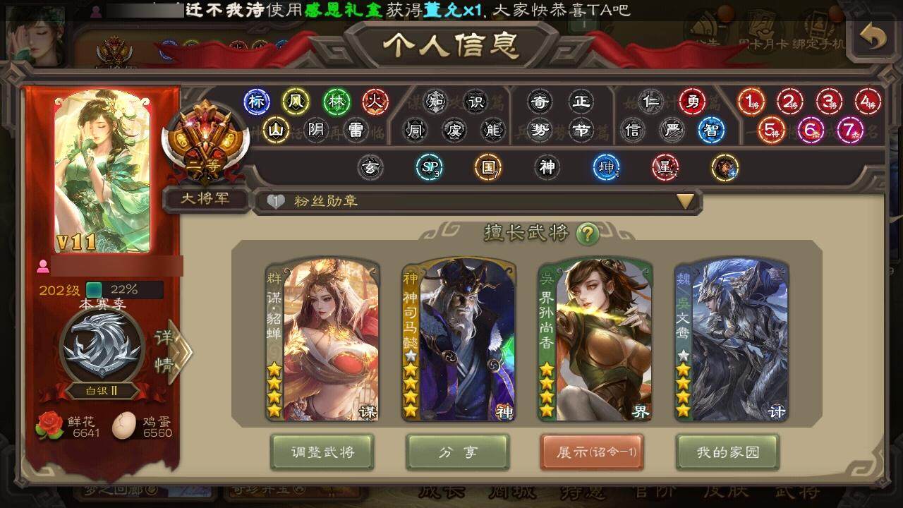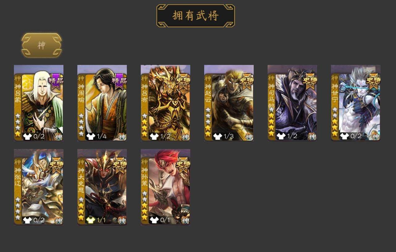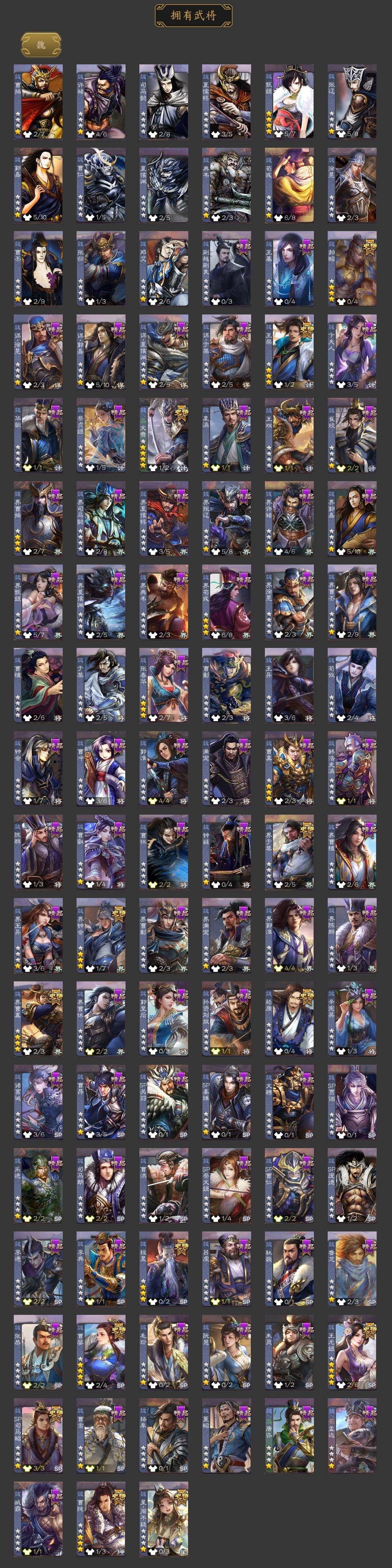 [14694923]【564】官阶:大将军;vip等级:vip11;史诗武将数量:52;动态皮肤数量:59;武将总数:412;史诗宝珠数量:0;将魂数量:643;神将:9;魏国史诗武将:38;蜀国史诗武将:9;吴国史诗武将:8;群史诗武将:17 神吕布神赵云神司马懿神甘宁神张辽神太史慈神孙策神吕蒙神周瑜sp司马昭星周不疑王粲文鸯王元姬界钟会界于禁界曹真嵇康郝昭曹婴曹纯谋赵云谋马超诸葛瞻周群张星彩沙摩柯谯周界黄忠花鬘谋黄盖周处吴景骆统留赞界徐盛界步练师势陆郁生谋郭嘉十常侍谋貂蝉裴秀左慈张让张琪瑛苏飞刘焉沮授界李儒杜预卑弥呼鲍信阎象许攸星董卓神郭嘉-虎年清明动态神太史慈-勇撼日月动态神曹操-天下归心神吕布-冠绝天下动态神赵云-战龙在野动态神司马懿-鉴往知来动态sp司马昭-鼠年冬至(动态)曹植-龙年中秋动态sp蔡文姬-兔年冬日动态许褚-兔年端午动态曹冲-五陵英少动态甄姬-洛水神韵动态荀彧-驱虎吞狼动态界甄姬-洛水神韵动态张春华-雪中舞刃动态曹真-虎年春节动态戏志才-举棋若定动态曹婴-兔年春节动态曹婴-锋芒毕露动态曹纯-虎年春节动态马钧-能工巧匠动态王元姬-鼠年冬至动态羊徽瑜-牛年中秋动态司马昭-昭威淮南(动态)清河公主-魅影萦心动态花鬘-依心缱绻动态刘备-龙御天下动态诸葛亮-龙年限定动态关羽-明良千古动态马超-虎年冬至动态黄忠-明良千古动态诸葛瞻-绵竹之殇动态sp孙尚香-明良千古动态张星彩-临军对阵动态鲍三娘-柳娇桃艳动态李丰-太仓聚粟动态马良-荡然由心动态孙权-兔年中秋动态孙权-永开吴祚动态孙策-虎踞江东动态周瑜-免年清明动态孙权-牛年七夕动态孙尚香-兔年春节动态孙尚香-星流霆击动态界孙权-牛年七夕动态界孙尚香-星流霆击动态徐盛-破军杀将动态步练师-牛年七夕动态界步练师-牛年七夕动态孙鲁育-猪年春节动态刘赞-灵魂歌王动态文鸯-势若万钧动态灵雎-霜刃绚练动态许攸-火烧乌巢动态