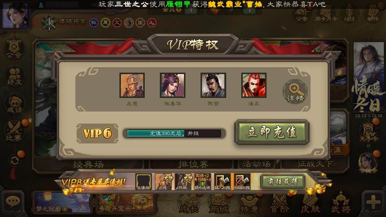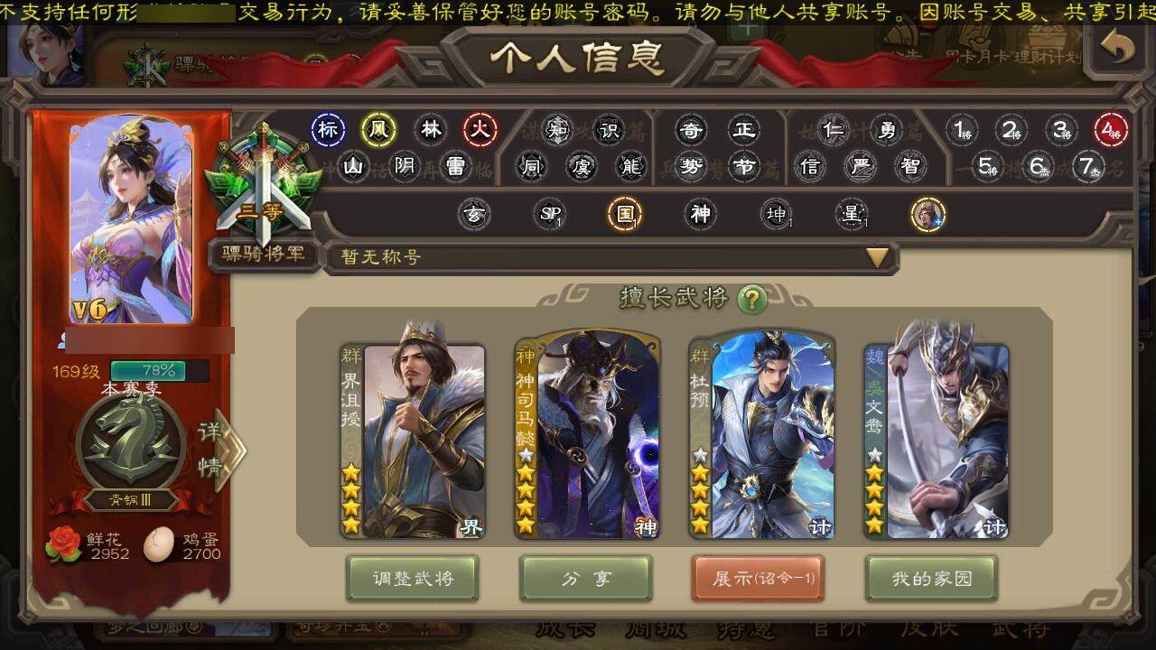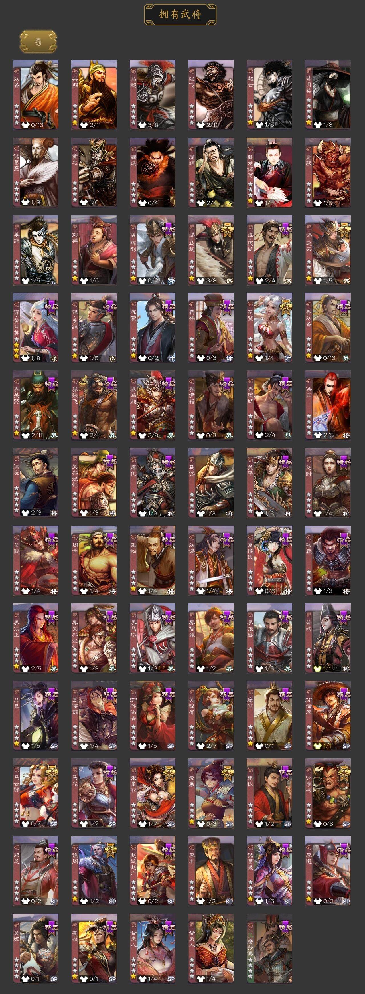 [14694947]【568】官阶:骠骑将军;vip等级:vip6;史诗武将数量:25;动态皮肤数量:9;武将总数:253;史诗宝珠数量:0;将魂数量:1747;神将:5;魏国史诗武将:4;蜀国史诗武将:8;吴国史诗武将:0;群史诗武将:10 神吕布神司马懿神吕蒙神周瑜神诸葛亮文鸯魏-司马昭界钟会郝昭曹纯戏志才马云騄谋赵云谋马超赵襄张星彩沙摩柯谯周花鬘谋黄月英界沮授左慈张让麹义沮授杜预张绣阎象星董卓神司马懿-鉴往知来动态曹植-龙年中秋动态司马昭-昭威淮南(动态)关银屏-兔年春节动态诸葛果-蛇年限定动态周处-义除三害动态麹义-扬刀立威动态杜预-龙吟破竹动态sp赵云-威名尽显动态