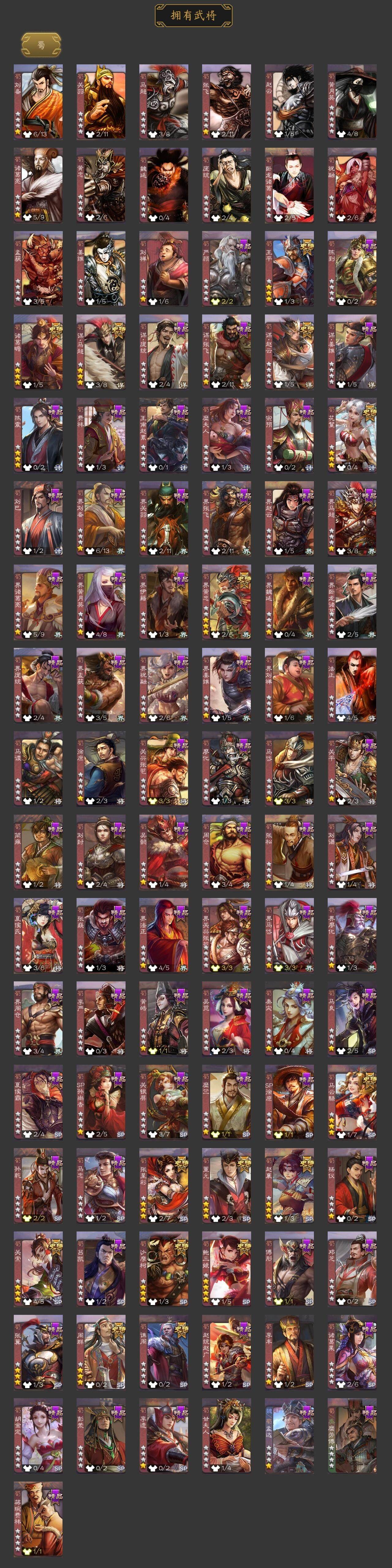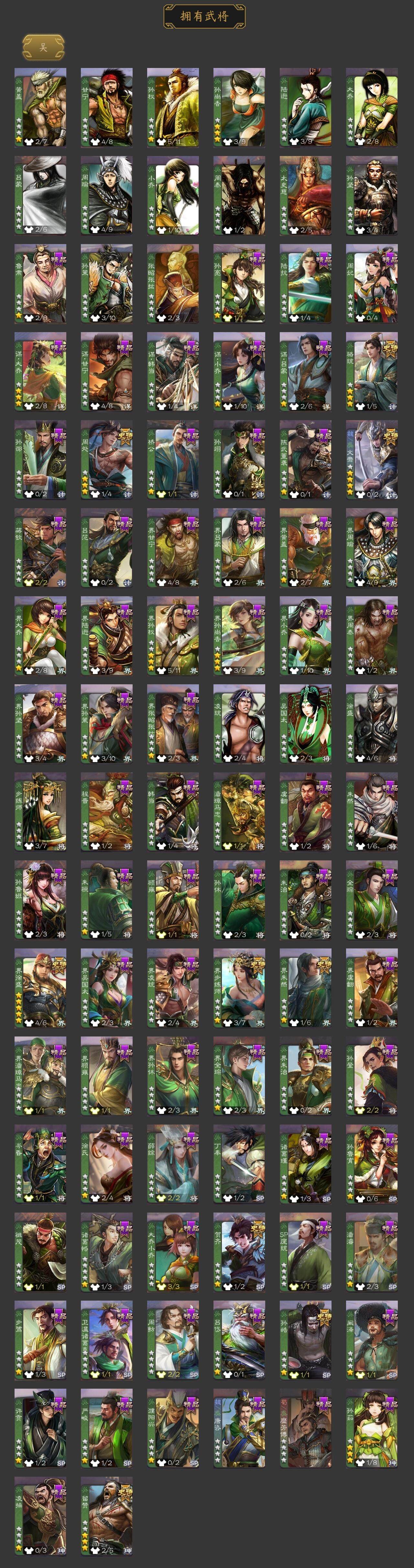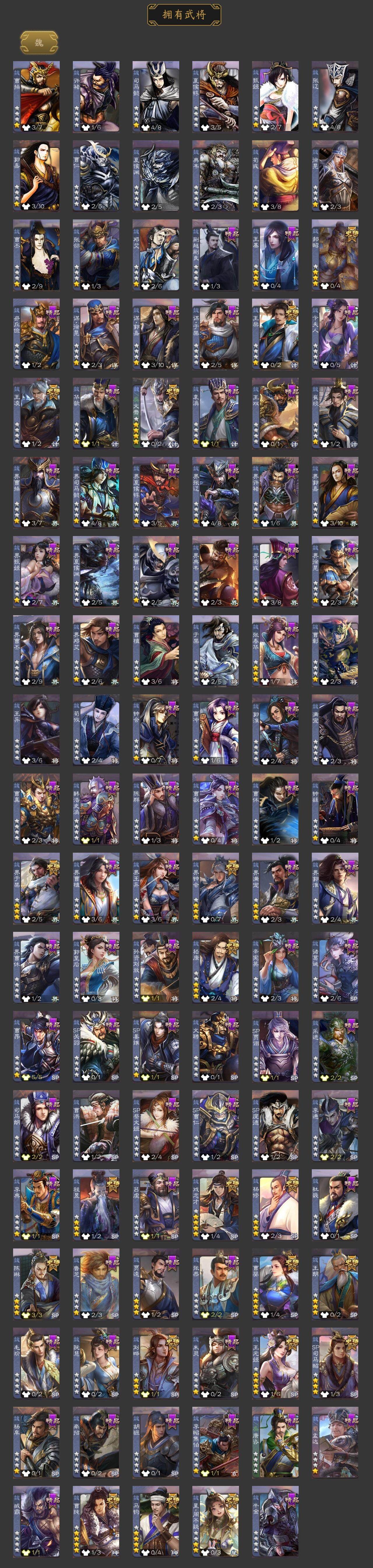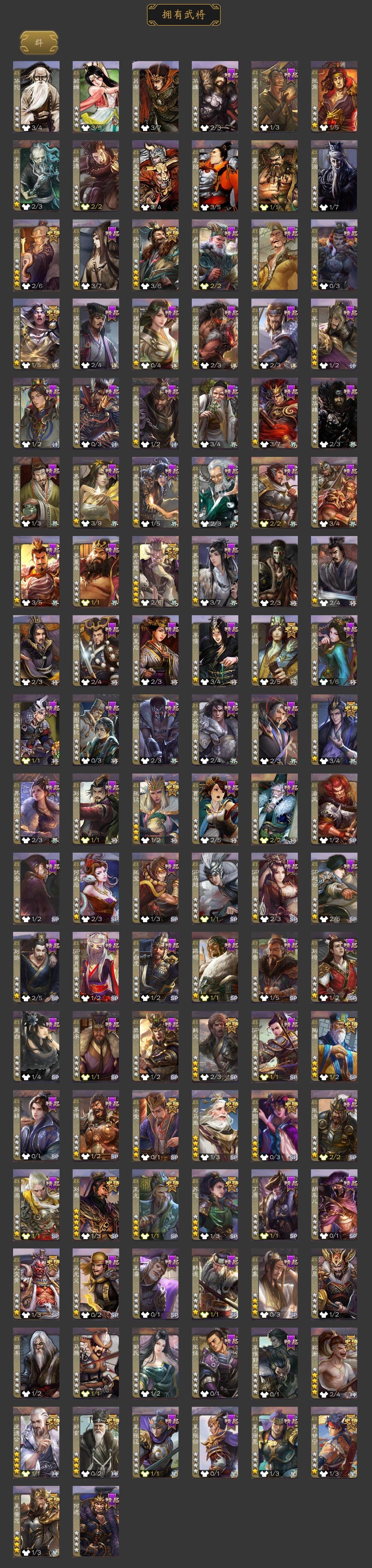 [14695070]【44】官阶:大将军;vip等级:vip13;史诗武将数量:70;动态皮肤数量:43;武将总数:434;史诗宝珠数量:5;将魂数量:7270;神将:10;魏国史诗武将:22;蜀国史诗武将:15;吴国史诗武将:8;群史诗武将:23 神吕布神赵云神陆逊神刘备神甘宁神张辽神太史慈神吕蒙神周瑜神诸葛亮sp司马昭星周不疑王粲杨修文鸯王元姬王凌王朗马钧界钟会界于禁嵇康郝昭陈琳曹婴曹纯戏志才刘晔关索马云騄谋赵云谋马超诸葛瞻周群赵襄张星彩王平沙摩柯谯周界黄忠花鬘董允鲍三娘周处孙皓骆统留赞界朱然界徐盛界步练师贺齐谋郭嘉左慈郑玄张让星黄忠星甘宁王允陶谦苏飞司马徽麹义庞德公祢衡刘焉沮授界左慈界李儒卑弥呼谋张角张绣李傕阎象许攸神甘宁-万人辟易动态神陆逊-绽焰摧枯动态神吕蒙-兼资文武动态神诸葛亮-观星唤雨神吕布-监兵噬魅动态曹丕-气荡山河(动态)甄姬-明珠耀躯(动态)sp蔡文姬-兔年冬日动态邓艾-神兵天降动态界邓艾-神兵天降动态界曹植-鼠年端午动态辛宪英-鼠年春节动态曹昂-竭战麟伤动态程昱-泰山捧日动态曹婴-锋芒毕露动态曹纯-长坂败备动态王元姬-鼠年冬至动态刘备-龙御天下动态诸葛亮-龙年限定动态关索-依心缱绻动态刘备-龙骧麟振动态马超-牛年春节动态张飞-猪年中秋动态黄月英-鼠年春节动态界刘备-龙骧麟振动态界张飞-猪年中秋动态界马超-牛年春节动态界黄月英-鼠年春节动态夏侯氏-猪年中秋动态关银屏-鼠年中秋动态张星彩-猪年中秋动态关索-鼠年中秋动态鲍三娘-虎年七夕动态诸葛果-虎年中秋动态小乔-兔年七夕动态周处-义除三害动态孙权-永开吴祚动态孙策-虎踞江东动态孙权-吴王六剑动态孙尚香-星流霆击动态大乔-鼠年春分动态周瑜-鼠年春节动态界周瑜-鼠年春节动态界大乔-鼠年春分动态界孙权-吴王六剑动态界孙尚香-星流霆击动态徐盛-破军杀将动态孙茹-花容月貌动态刘赞-灵魂歌王动态袁绍-声震