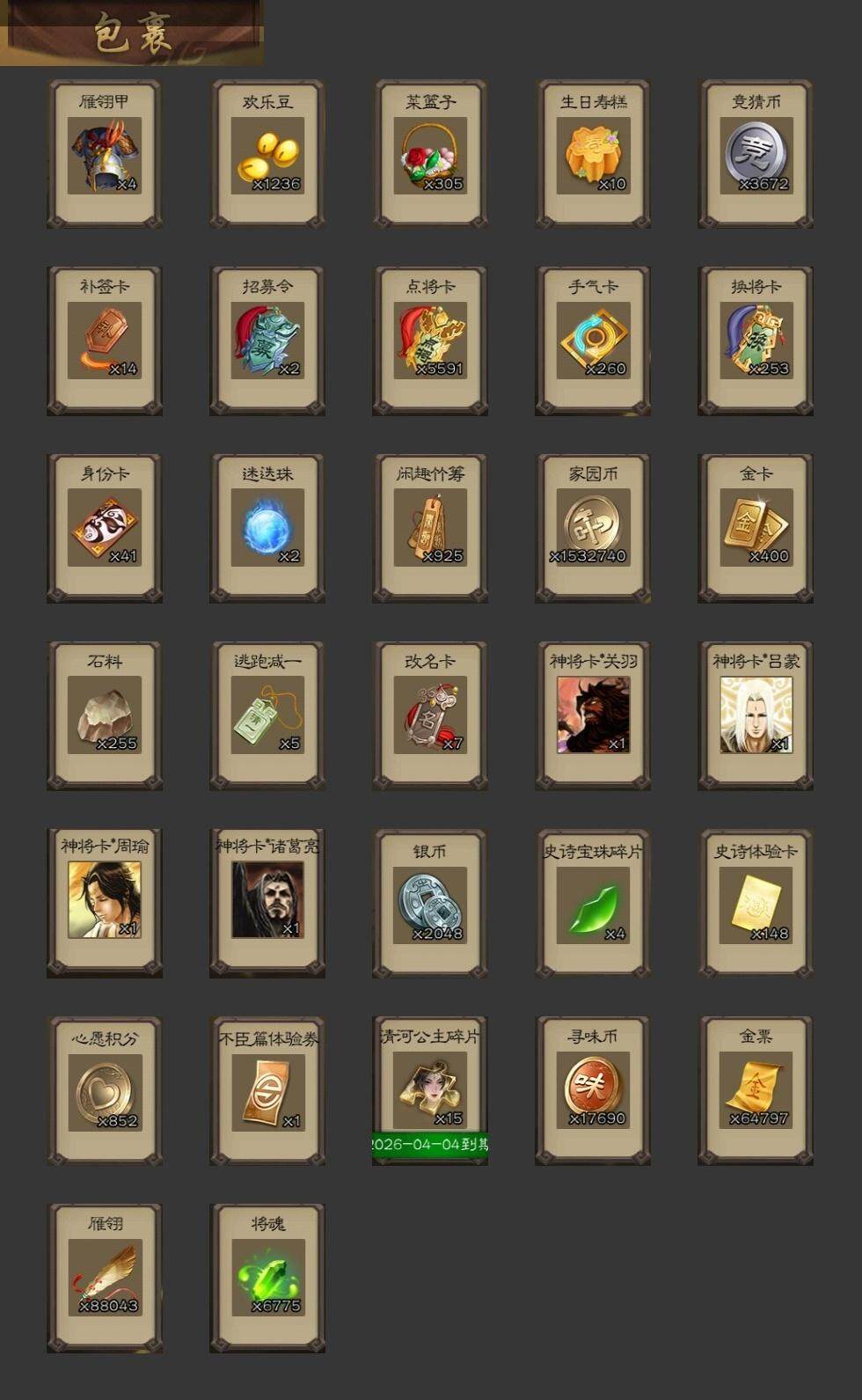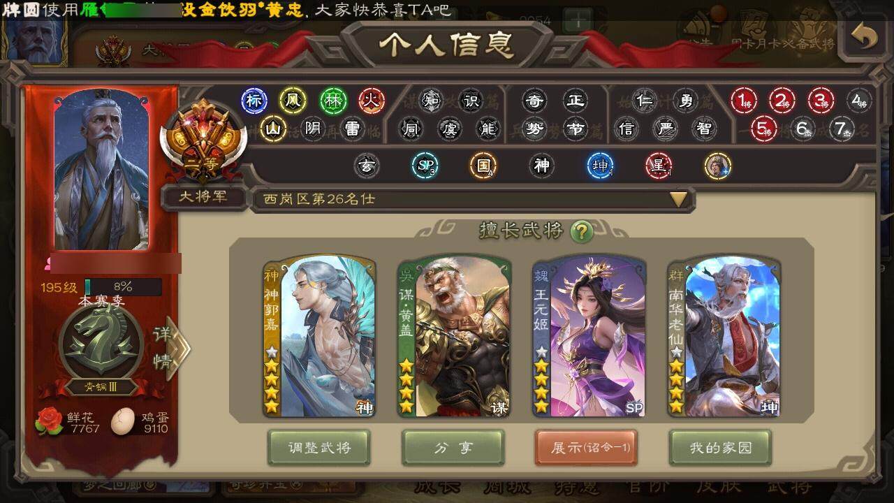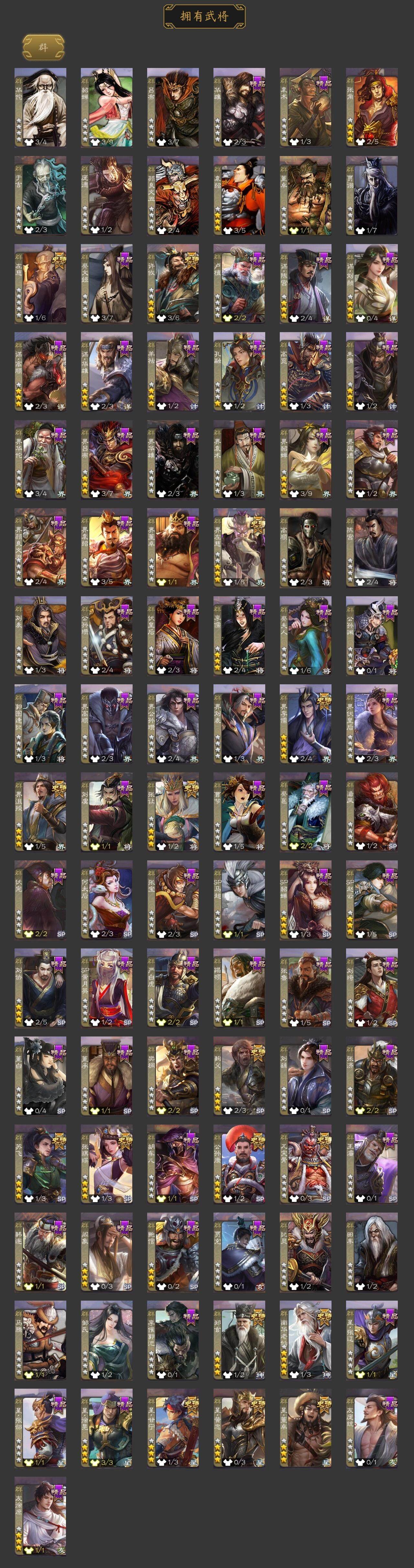 [14695159]【57】官阶:大将军;vip等级:vip8;史诗武将数量:46;动态皮肤数量:44;武将总数:367;史诗宝珠数量:0;将魂数量:6775;神将:6;魏国史诗武将:30;蜀国史诗武将:9;吴国史诗武将:6;群史诗武将:18 神吕布神赵云神陆逊神刘备神张辽神郭嘉星周不疑杨修王元姬界钟会郝昭曹婴曹纯戏志才谋赵云诸葛瞻赵襄张星彩沙摩柯谯周傅佥花鬘董允谋黄盖周处留赞界朱然界徐盛界步练师界沮授左慈郑玄张让张琪瑛星黄忠星甘宁苏飞麹义南华老仙界左慈界李儒公孙康鲍信阎象许攸友徐庶星董卓神鲁肃-九州为局神郭嘉-虎年清明动态神周瑜-波澜不惊神甘宁-万人辟易动态神赵云-战龙在野动态王元姬-婆娑起舞(动态)星周不疑-才广志宏动态曹丕-气荡山河(动态)星周不疑-龙年清明动态甄姬-明珠耀躯(动态)sp蔡文姬-兔年冬日动态张春华-雪中舞刃动态钟会-谋谟之勋动态界钟会-谋谟之勋动态曹昂-竭战麟伤动态王朗-龙袭星落动态王元姬-鼠年冬至动态司马昭-昭威淮南(动态)星徐晃-斧引霹雳动态清河公主-魅影萦心动态刘备-龙御天下动态诸葛亮-龙年限定动态卧龙诸葛-龙跃凤鸣动态关羽-明良千古动态关银屏-兔年春节动态周处-义除三害动态吕蒙-剑起惊澜动态陆逊-龙年七夕动态孙权-永开吴祚动态孙策-虎踞江东动态黄盖-鏖战赤壁动态孙权-牛年七夕动态大乔-猪年七夕动态孙策-猪年七夕动态界黄盖-鏖战赤壁动态界大乔-猪年七夕动态界孙权-牛年七夕动态徐盛-破军杀将动态步练师-牛年七夕动态界步练师-牛年七夕动态刘赞-灵魂歌王动态孙寒华-蛇年限定动态袁绍-声震寰宇动态麹义-扬刀立威动态貂蝉-鼠年七夕动态吕布-鼠年七夕动态张角-黄天当立动态许攸-盛气凌人动态界吕布-鼠年七夕动态界貂蝉-鼠年七夕动态李儒-鸠杀少帝动态界李儒-鸠杀少帝动态张琪瑛-虎年冬至动态南华老仙-野鹤闲云动态陶谦-安民护祚动态左慈-蛇年限定动态
