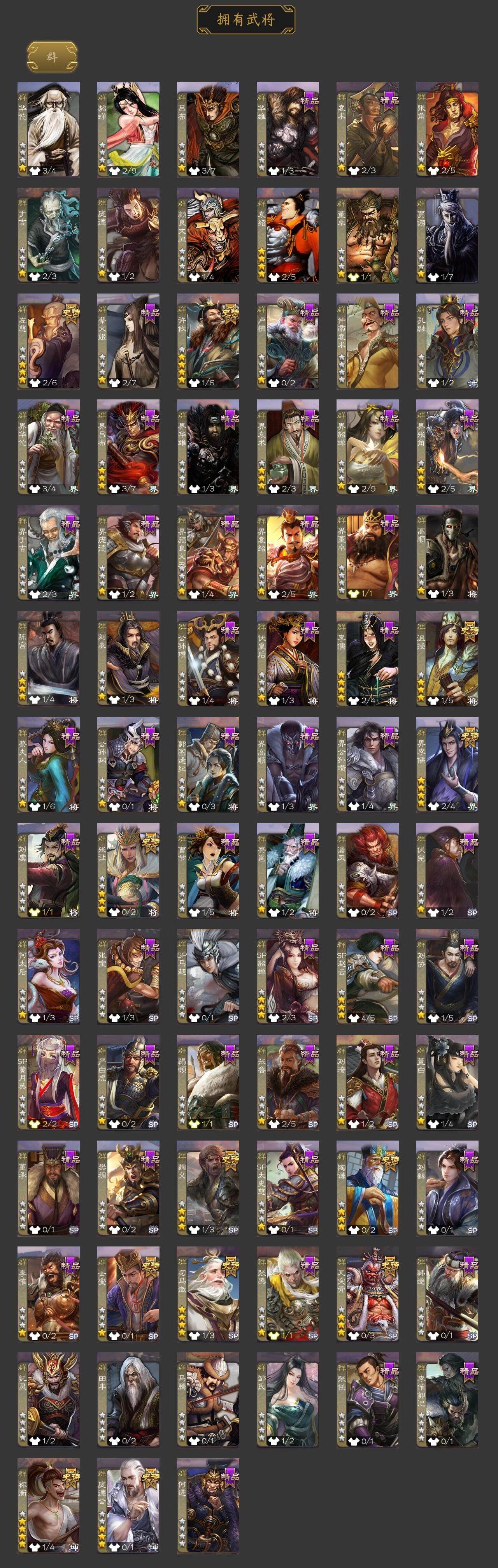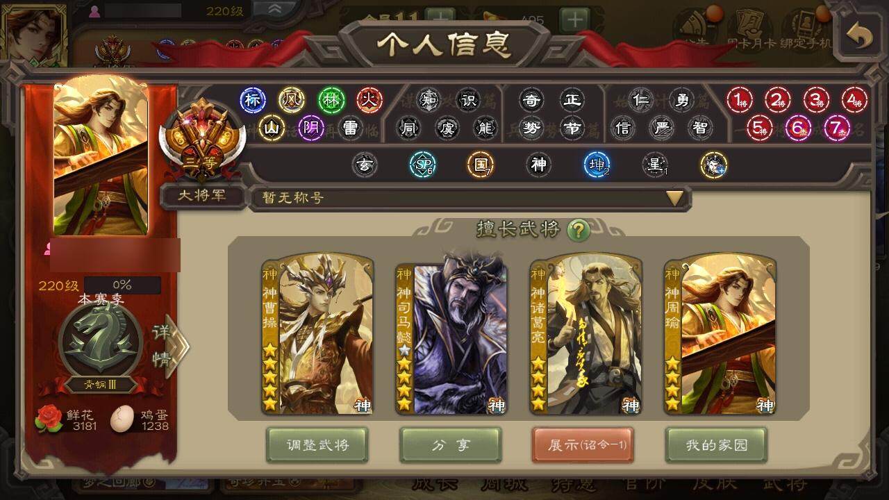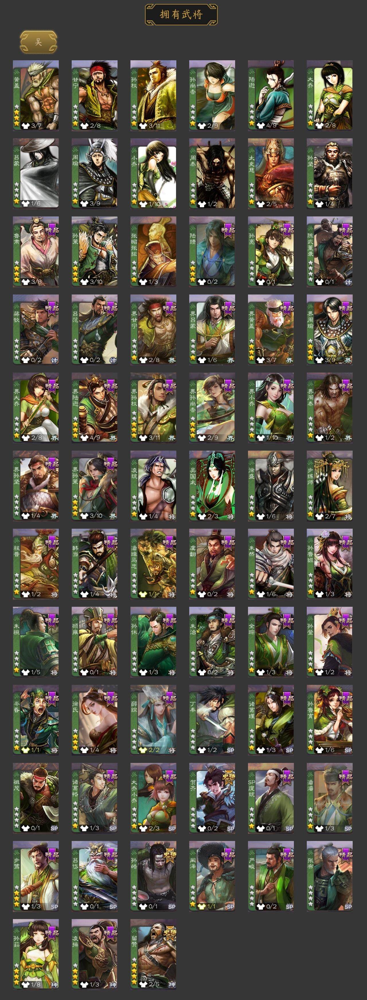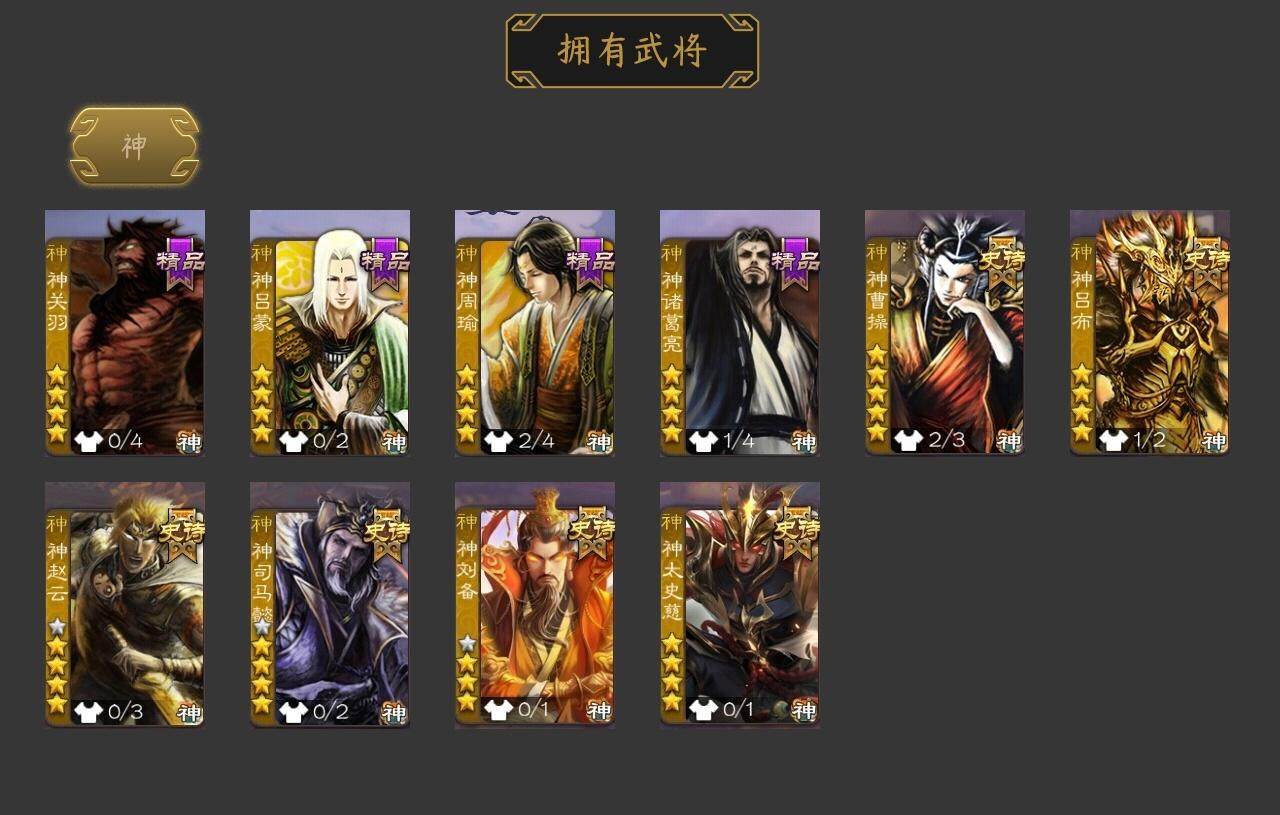 [14695316]【624】官阶:大将军;vip等级:vip11;史诗武将数量:36;动态皮肤数量:27;武将总数:320;史诗宝珠数量:0;将魂数量:3658;神将:10;魏国史诗武将:20;蜀国史诗武将:8;吴国史诗武将:3;群史诗武将:11 神曹操神吕布神赵云神司马懿神刘备神太史慈神关羽神吕蒙神周瑜神诸葛亮杨修嵇康陈琳曹纯戏志才刘晔关索马云騄赵襄张星彩王平沙摩柯界黄忠董允孙皓留赞贺齐左慈张让陶谦司马徽麹义庞德公祢衡沮授界李儒李傕许攸神周瑜-陵光引灵动态神诸葛亮-孟章诛邪动态神曹操-天下归心神曹操-玄天通冥动态神吕布-监兵噬魅动态sp蔡文姬-兔年冬日动态曹丕-猪年端午动态邓艾-神兵天降动态界曹丕-猪年端午动态界邓艾-神兵天降动态王异-轻燕掠影动态钟会-谋谟之勋动态钟繇-稳定关右动态界王异-轻燕掠影动态程昱-泰山捧日动态刘备-猪年圣诞动态马超-西凉雄狮动态魏延-麒麟生角动态界刘备-猪年圣诞动态界马超-西凉雄狮动态界魏延-麒麟生角动态夏侯氏-猪年中秋动态sp孙尚香-猪年圣诞动态陆逊-猪年圣诞动态大乔-绝世之姿动态孙策-猪年七夕动态孙策-长沙桓王动态鲁肃-联刘抗曹动态界大乔-绝世之姿动态界陆逊-猪年圣诞动态界孙策-猪年七夕动态界孙策-长沙恒王动态孙鲁育-猪年春节动态孙茹-花容月貌动态凌操-破贼校尉动态刘赞-抗音而歌动态张角-迅雷风烈动态界张角-迅雷风烈动态sp貂蝉-驭魂千机动态sp赵云-单骑救主动态董白-猪年春节动态祢衡-击鼓骂曹动态