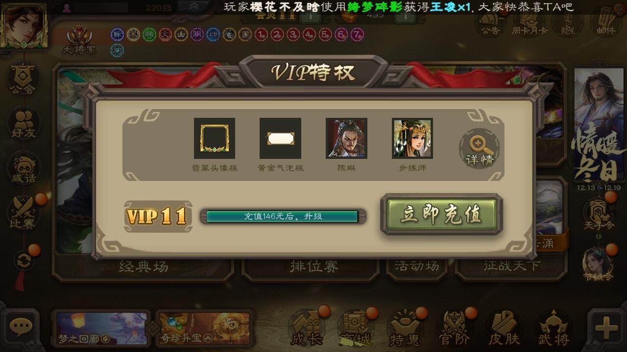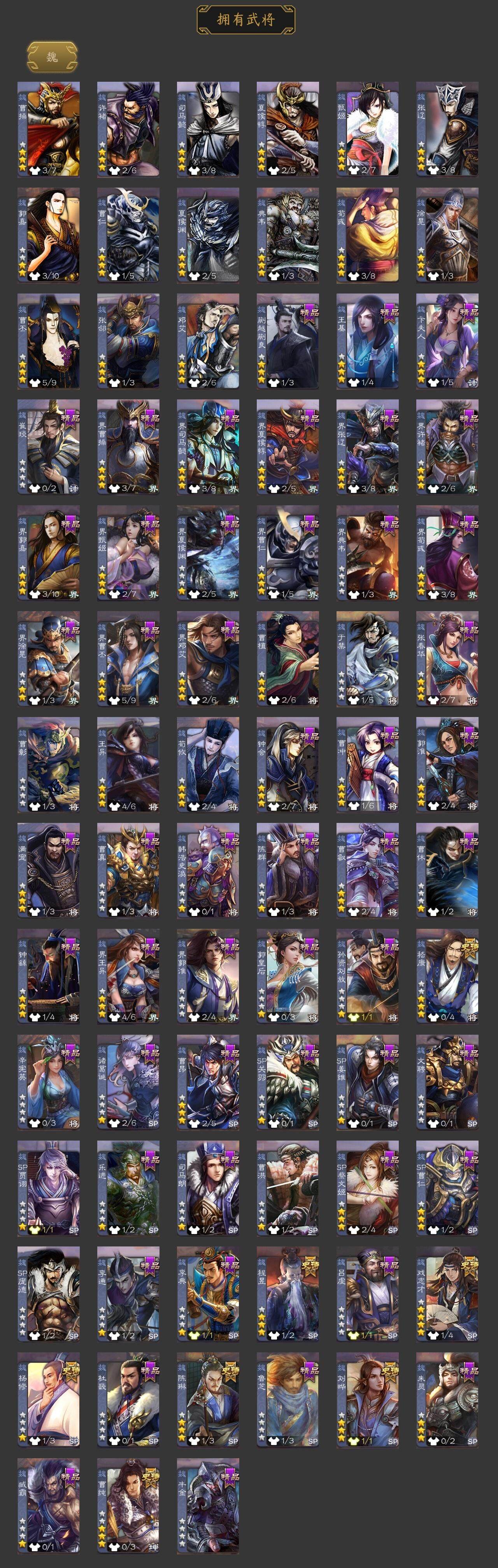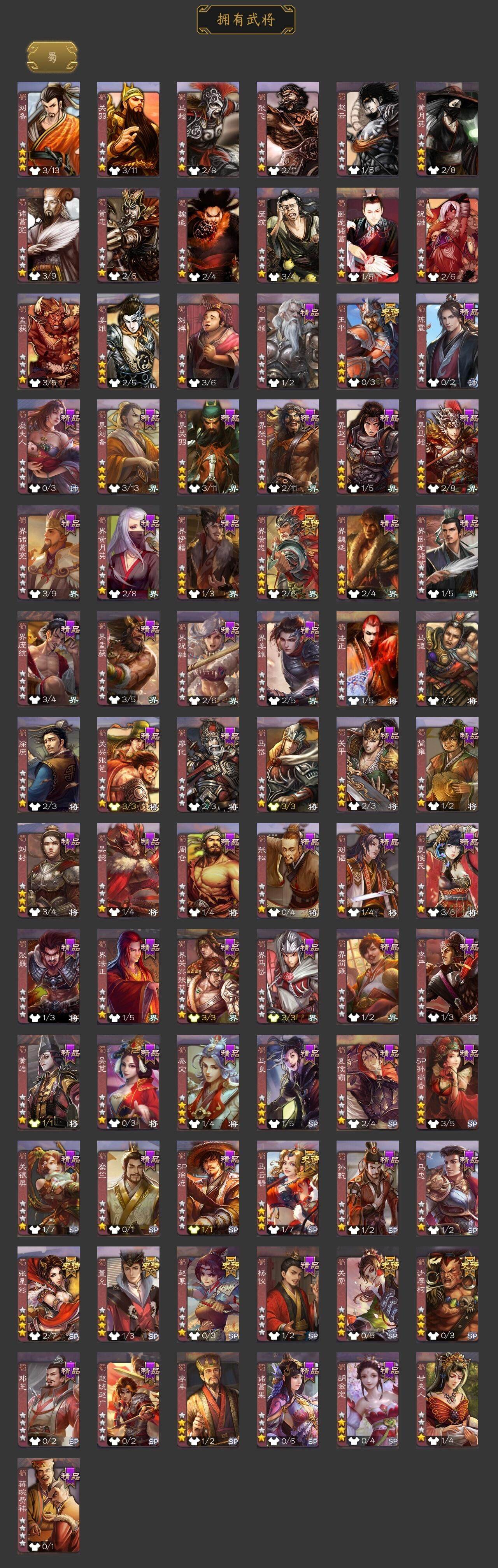 [14695316]【624】官阶:大将军;vip等级:vip11;史诗武将数量:36;动态皮肤数量:27;武将总数:320;史诗宝珠数量:0;将魂数量:3658;神将:10;魏国史诗武将:20;蜀国史诗武将:8;吴国史诗武将:3;群史诗武将:11 神曹操神吕布神赵云神司马懿神刘备神太史慈神关羽神吕蒙神周瑜神诸葛亮杨修嵇康陈琳曹纯戏志才刘晔关索马云騄赵襄张星彩王平沙摩柯界黄忠董允孙皓留赞贺齐左慈张让陶谦司马徽麹义庞德公祢衡沮授界李儒李傕许攸神周瑜-陵光引灵动态神诸葛亮-孟章诛邪动态神曹操-天下归心神曹操-玄天通冥动态神吕布-监兵噬魅动态sp蔡文姬-兔年冬日动态曹丕-猪年端午动态邓艾-神兵天降动态界曹丕-猪年端午动态界邓艾-神兵天降动态王异-轻燕掠影动态钟会-谋谟之勋动态钟繇-稳定关右动态界王异-轻燕掠影动态程昱-泰山捧日动态刘备-猪年圣诞动态马超-西凉雄狮动态魏延-麒麟生角动态界刘备-猪年圣诞动态界马超-西凉雄狮动态界魏延-麒麟生角动态夏侯氏-猪年中秋动态sp孙尚香-猪年圣诞动态陆逊-猪年圣诞动态大乔-绝世之姿动态孙策-猪年七夕动态孙策-长沙桓王动态鲁肃-联刘抗曹动态界大乔-绝世之姿动态界陆逊-猪年圣诞动态界孙策-猪年七夕动态界孙策-长沙恒王动态孙鲁育-猪年春节动态孙茹-花容月貌动态凌操-破贼校尉动态刘赞-抗音而歌动态张角-迅雷风烈动态界张角-迅雷风烈动态sp貂蝉-驭魂千机动态sp赵云-单骑救主动态董白-猪年春节动态祢衡-击鼓骂曹动态