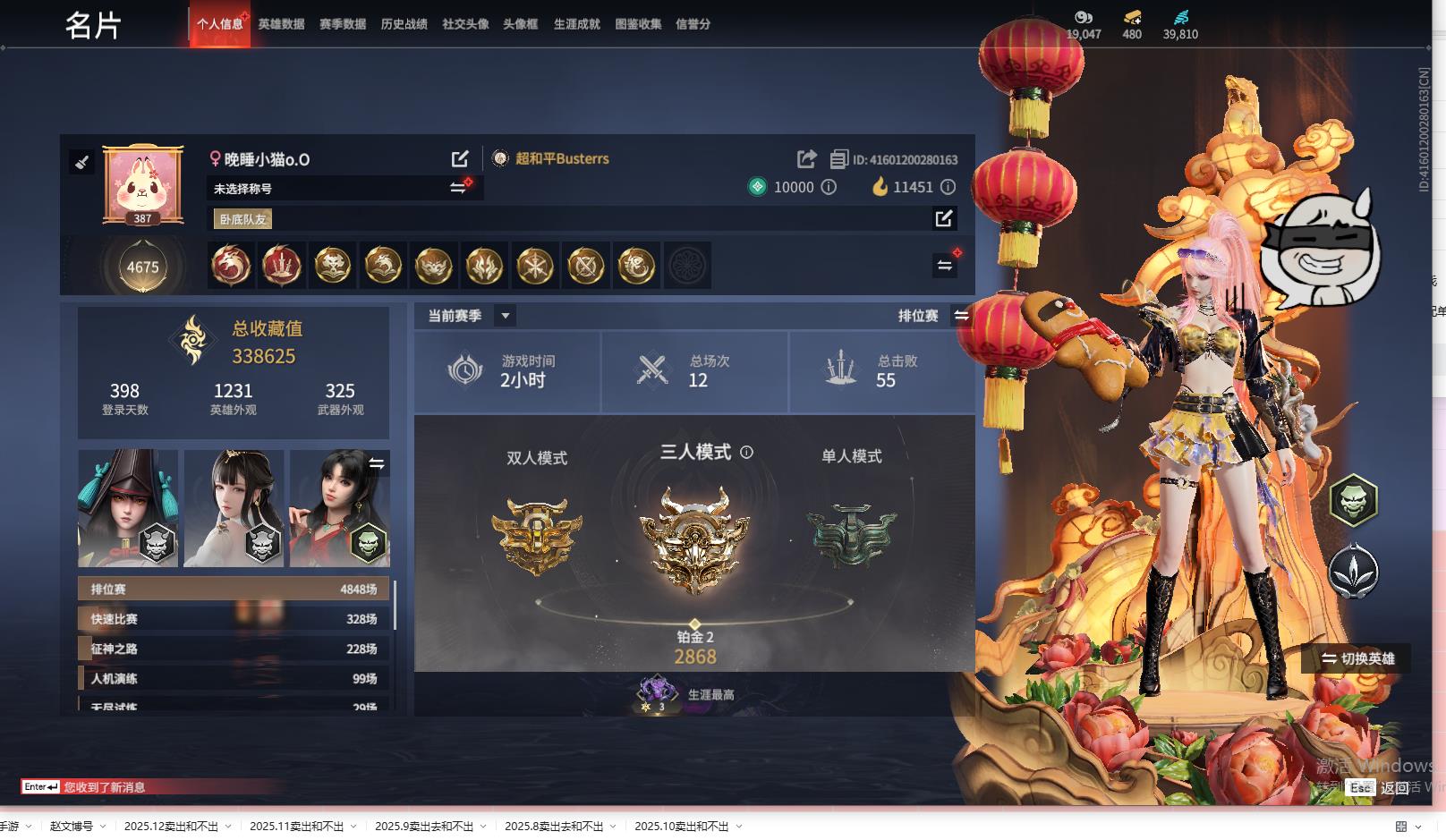 [14217612]yjj867/1.3换绑/等级387/s18三人铂金2/18红453金收藏值338625/墨离/星辉魔纱/熛怒炼火/樱云天女/蝶梦/海之奇/绝代风华/监兵凶神//流金晓锦/画中仙//天罚/冰魄/帝星/比羿/狼主/飞将戟/天琼//狂龙//西行劫·三尖两刃刀/夏日派对·初夏绯莓/2674·初代机/观山海·春木/炎烈珠/夏日派对·高校水着/御宅罗梦(白丝)彩俑娃娃/剪纸·彩刀/西行劫·杨戬//龙之影·过江龙/幻丝39810/未绑定手游