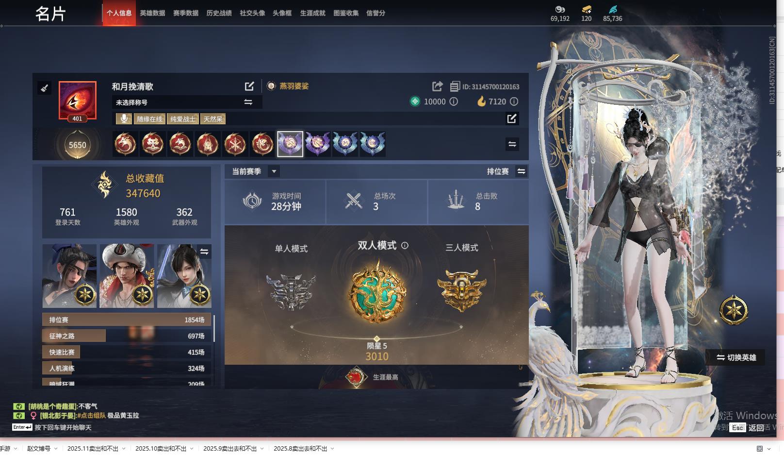 [14241216]yjj543/12.2换绑/等级401/s18三人黄金5/19红520金收藏值347640/赤皓新囍/墨离/化生明王/戎金狼/熛怒炼火/泣珠龙纱/暮光胴丸//绝代风华/沙漠香风/夜魅游莹/流金晓锦/天罚/毕方/少阳剑/灵狐幻刃/帝星/狼主/天琼//狂龙/2674·原型//西行劫·三尖两刃刀/珥冰/炎烈珠/御宅罗梦(白丝)/夏日派对·弄潮逐浪西行劫·杨戬/龙之影·过江龙//金人佣/幻丝84456/未绑定手游