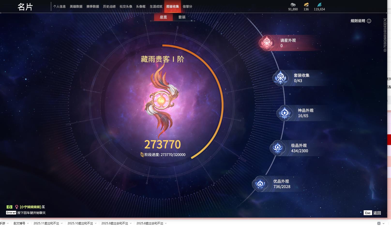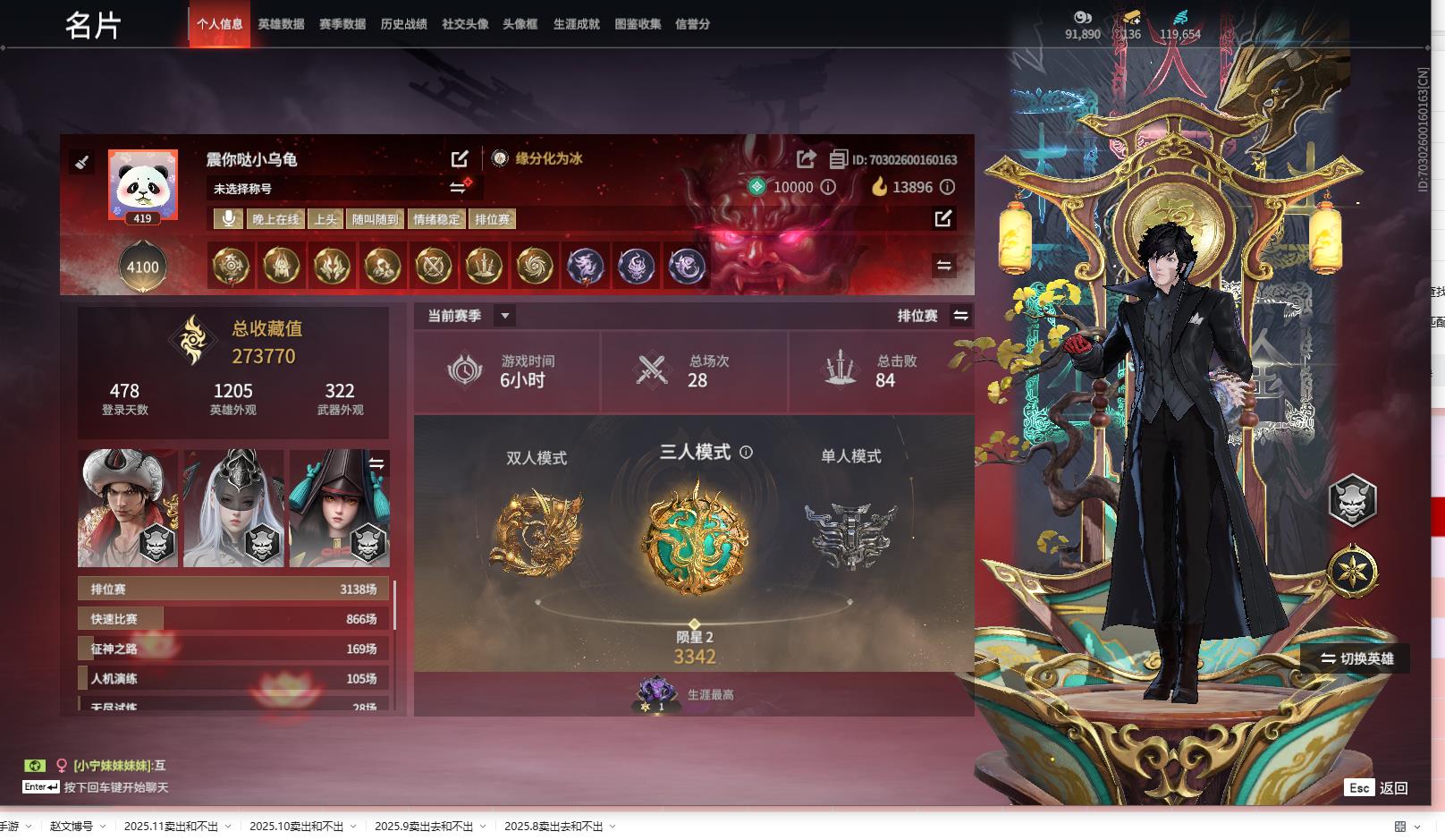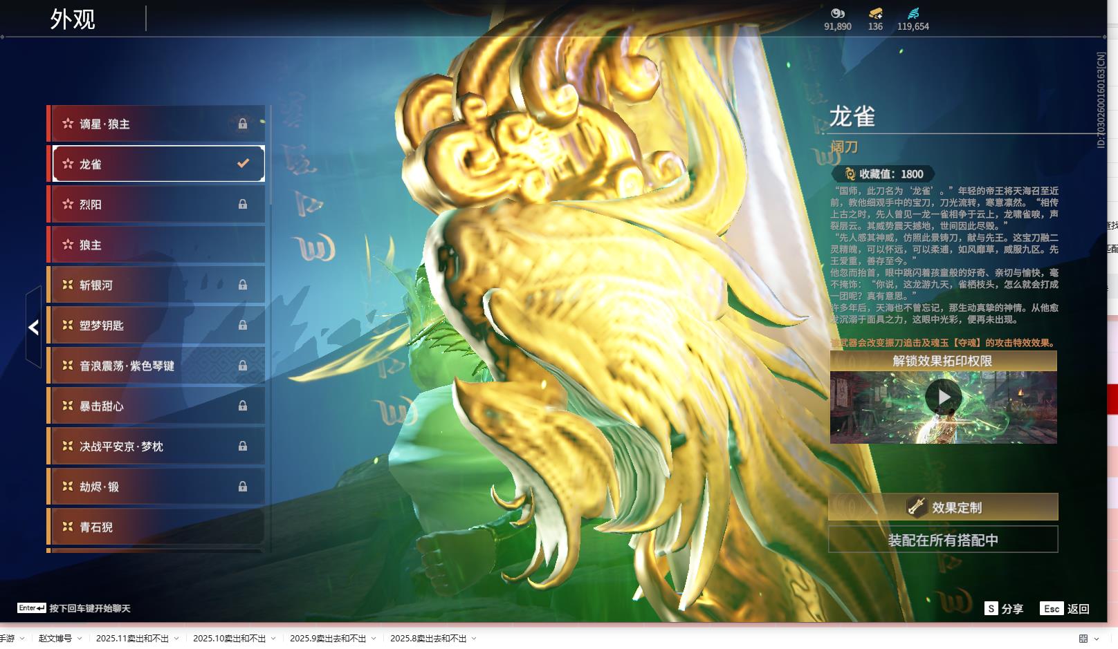 [14242200]yjj570/12.3换绑/等级419/s18三人陨星2/16红434金收藏值273770/赤皓新囍/初代玄女/墨离//星辉魔纱//戎金狼//熛怒炼火//泣珠龙纱//沙漠香风//画中仙//苍穹之光/赤帝炎轮/帝星/龙雀/狼主//飞将戟//狂龙/洛天依星轨引航//御宅罗梦(白丝)/龙之影·过江龙/荆魂//千秋匠心凶虎//西行劫·三尖两刃刀/幻丝119654/已绑定手游