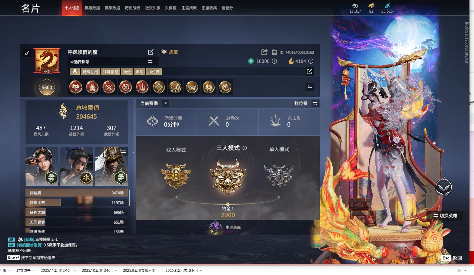 [14242731]yjj627/12.9换绑/等级445/s18三人铂金1/18红459金收藏值304645/赤皓新囍/初代玄女/墨离/星辉魔纱/化生明王/戎金狼/熛怒炼火/泣珠龙纱/监兵凶神/流金晓锦/逐光者/苍穹之光/少阳剑/帝星/龙雀/狼主/飞将戟/逆晦朔/2674原型/星辉环月/绿野守侯竹韵悠/珥冰/洛天依·星轨引航/御宅罗梦(白丝)/璃光·洛天依·共鸣/洛天依:共鸣/洛天依·音愈律阶/夏日派对·弄潮逐浪/龙之影·过江龙/西行劫·神君印/荆魂/揽九天/夏日派对·半夏晚风/幻丝84445/未绑定手游