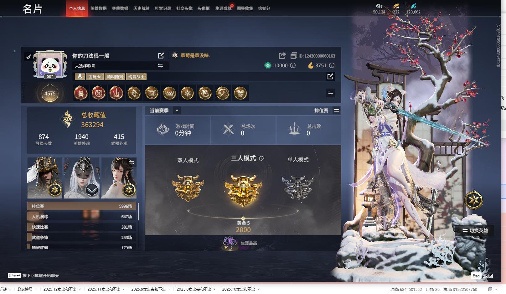 [14557583]yjj1001/1.13换绑/等级587/s18三人黄金5/18红614金收藏值363294/初代玄女/星辉魔纱/化生明王/戎金狼/熛怒炼火/蝶梦/暮光胴丸/绝代风华/沙漠香风/化道者/冰魄_/帝星/烈阳_/狼主/天琼/狂龙/天罚/墨离//剪纸彩刀/神君印/珥冰 宁红夜:/初代玄女/耀世魂花/夜华朝/玄豹姿/雪山天女/紫金玉女/自知/碧水青天/九阴圣女/缥缈发/簪缨发/云霞发/双马尾女 沈妙:/星辉魔纱/绮云衫/絮云衣/紫衣仙子/腓腓/百灵发/韶光发/双马尾女 天海:/化生明王/净金宝相/若水尊者/少林/觉之一念/生死局/裟伽龙王/八宝龙王/自在发/缘觉发/双马尾男 殷紫萍:/沐昭/萍之缘/瑶光沐月/流纨裙/花间影/暮落发/紫芙发/子菀发/苏木发/伏苓发/双马尾女 特木尔:/戎金狼/唐三/多闻天王/噬月天狼/苍狼之主/龙虎斗/沙狼之怒/追猎/苍狼宗主发/海神发/双马尾男 季沧海:/熛怒炼火/龙心炽焰/巨阙/街头烈火/醉山川/江海沧澜/江湖行/腾烟发/江海发/含锋发/双马尾男 胡桃:/蝶梦/日道神子/辉烨少女/御宅罗梦/山吹茶/春桃笑/承云兰寿/天钿女命/阴阳姬/贵胄少女/清雅少女/水仙发/月丹发/木棉发/月下香发/双马尾女 妖刀姬:/灼舞桃节/赤影妖刀姬/樱雨刀舞/御神之刃 崔三娘:/巨鲸客/文鳐/阿娜希塔/无拘/赤雾烟霞/探海裙/蛰龙吟/弄潮逐浪/掌珠仙子/沸海发/填海发/安澜发/碎浪发/浩渺发/激浪发/鲸海发/双马尾女 岳山:/尼尔/金戈止/杨戬/汉光/守誓者/过江龙/辉光/骁骑/万仞山发/双马尾男 无尘:/朝闻道/申公豹/幽篁山鬼/司天命/金羽客/若谷/九梁发/竹律发/双马尾男 顾清寒:/藏雨阁主/龙吉公主/金襦玉衫/寒英素雪/冰凌发/红鸾星发/双马尾女 武田信中:/暮光胴丸/苍雷丸/阎摩发/双马尾男 迦南:/绝代风华/沙漠香风/玉叶景/观山海青鸟/胡旋女/火罗圣女/神鹰之女/惊云羽/金羽圣鹰/飞天/蜃楼魅影/瀚海苍鹰/璨银魔枭/化羽发/夕鹰发/翔鸾发/青鸾发/琳琅发/双马尾女 胡为:/秋神蓐收/斑斓衣/蛤蟆头领/行空裘/悟空/天刑发/双马尾男 季莹莹:/冬神玄冥/丝莼/干将莫邪/冥泉发/缱绻发/流萤发/双马尾女 玉玲珑:/妲己/广目天王/赤羽/黄昏巫主/日影花阴/玄瑛发/古溪发/笼烟芍药发/双马尾女 哈迪:/化道者/天工奥妙/夜绸袍/双马尾男 魏轻:/双马尾