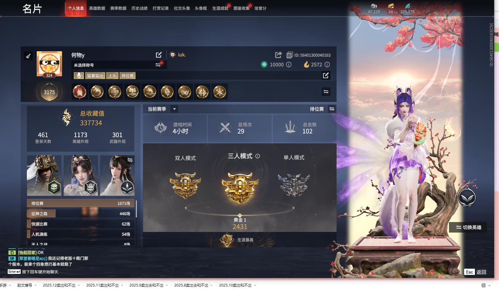 [14595290]yjj1011/1.14换绑/等级324/s18三人黄金1/20红445金收藏值337734/赤皓新囍/初代玄女/星辉魔纱/化生明王/戎金狼/熛怒炼火/海之奇/凌霄之羽/香雪水兰/绝代风华/通天狐袄/化道者/执明神君/少阳剑/帝星/比羿/狼主/天琼/逆晦朔/天罚/石龛造像/春木/神君印/初代机/御祥云/剪纸彩刀/珥冰 【武技外观】/断秋风·梅 宁红夜:/赤皓新囍/初代玄女/夜华朝/碧水青天/红川仙子/九阴圣女/簪缨发/双马尾女 沈妙:/星辉魔纱/千机喵/涂鸦少女/悠竹萌客/楚韵九歌山鬼/腓腓/绮云衫/咏春/忘忧发/娇憨发/韶光发/双马尾女 天海:/化生明王/少林/缘觉发/双马尾男 殷紫萍:/春神句芒/萍之缘/暮落发/春晖发/伏苓发/双马尾女 特木尔:/戎金狼/街头梦语/唐三/苍狼之主/追猎/苍狼宗主发/海神发/双马尾男 季沧海:/熛怒炼火/巨阙/信手斩龙/夏神祝融/椰风夕照/游四海/腾烟发/炎野发/江海发/含锋发/双马尾男 胡桃:/遣唐使/小舞/承云兰寿/高校水着/春桃笑/贵胄少女/樱舞发/月丹发/雀变发/双马尾女 崔三娘:/海之奇/文鳐/暗沼摩罗/阿娜希塔/赤雾烟霞/怒浪/冷傲发/夜游发/双马尾女 岳山:/戍关将/弘毅袍/金戈止/斩魔天将/过江龙/万仞山发/双马尾男 无尘:/凌霄之羽/朝闻道/申公豹/黄庭道/司天命/太极/发/双马尾男 顾清寒:/香雪水兰/a2/龙吉公主/紫微星命/赤丹朱湛/灵儿发/绯霜发/红鸾星发/双马尾女 武田信中:/花之倾奇/麟鹿大铠/双马尾男 迦南:/绝代风华/玉叶景/观山海青鸟/胡旋女/浣烟纱/飞天/瀚海苍鹰/化羽发/翔鸾发/青鸾发/琳琅发/双马尾女 胡为:/蛤蟆头领/福瑞天泽/秋神蓐收/桀骜发/天刑发/双马尾男 季莹莹:/冬神玄冥/八极/干将莫邪/无常白袍/冥泉发/缱绻发/幽焰发/流萤发/双马尾女 玉玲珑:/通天狐袄/妲己/广目天王/形意/日影花阴/黄昏巫主/商月发/古溪发/笼烟芍药发/双马尾女 哈迪:/化道者/天工奥妙/夜绸袍/狮鬓发/秀逸发/双马尾男 魏轻:/执明神君/玄冥发/双马尾女 刘炼:/姜子牙/仙风发/双马尾男 张起灵:/山漠狞影/赤焰战灵/双马尾男 席拉:/日月明/雪铃绮歌/蜜语发/双马尾女 蓝梦:/双马尾女 拳刃:/天狐/无相印/毛乎乎/诡刃八岐 长剑:/少阳剑/亢龙/含光承影/壶中日月/监星尺/赤霄/隐锋 太刀:/