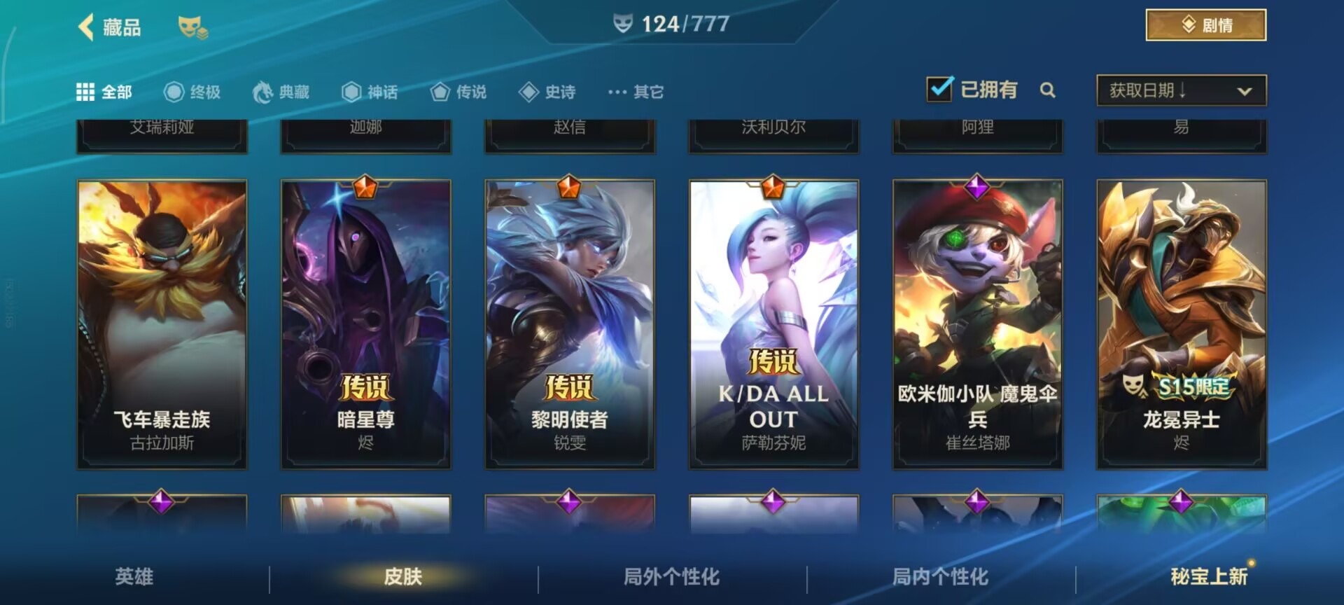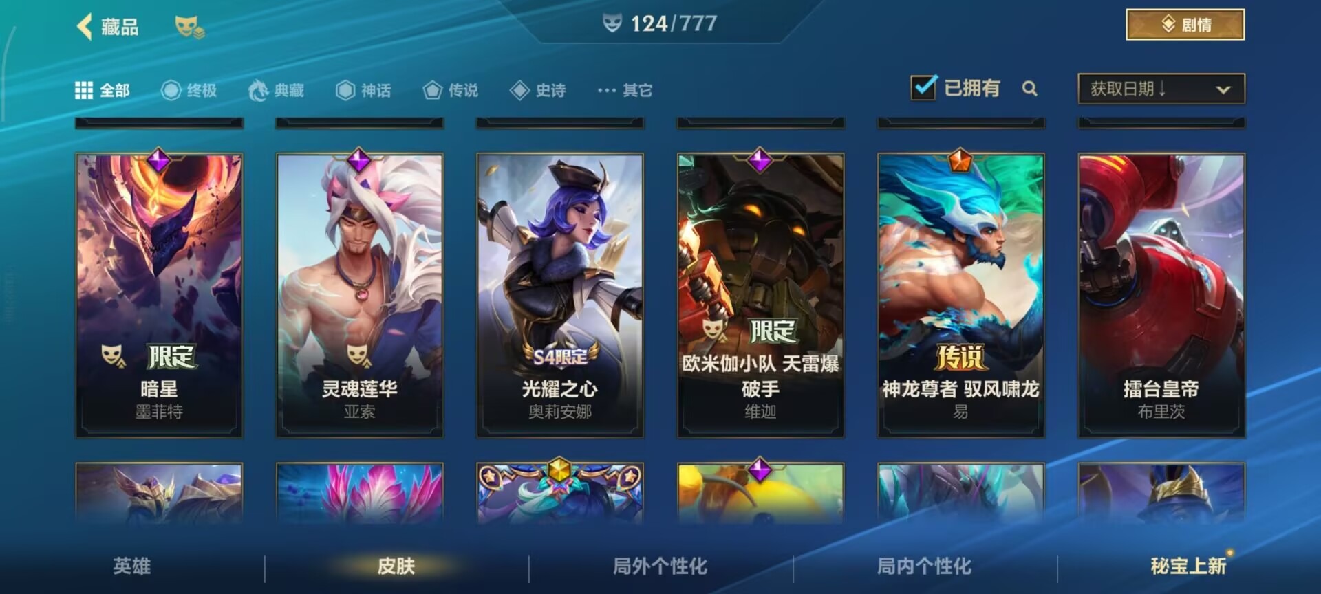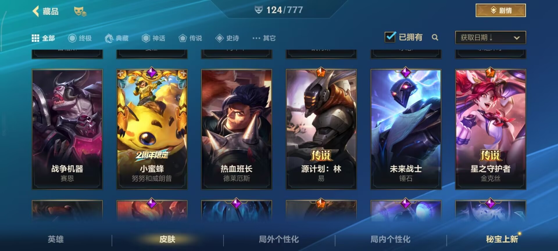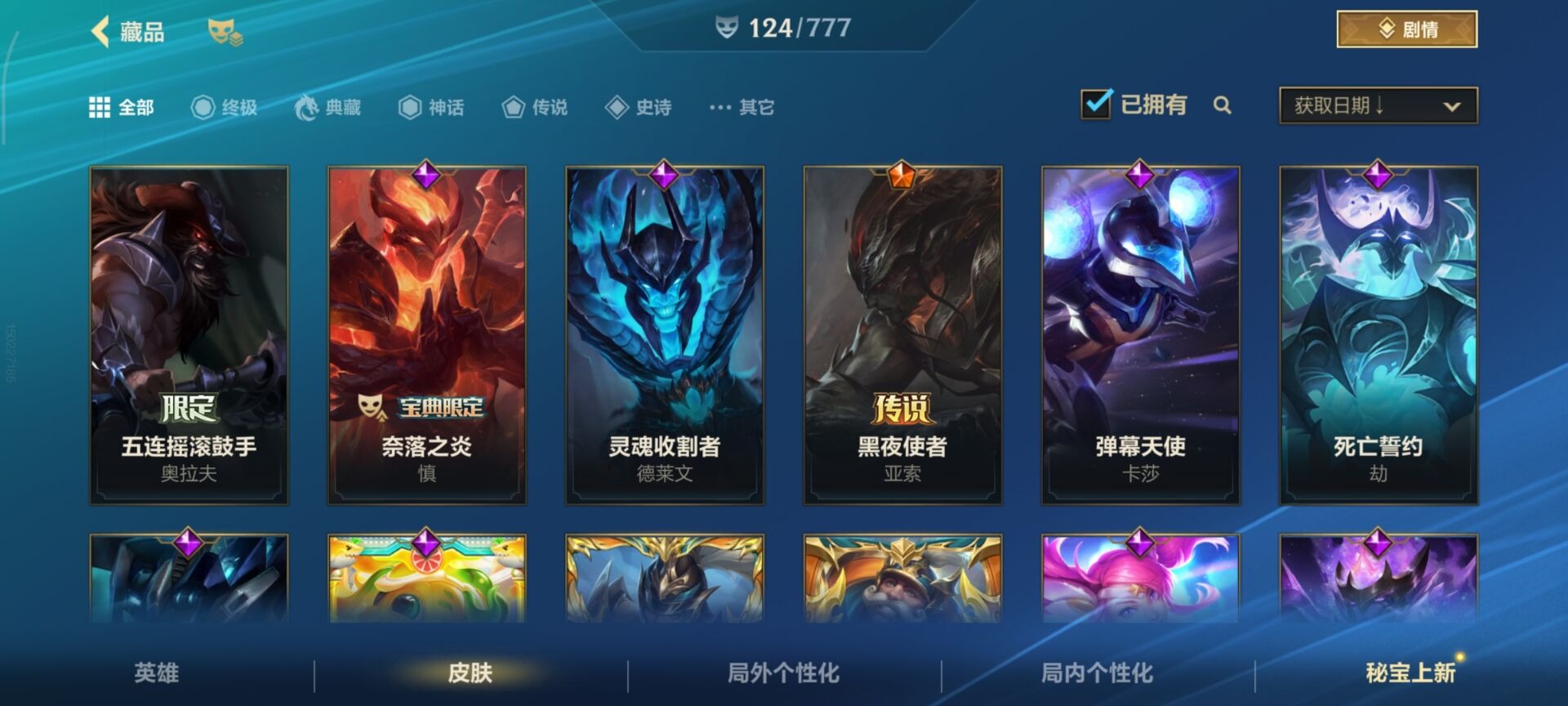 2神话 1限定 16传说 61史诗 124皮肤 可二次 可修改实名 信用分低,需要打3把匹配 【段位】:铂金 【神话皮】:夜星流火 金克丝玄龙绛天 易 【限定皮肤】:张辽文远 【传说皮】:暗星尊源计划:毁灭未来战士女警神拳盲僧神龙尊者 驭风啸龙星域游侠卡牌炼狱魔犬黎明使者锐雯k/d
