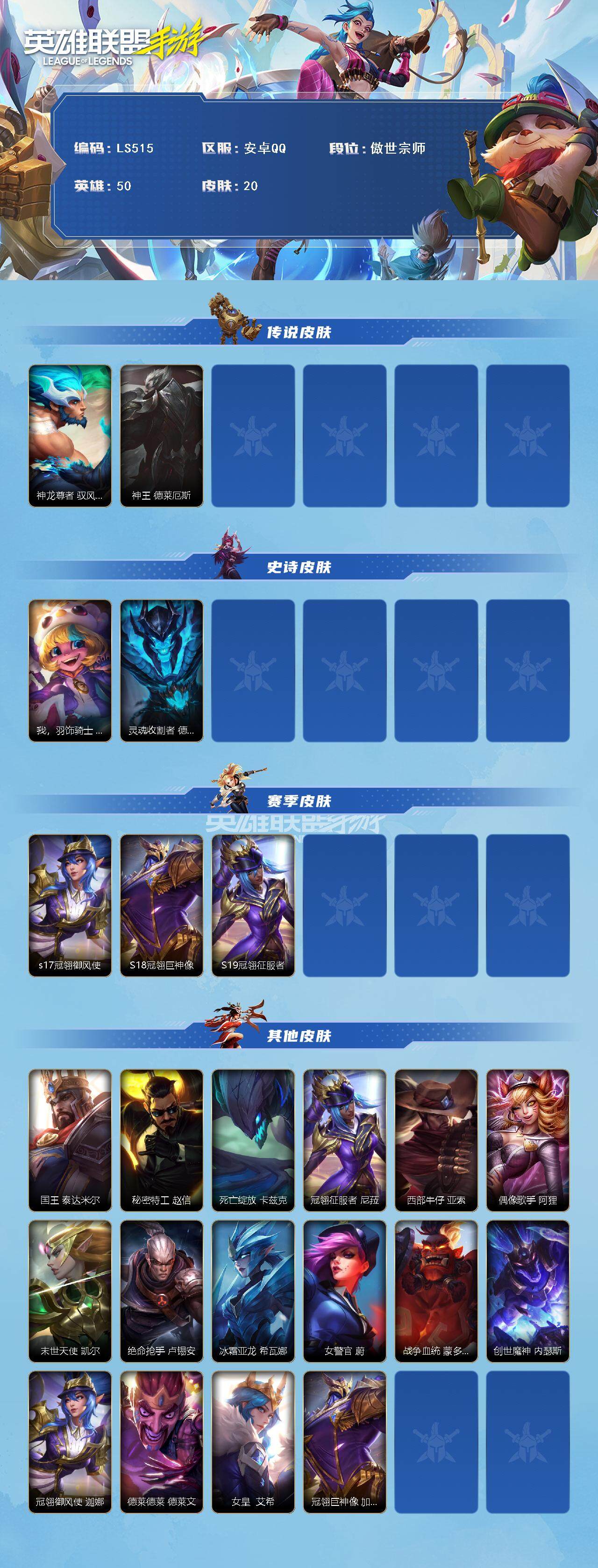【ls515】50英雄/20皮肤/傲世宗师/神龙尊者 驭风啸龙 易/神王 德莱厄斯/我,羽饰骑士 崔丝塔娜/灵魂收割者 德莱文/s17冠翎御风使/s18冠翎巨神像/s19冠翎征服者/国王 泰达米尔/秘密特工 赵信/死亡绽放 卡兹克/冠翎征服者 尼菈/西部牛仔 亚索/偶像歌手 阿狸/末世天使 凯尔/绝命呛手 卢锡安/冰霜亚龙 希瓦娜/女警官 蔚/战争血统 蒙多医生/创世魔神 内瑟斯/冠翎御风使 迦娜/德莱德莱 德莱文/女皇 艾希/冠翎巨神像 加里奥