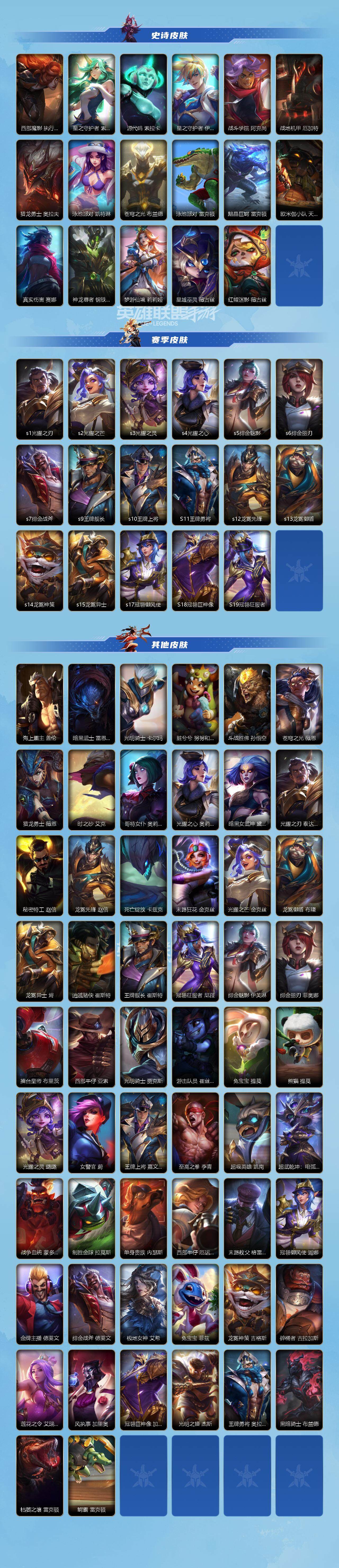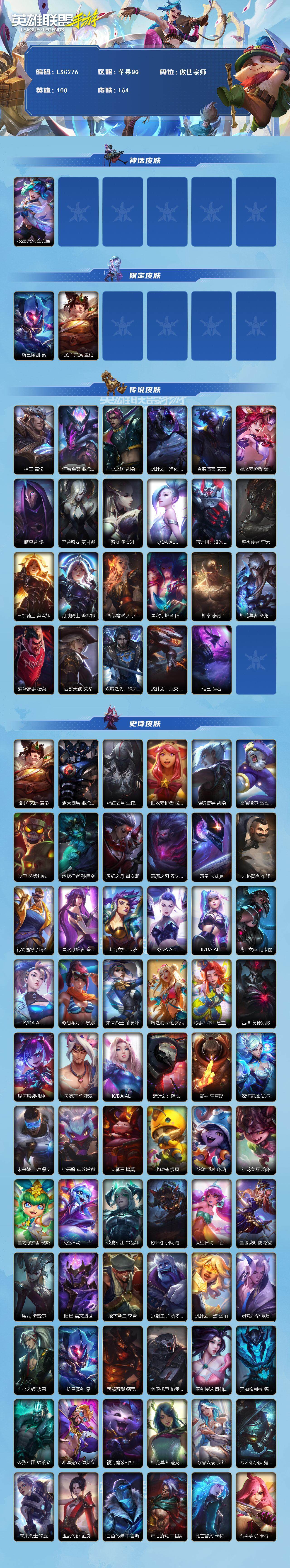 【lsc276】100英雄/164皮肤/2神话/23传说/83史诗/傲世宗师/夜星流火 金克丝/斩星魔剑 易/张辽 文远 盖伦/神王 盖伦/海魔至尊 亚托克斯/心之钢 凯隐/源计划:净化 薇恩/真实伤害 艾克/星之守护者 金克丝/暗星尊 烬/至尊魔女 莫甘娜/魔女 伊芙琳/k/da all out 萨勒芬妮/源计划:超体 莫德凯撒/黑夜使者 亚索/日蚀骑士 蕾欧娜/月蚀骑士 蕾欧娜/西部魔影 大小姐 蕾欧娜/星之守护者 陨 洛/神拳 李青/神龙尊者 圣龙 李青/灌篮高手 德莱厄斯/西部天使 艾希/双城之战:殊途 杰斯/源计划:泯灭 雷克顿/暗星 锤石/霸天剑魔 亚托克斯/腥红之月 亚托克斯/睡衣守护者 拉克丝/摄魂猎手 凯隐/雷喵喵尔 雷恩加尔/丧尸 努努和威朗普/地狱行者 孙悟空/腥红之月 黛安娜/恶魔之刃 泰达米尔/暗星 卡兹克/末路管家 布隆/礼物选好了吗? 布隆/星之守护者 辛德拉/电玩女神 卡莎/k/da all out 卡莎/k/da all out 伊芙琳/铁血女忍 阿卡丽/k/da all out 阿卡丽/泳池派对 菲奥娜/未来战士 菲奥娜/海之歌 萨勒芬妮/歌手?不!是主唱! 萨勒芬妮/古神 莫德凯撒/银河魔装机神 安妮/灵魂莲华 亚索/k/da all out 阿狸/源计划:阴 劫/武神 贾克斯/深海奇域 凯尔/未来战士 卢锡安/小恶魔 崔丝塔娜/大魔王 提莫/小蜜蜂 提莫/泳池派对 璐璐/驯龙女巫 璐璐/星之守护者 璐璐/太空律动 “节奏幻师” 璐璐/破败军团 希瓦娜/欧米伽小队 毒针狙击手 图奇/太空律动 “百万调音” 格温/星域裁断使 格温/魔女 卡蜜尔/暗星 嘉文四世/地下拳王 李青/冰封王子 蒙多医生/源计划:燃 泽丽/灵魂莲华 永恩/心之钢 永恩/西部魔影 德莱厄斯/禁卫机甲 格雷福斯/玉剑传说 风仙子 迦娜/灵魂收割者 德莱文/破败军团 德莱文/斗魂无双 德莱文/银河魔装机神 纳尔/神龙尊者 苍龙 艾希/水晶玫瑰 艾希/欧米伽小队 鬼影蛙人 菲兹/未来战士 锐雯/玉剑传说 武剑仙 锐雯/白色死神 韦鲁斯/满弓镇魂 韦鲁斯/死亡誓约 卡特琳娜/战斗学院 卡特琳娜/西部魔影 执行人 卡特琳娜/星之守护者 索拉卡/源代码 索拉卡/星之守护者 伊泽瑞尔/战斗学院 阿克尚/战地机甲 厄加特/猎龙勇士 奥拉夫/泳池派对 凯特琳/苍穹之光 布兰德/泳池派对 雷克顿/黯晶巨鳄 雷克顿/欧米伽小队 天雷爆破手 维迦/真实伤害 赛娜/神龙尊者 钢铁之龙 锤石/梦游仙境 莉莉娅/星域巫灵 薇古丝/红帽迷影 薇古丝/s1光耀之刃/s2光耀之芒/s3光耀之灵/s4光耀之心/s5绯金魅影/s6绯金丽刃/s7绯金战斧/s9王牌舰长/s10王牌上将/s11王牌勇将/s12龙冕先锋/s13龙冕御盾/s14龙冕神策/s15龙冕异士/s17冠翎御风使/s18冠翎巨神像/s19冠翎征服者/海上霸主 盖伦/暗黑武士 雷恩加尔/光明骑士 卡尔玛/脏兮兮 努努和威朗普/斗战胜佛 孙悟空/苍穹之光 薇恩/猎龙勇士 薇恩/时之砂 艾克/哥特女仆 奥莉安娜/光耀之心 奥莉安娜/暗黑女武神 黛安娜/光耀之刃 泰达米尔/秘密特工 赵信/龙冕先锋 赵信/死亡绽放 卡兹克/末路狂花 金克丝/光耀之芒 金克丝/龙冕御盾 布隆/龙冕异士 烬/赌侠 崔斯特/王牌舰长 崔斯特/冠翎征服者 尼菈/绯金魅影 伊芙琳/绯金丽刃 菲奥娜/擂台皇帝 布里茨/西部牛仔 亚索/光明骑士 贾克斯/游击队员 崔丝塔娜/兔宝宝 提莫/熊猫 提莫/光耀之灵 璐璐/女警官 蔚/王牌上将 嘉文四世/至高之拳 李青/超级英雄 凯南/超武乾坤:电弧 凯南/战争血统 蒙多医生/制胜金球 拉莫斯/单身贵族 内瑟斯/西部牛仔 厄运小姐/末路教父 格雷福斯/冠翎御风使 迦娜/金牌主播 德莱文/绯金战斧 德莱文/极地女神 艾希/兔宝宝 菲兹/龙冕神策 吉格斯/碎桶者 古拉加斯/莲花之令 艾瑞莉娅/风执事 加里奥/冠翎巨神像 加里奥/光明之锤 杰斯/王牌勇将 奥拉夫/黑暗骑士 布兰德/枯萎之壤 雷克顿/鳄霸 雷克顿