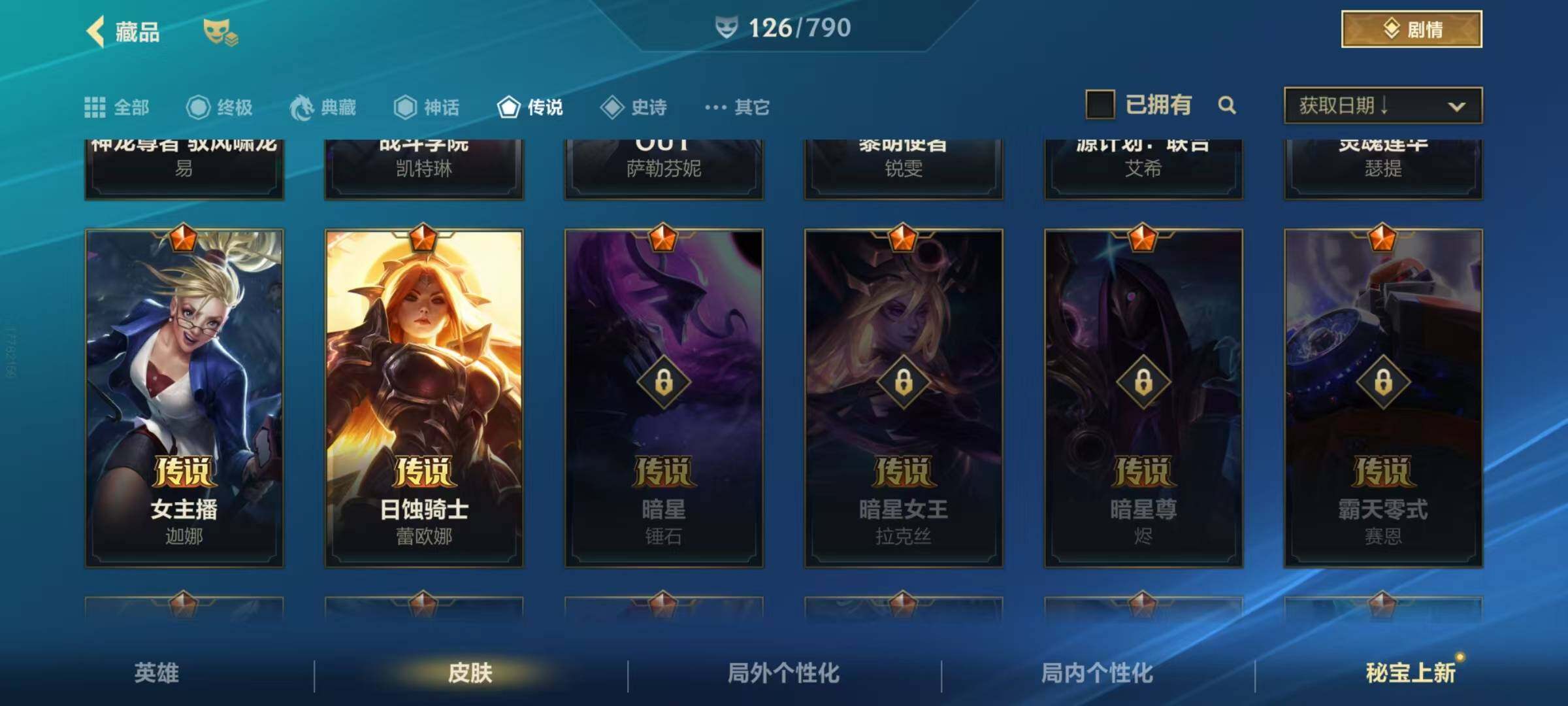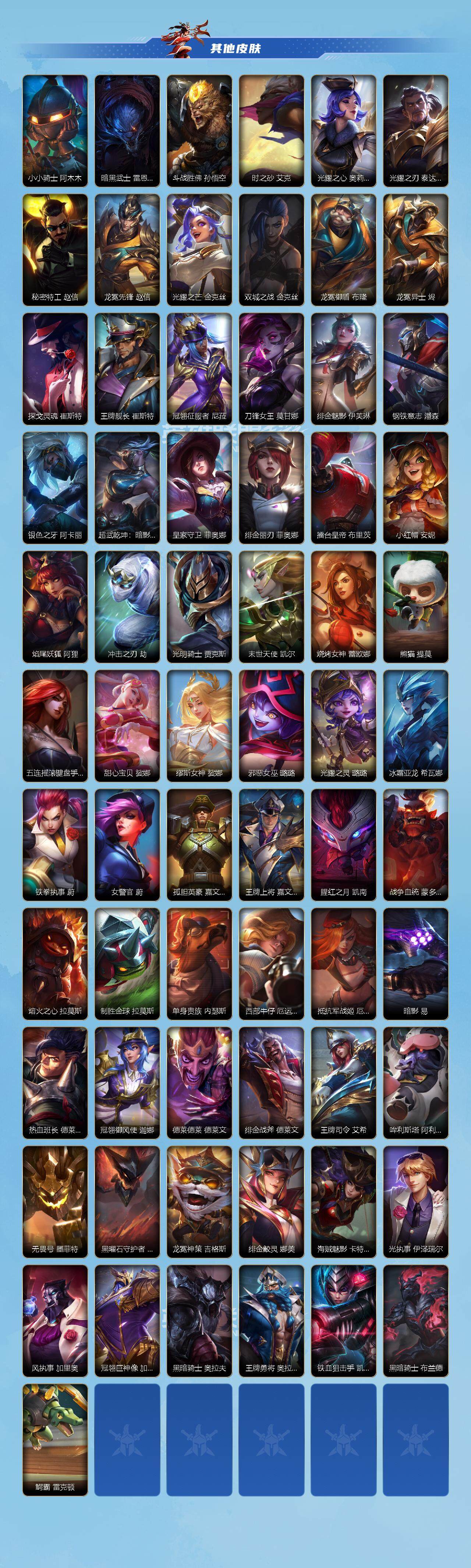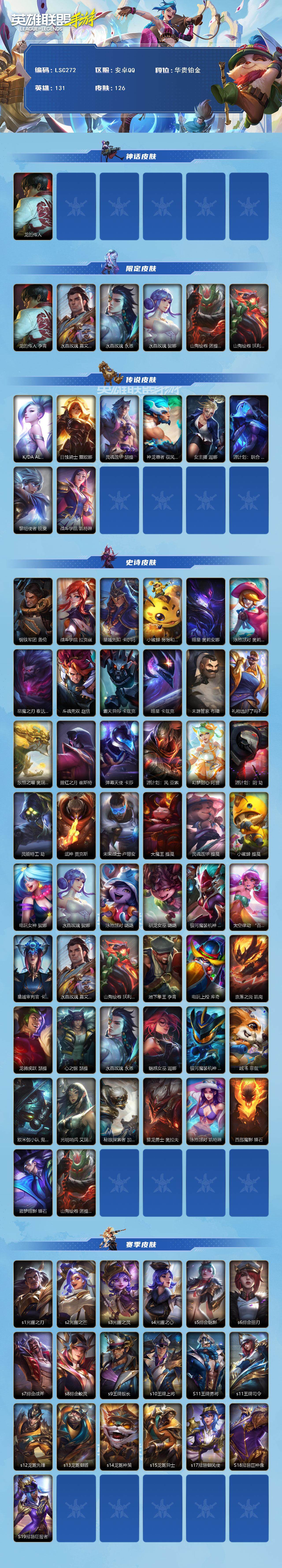 【lsc272】131英雄/126皮肤/1神话/8传说/50史诗/华贵铂金/龙的传人 李青/水晶玫瑰 嘉文四世/水晶玫瑰 永恩/水晶玫瑰 娑娜/山海绘卷 诺提勒斯/山海绘卷 沃利贝尔/k/da all out 萨勒芬妮/日蚀骑士 蕾欧娜/灵魂莲华 瑟提/神龙尊者 驭风啸龙 易/女主播 迦娜/源计划:联合 艾希/黎明使者 锐雯/战斗学院 凯特琳/钢铁军团 盖伦/战斗学院 拉克丝/星域先知 卡尔玛/小蜜蜂 努努和威朗普/暗星 奥莉安娜/泳池派对 奥莉安娜/恶魔之刃 泰达米尔/斗魂无双 赵信/霸天异形 卡兹克/暗星 卡兹克/末路管家 布隆/礼物选好了吗? 布隆/东恒之曜 奥瑞利安·索尔/腥红之月 崔斯特/弹幕天使 卡莎/源计划:风 亚索/幻梦甜心 阿狸/源计划:阴 劫/灵能特工 劫/武神 贾克斯/未来战士 卢锡安/大魔王 提莫/灵魂莲华 提莫/小蜜蜂 提莫/电玩女神 娑娜/泳池派对 璐璐/驯龙女巫 璐璐/银河魔装机神 希瓦娜/太空律动 “百万调音” 格温/星域审判官 卡蜜尔/地下拳王 李青/电玩上校 库奇/奈落之炎 凯南/龙腾虎跃 瑟提/心之钢 瑟提/魅惑女巫 迦娜/银河魔装机神 菲兹/绒毛 菲兹/欧米伽小队 鬼影蛙人 菲兹/光明哨兵 艾瑞莉娅/秘旅探索者 加里奥/猎龙勇士 奥拉夫/泳池派对 凯特琳/西部魔影 锤石/盗梦暗影 锤石/s1光耀之刃/s2光耀之芒/s3光耀之灵/s4光耀之心/s5绯金魅影/s6绯金丽刃/s7绯金战斧/s8绯金鮫灵/s9王牌舰长/s10王牌上将/s11王牌勇将/s11王牌司令/s12龙冕先锋/s13龙冕御盾/s14龙冕神策/s15龙冕异士/s17冠翎御风使/s18冠翎巨神像/s19冠翎征服者/小小骑士 阿木木/暗黑武士 雷恩加尔/斗战胜佛 孙悟空/时之砂 艾克/光耀之心 奥莉安娜/光耀之刃 泰达米尔/秘密特工 赵信/龙冕先锋 赵信/光耀之芒 金克丝/双城之战 金克丝/龙冕御盾 布隆/龙冕异士 烬/探戈灵魂 崔斯特/王牌舰长 崔斯特/冠翎征服者 尼菈/刀锋女王 莫甘娜/绯金魅影 伊芙琳/钢铁意志 潘森/银色之牙 阿卡丽/超武乾坤:暗影 阿卡丽/皇家守卫 菲奥娜/绯金丽刃 菲奥娜/擂台皇帝 布里茨/小红帽 安妮/焰尾妖狐 阿狸/冲击之刃 劫/光明骑士 贾克斯/末世天使 凯尔/烧烤女神 蕾欧娜/熊猫 提莫/五连摇滚键盘手 娑娜/甜心宝贝 娑娜/缪斯女神 娑娜/邪恶女巫 璐璐/光耀之灵 璐璐/冰霜亚龙 希瓦娜/铁拳执事 蔚/女警官 蔚/孤胆英豪 嘉文四世/王牌上将 嘉文四世/腥红之月 凯南/战争血统 蒙多医生/熔火之心 拉莫斯/制胜金球 拉莫斯/单身贵族 内瑟斯/西部牛仔 厄运小姐/抵抗军战姬 厄运小姐/暗影 易/热血班长 德莱厄斯/冠翎御风使 迦娜/德莱德莱 德莱文/绯金战斧 德莱文/王牌司令 艾希/哞利斯塔 阿利斯塔/无畏号 墨菲特/黑曜石守护者 墨菲特/龙冕神策 吉格斯/绯金鲛灵 娜美/海贼魅影 卡特琳娜/光执事 伊泽瑞尔/风执事 加里奥/冠翎巨神像 加里奥/黑暗骑士 奥拉夫/王牌勇将 奥拉夫/铁血狙击手 凯特琳/黑暗骑士 布兰德/鳄霸 雷克顿