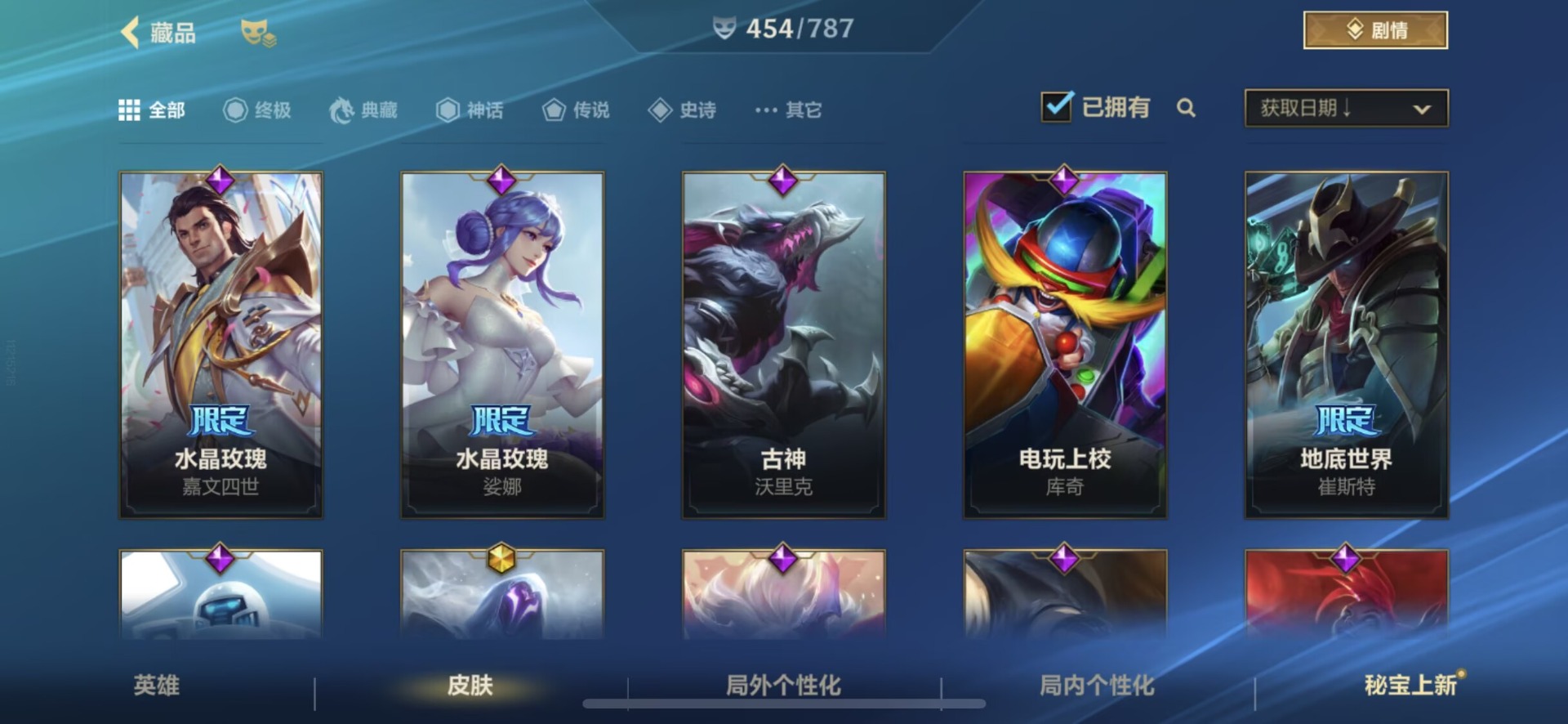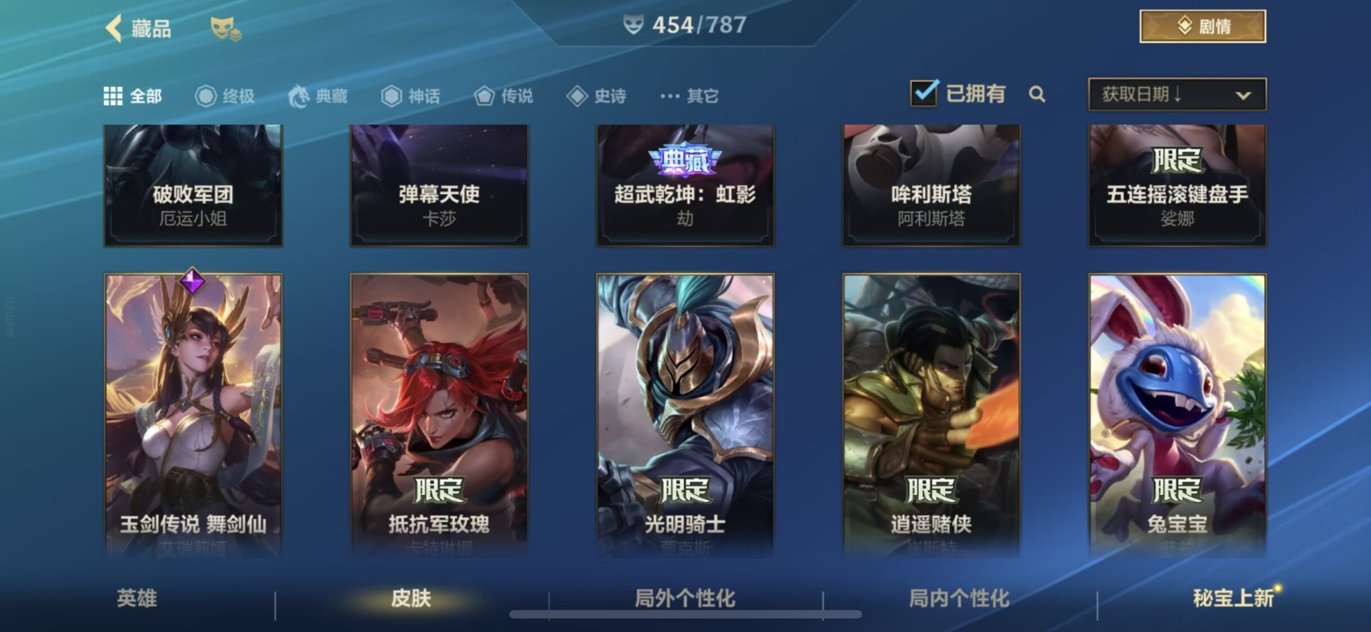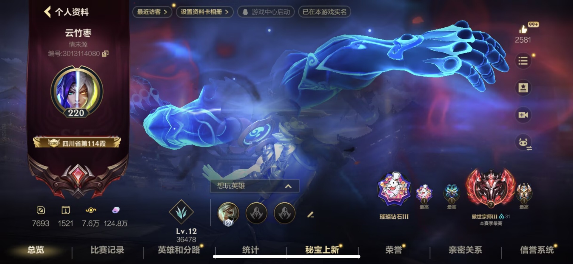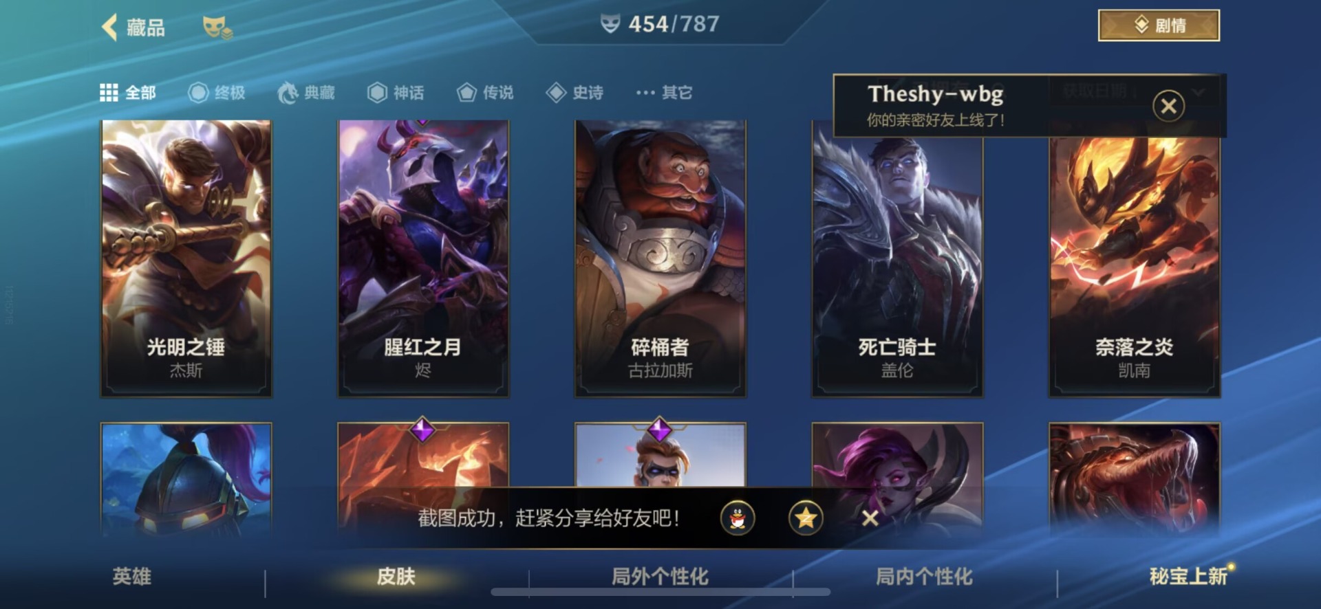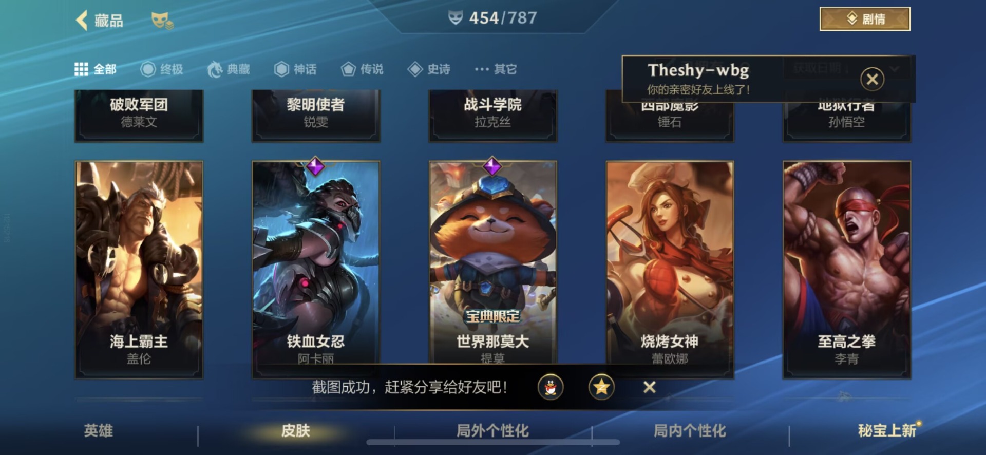 2典藏 9神话 27限定 50传说 244史诗 454皮肤 可二次 可修改实名 【段位】:宗师 【典藏皮】:超武乾坤:孤拳超武乾坤:虹影 【神话皮】:海克斯科技 雷克顿乘龙破渊 李青暮星追影 卡莎此志凌云 嘉文四世至臻喵喵魅影金克丝灰烬骑士派克火焰澎湃火力全开臻藏光影巨翼臻藏西部