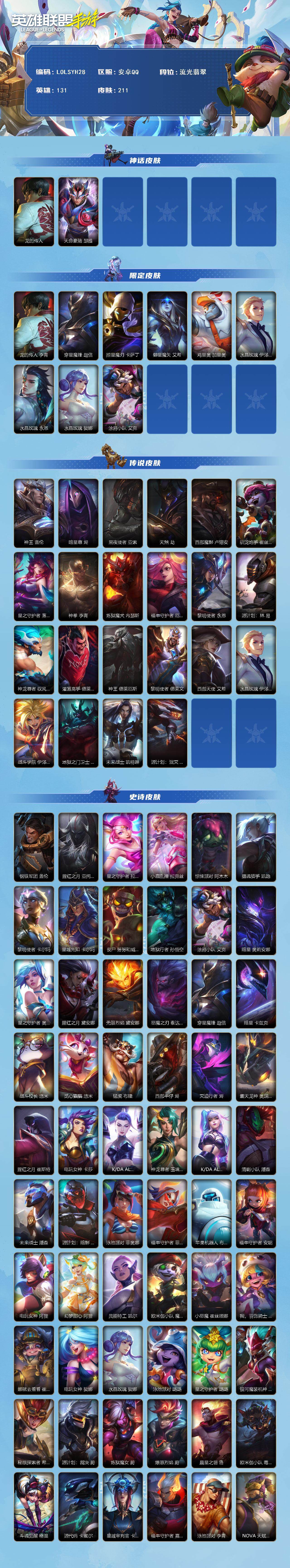 【lolsyh28】131英雄/211皮肤/流光翡翠/龙的传人/天命豪侠瑟提/穿星魔锋/掠星魔刃卡萨丁/御星魔矢/鸡里奥/水晶玫瑰伊泽瑞尔/水晶玫瑰永恩/水晶玫瑰琴女/涂鸦小队艾克/神王盖伦/暗星尊烬/黑夜使者亚索/天煞劫/西部魔影卢锡安/驯龙炮手崔丝塔娜/星之守护者落霞/神拳李青/炼狱魔犬内瑟斯/福牛守护者厄运小姐/黎明使者永恩/源计划:林易/神龙尊者 驭风啸龙/灌篮高手德莱厄斯/神王德莱厄