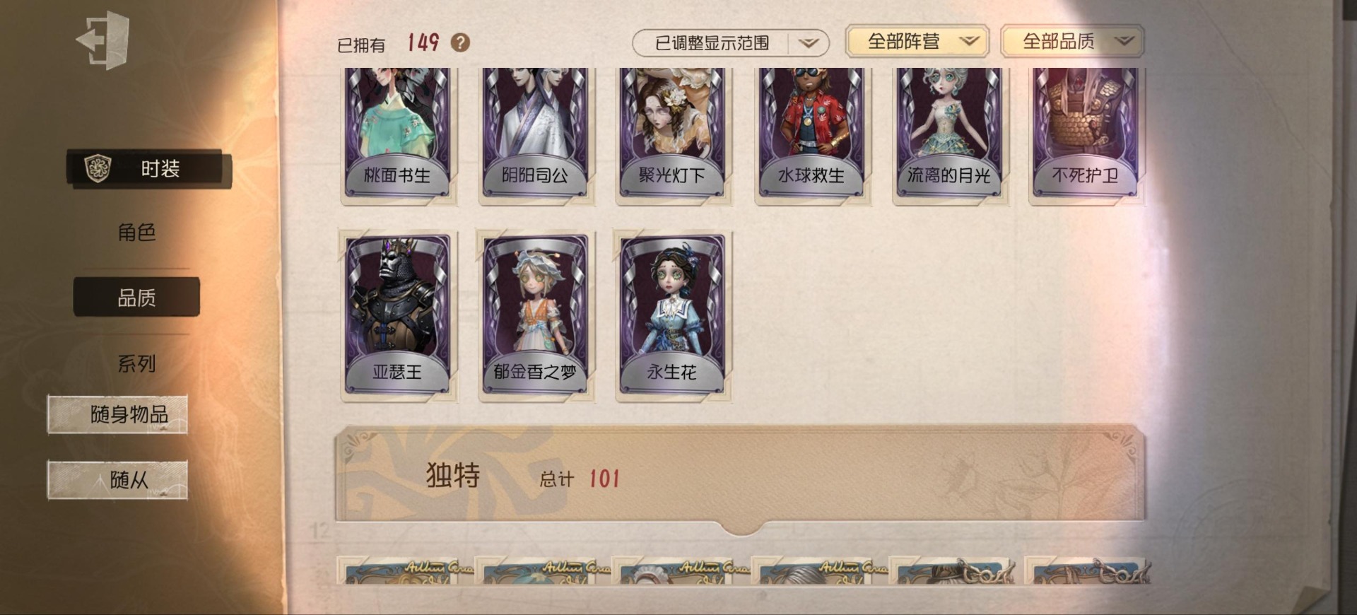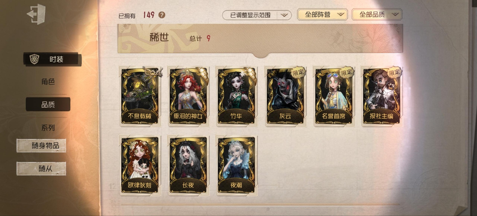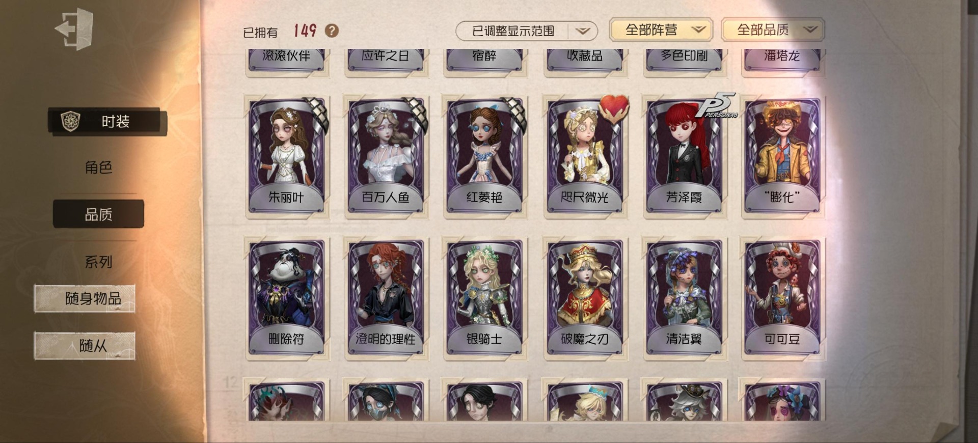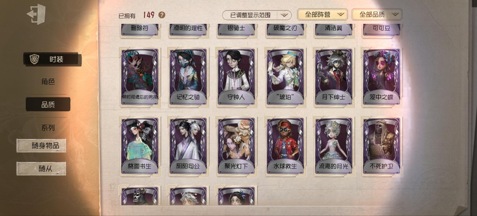 [14552875]安卓官服 手机账号 149时装 9金皮 39紫皮 8随从 48随身物品 【时装】:渔女-垂泪的神女红夫人-应许之日心理学家-长夜调香师-提炼师“小女孩”-欧律狄刻杂技演员-可可豆“心理学家”-朱丽叶作曲家-澄明的理性记者-伊布邮差-华生医生古董商-陶梦嫣玩具商-清洁翼“跛脚羊”-灰云渔女-百万人鱼渔女-破魔之刃入殓师-记忆之骑邮差-潘塔龙火灾调查员-“膨化”玩具商-咫尺微光画家-多色印刷冒险家-报社主编蜘蛛-不息载械“小女孩”-异动指针小说家-“伊始新篇”舞女-流离的月光宿伞之魂-桃面书生“心理学家”-银骑士摄影师-“琥珀”“法罗女士”-芳泽霞蜘蛛-聚光灯下祭司-名誉首席蜡像师-收藏品“记录员”-删除符前锋-水球救生厂长-不死护卫爱哭鬼-被时间遗忘的男孩红夫人-夜潮红蝶-竹华调香师-笼中之蝶调香师-红菱艳“小女孩”-滚滚伙伴摄影师-宿醉宿伞之魂-阴阳司公摄影师-月下绅士入殓师-守钟人 【随身物品】:夏(稀世)“全熟”奇珍入梦枕奇珍约束奇珍致命的邀请函稀世醒梦铃奇珍漂浮奇珍酩酊奇珍喝彩奇珍乐园奇珍秘密(奇珍)厌离稀世海底遗物奇珍净面奇珍完美人偶稀世协律奇珍西洋镜奇珍凝聚之水奇珍