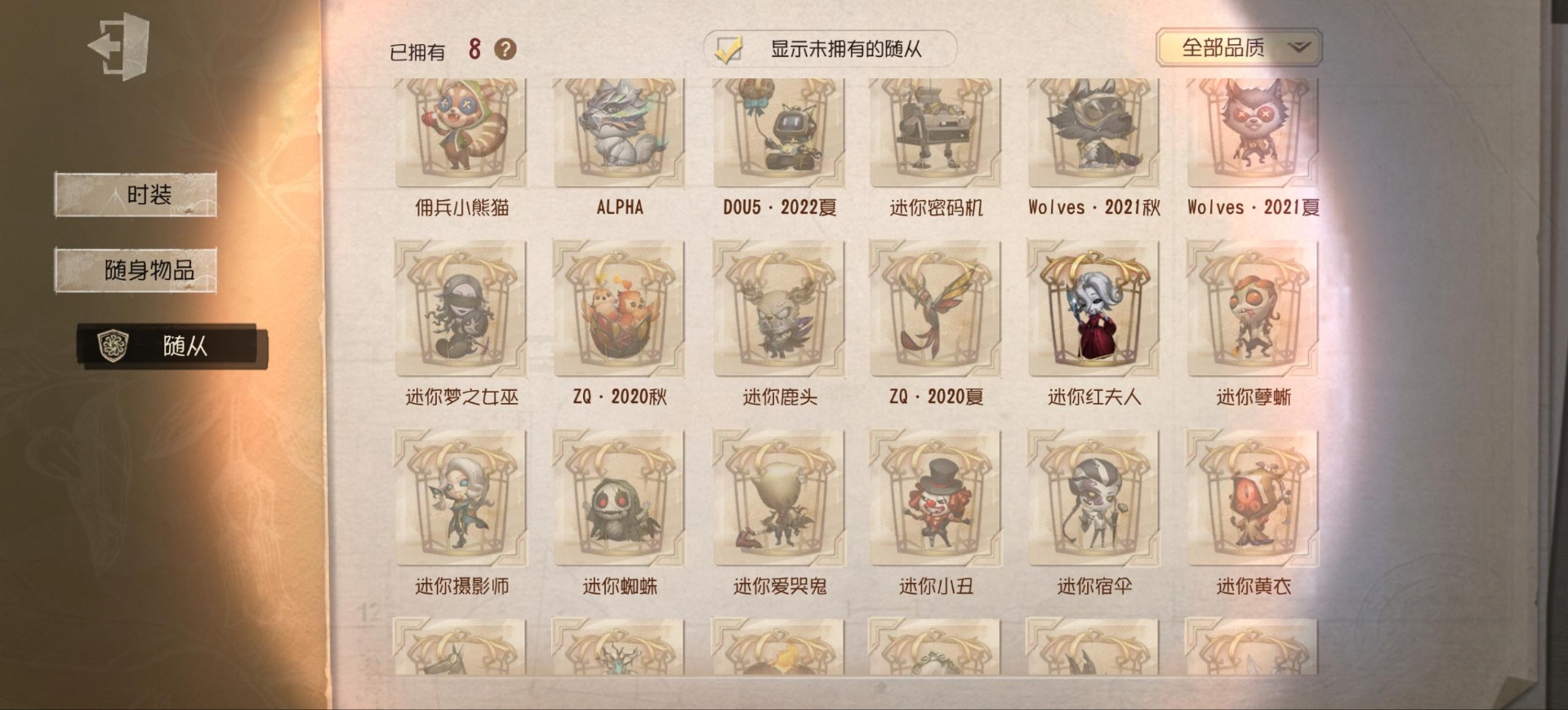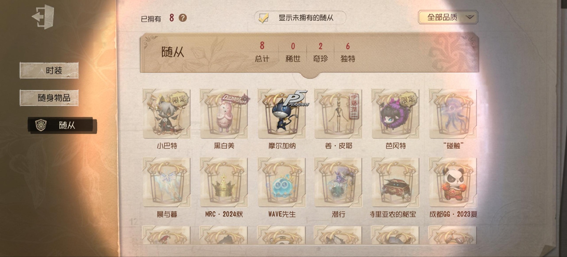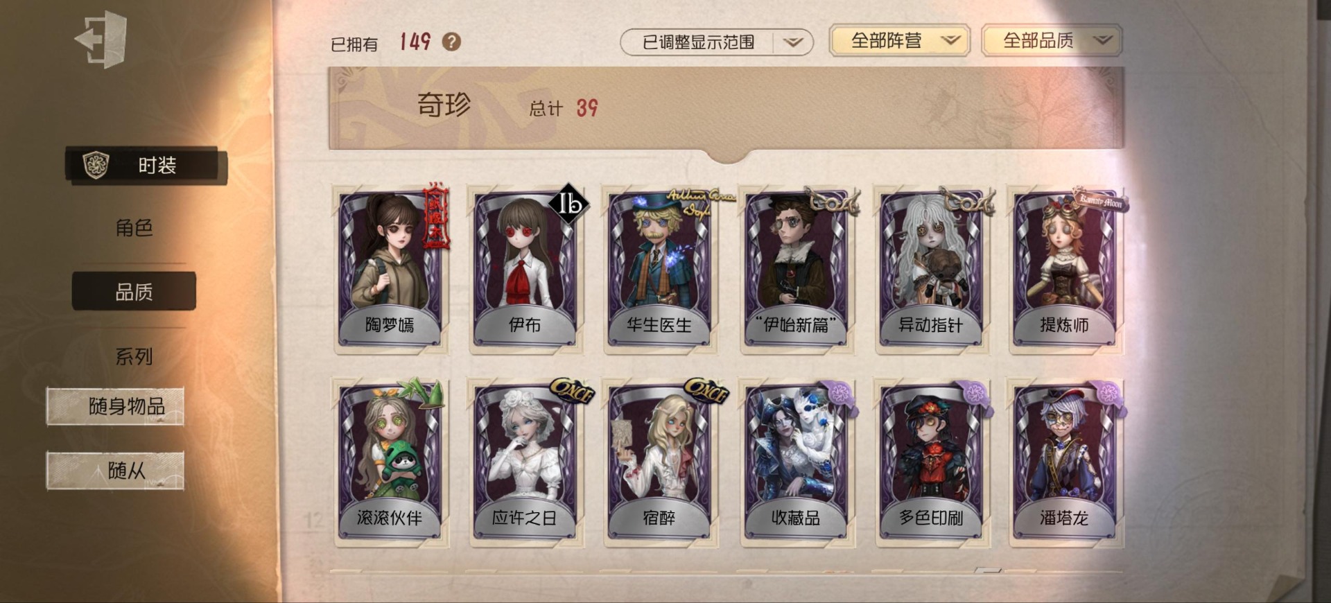 [14552875]安卓官服 手机账号 149时装 9金皮 39紫皮 8随从 48随身物品 【时装】:渔女-垂泪的神女红夫人-应许之日心理学家-长夜调香师-提炼师“小女孩”-欧律狄刻杂技演员-可可豆“心理学家”-朱丽叶作曲家-澄明的理性记者-伊布邮差-华生医生古董商-陶梦嫣玩具商-清洁翼“跛脚羊”-灰云渔女-百万人鱼渔女-破魔之刃入殓师-记忆之骑邮差-潘塔龙火灾调查员-“膨化”玩具商-咫尺微光画家-多色印刷冒险家-报社主编蜘蛛-不息载械“小女孩”-异动指针小说家-“伊始新篇”舞女-流离的月光宿伞之魂-桃面书生“心理学家”-银骑士摄影师-“琥珀”“法罗女士”-芳泽霞蜘蛛-聚光灯下祭司-名誉首席蜡像师-收藏品“记录员”-删除符前锋-水球救生厂长-不死护卫爱哭鬼-被时间遗忘的男孩红夫人-夜潮红蝶-竹华调香师-笼中之蝶调香师-红菱艳“小女孩”-滚滚伙伴摄影师-宿醉宿伞之魂-阴阳司公摄影师-月下绅士入殓师-守钟人 【随身物品】:夏(稀世)“全熟”奇珍入梦枕奇珍约束奇珍致命的邀请函稀世醒梦铃奇珍漂浮奇珍酩酊奇珍喝彩奇珍乐园奇珍秘密(奇珍)厌离稀世海底遗物奇珍净面奇珍完美人偶稀世协律奇珍西洋镜奇珍凝聚之水奇珍