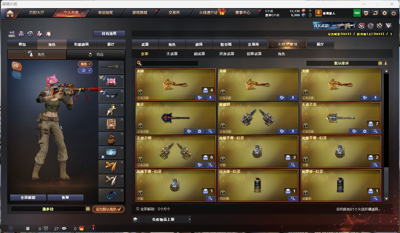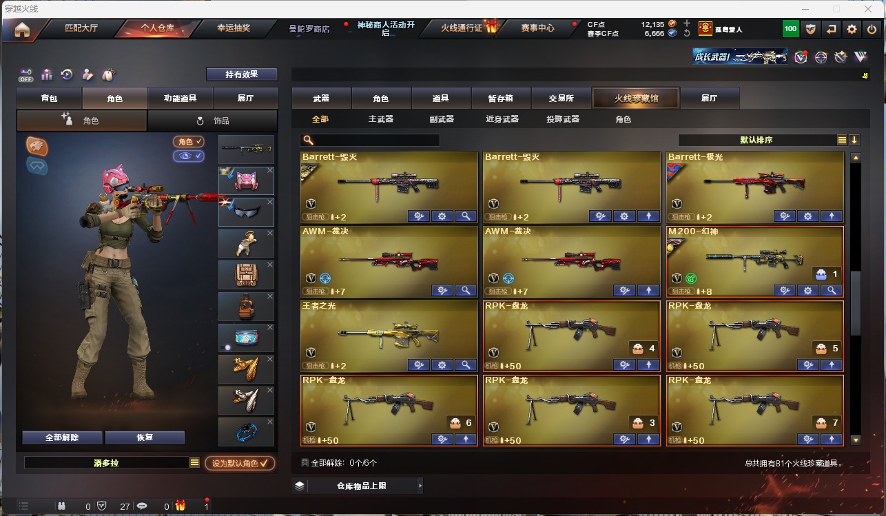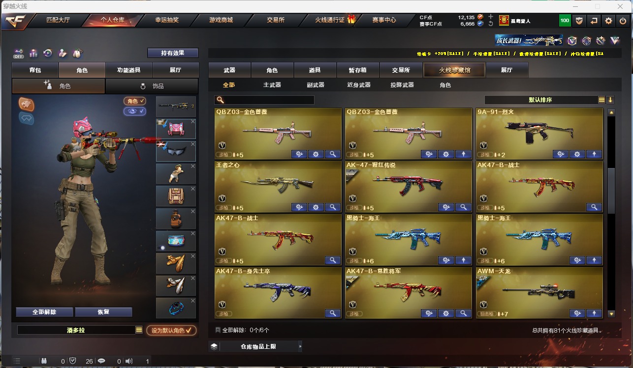 4传说角色 1王者武器 4炫金武器 76v武器 可二次 可修改实名 优质装备:m200-幻神q03-金色蔷薇ak47-无影ak47-机械迷城m4a1-雷神m4a1-黑骑士m4a1-黑龙m4a1-龙血m4a1-玫瑰精灵barrett-毁灭barrett-极光awm-天龙aw
