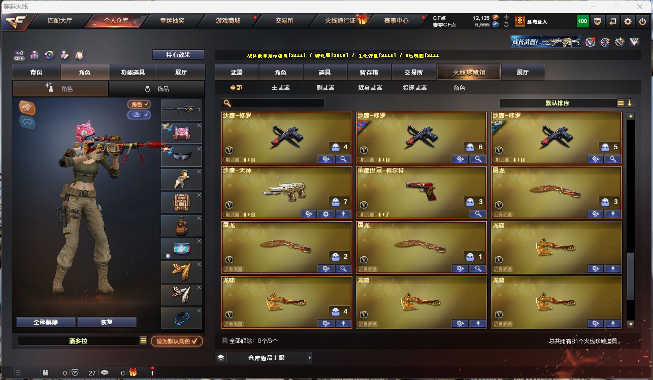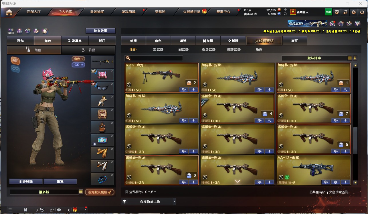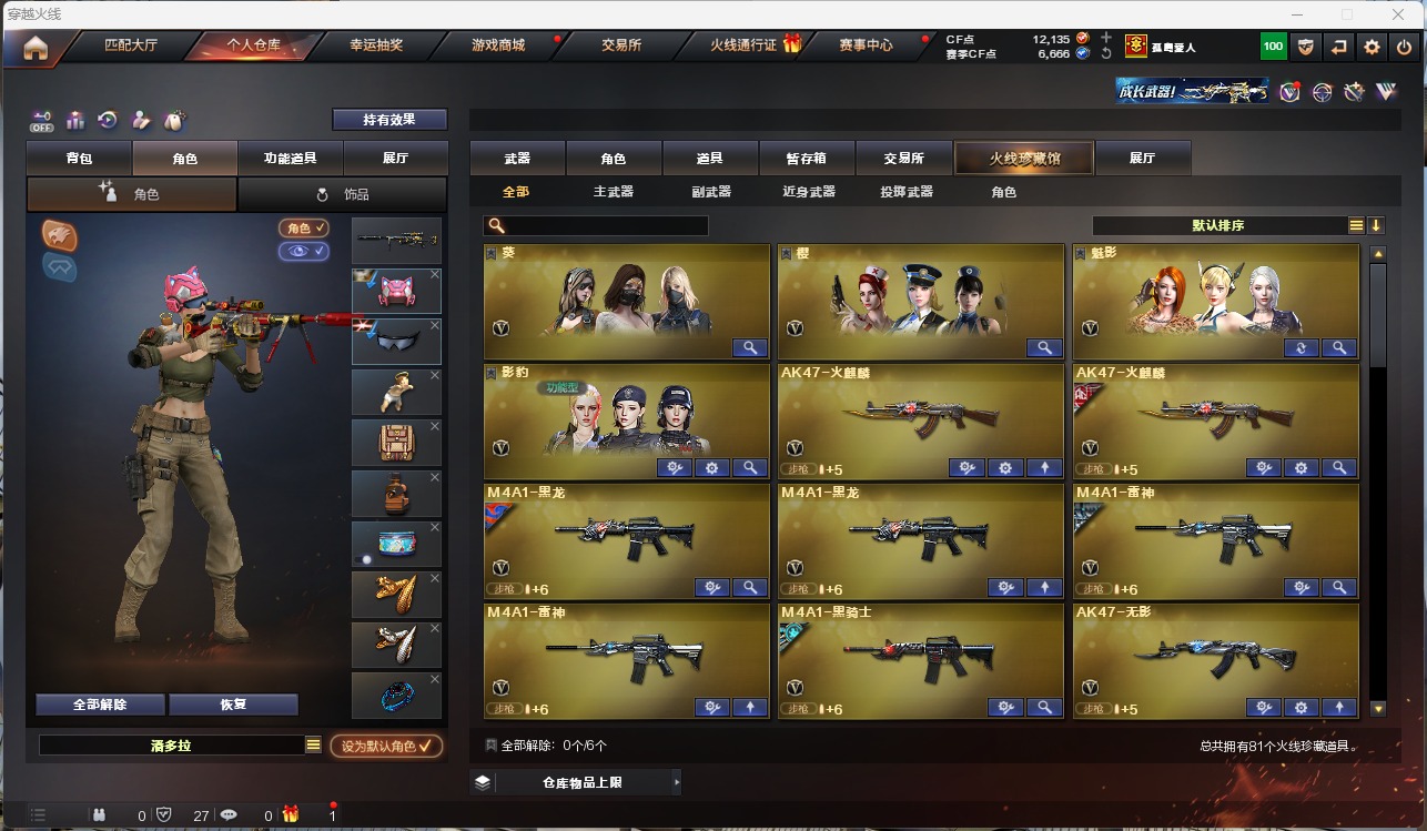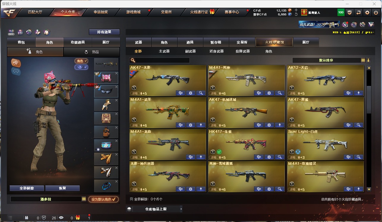 4传说角色 1王者武器 4炫金武器 76v武器 可二次 可修改实名 优质装备:m200-幻神q03-金色蔷薇ak47-无影ak47-机械迷城m4a1-雷神m4a1-黑骑士m4a1-黑龙m4a1-龙血m4a1-玫瑰精灵barrett-毁灭barrett-极光awm-天龙aw