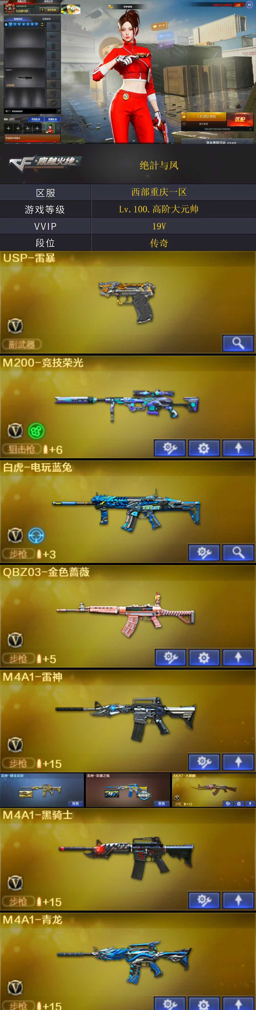 西部战区bbwz123【特惠不刀】 【稀有武器】:m4a1-青龙/usp-雷暴/q03-金色蔷薇/ak47-火麒麟/m4a1-雷神/m4a1-黑骑士/白虎-电玩蓝兔/barrett-毁灭/m200-竞技荣光/擎天-竞技荣光 【王者武器】: 【热门角色】:乔伊教练/潘多拉-x/兔囡囡/潘多拉 【热门音效卡】: 【热门皮肤】:屠龙-荣耀之锋/雷神-荣耀之魄 【其他亮点】:金刚伞-电玩红兔