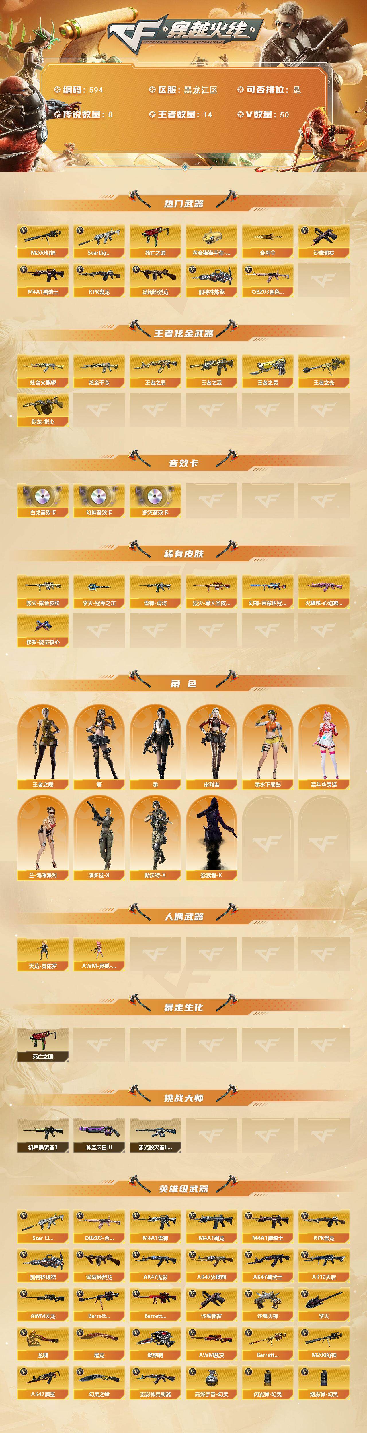 [14511601]黑龙江区-50v-14王者-2炫金 【热门武器】:q03-金色蔷薇,scar light-白虎,m200-幻神,死亡之眼,m4a1-黑骑士,汤姆逊-烈龙,rpk-盘龙,加特林-炼狱2,沙鹰-修罗4,黄金猫猫手套-白鲨,金刚伞 【王者炫金武器】:王者之翼2,王者之武,王者之光,烈龙-悦心,王者之灵,炫金火麒麟,炫金千变 【音效卡】:m200-幻神音效卡,barrett-毁灭音效卡,scar light-白虎音效卡 【皮肤】:m200-幻神-荣耀世冠白鲨,雷神-虎将,火麒麟-心动糖果,毁灭耀金皮肤,毁灭-黑大圣皮肤,修罗-能量核心,擎天-冠军之击 【角色】:零,葵,审判者,王者之瞳,嘉年华灵狐,兰-海滩派对,零-水下丽影,潘多拉-x,斯沃特-x,影武者-x 【人偶武器】:天龙-曼陀罗,awm-灵狐-15周年嘉年华 【暴走生化】:死亡之眼 【挑战大师】:激光毁灭者iii-白马银呛,机甲撕裂者iii,神圣爆裂者-末日iii 【英雄级武器】:ak47-火麒麟2,m4a1-黑龙2,m4a1-雷神,m4a1-黑骑士,ak47-无影,ak47-黑武士2,ak12-天启,ak47-黑鲨,scar light-白虎,无影-神兵利器,q03-金色蔷薇,awm-天龙,barrett-毁灭,barrett-极光,awm-裁决,m200-幻神,barrett-朱雀,rpk-盘龙,加特林-炼狱2,汤姆逊-烈龙,沙鹰-修罗4,沙鹰-天神,屠龙4,龙啸,擎天,麒麟刺2,幻灵之锋,高爆手蕾-幻灵3,闪光丹-幻灵3,盐雾蛋-幻灵2,盐雾蛋-雷霆王者-觉醒版 【道具】:ep战队炫彩背包,全能呛王背包,炫彩背包,夺命之镰,防化服,金色流光-呛王排位2,星辰流光-呛王排位,防弹头盔,防弹衣,c4工具钳,手蕾包 【特殊呛械】:1白虎,1黑骑士,1烈龙,1盘龙,2炼狱