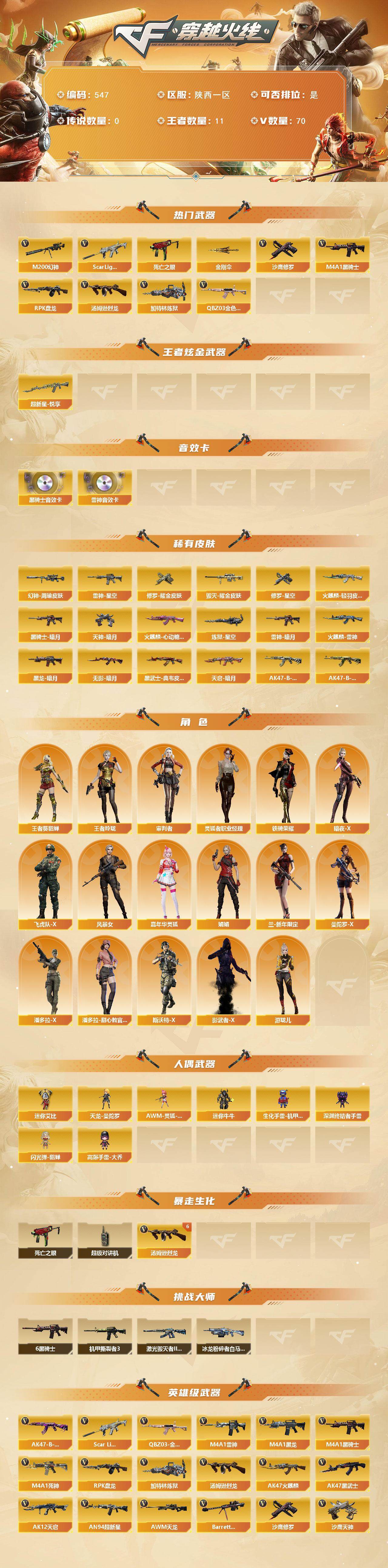 [14597723]陕西一区-70v-11王者-0炫金 【热门武器】:q03-金色蔷薇,scar light-白虎,m200-幻神,死亡之眼,m4a1-黑骑士7,汤姆逊-烈龙6,rpk-盘龙4,加特林-炼狱4,沙鹰-修罗8,金刚伞 【王者炫金武器】:超新星-悦享2 【音效卡】:m4a1-雷神音效卡,m4a1-黑骑士音效卡 【皮肤】:幻神-周瑜皮肤,雷神-暗月,雷神-星空,火麒麟-雷神,火麒麟-轻羽皮肤,火麒麟-心动糖果,毁灭耀金皮肤,黑龙-暗月,黑骑士-暗月,无影-暗月3,黑武士-典韦皮肤,天启-暗月2,ak47-b-常胜将军-刘备,ak47-b-常胜将军-孙权,炼狱-星空,修罗耀金皮肤,修罗-星空,天神-暗月 【角色】:审判者,王者-葵-貂蝉,王者玲珑,暗夜-x,飞虎队-x,风暴女2,嘉年华灵狐,娟娟,兰-新年限定,灵狐者-职业经理,曼陀罗-x,潘多拉-x,潘多拉-甜心教官,斯沃特-x,铁骑荣耀,影武者-x,游珑儿 【人偶武器】:天龙-曼陀罗,awm-灵狐-15周年嘉年华,迷你牛牛2,生化手蕾-机甲核心,深渊终结者手蕾,闪光丹-貂蝉,高爆手蕾-大乔,迷你艾比 【暴走生化】:死亡之眼,超级对讲机 【挑战大师】:冰龙粉碎者-白马银呛,激光毁灭者iii-白马银呛,机甲撕裂者iii 【英雄级武器】:ak47-火麒麟,m4a1-黑龙,m4a1-雷神,m4a1-黑骑士7,m4a1-死神,ak47-黑武士,ak12-天启,an94-超新星,scar light-白虎,无影-神兵利器,黑武士-锦绣游龙,q03-金色蔷薇,王者之势-觉醒版,王者火魄-觉醒版,ak47-b-常胜将军,王者之烈-觉醒版,awm-天龙,barrett-毁灭,awm-裁决,m200-幻神,barrett-朱雀,rpk-盘龙4,加特林-炼狱4,汤姆逊-烈龙6,沙鹰-修罗8,沙鹰-天神4,屠龙6,擎天2,幻灵之锋,王者之击-觉醒版3,高爆手蕾-幻灵2,闪光丹-幻灵2,盐雾蛋-幻灵2 【道具】:cfs限定背包,q9战队炫彩背包,炫彩背包,老虎背包,超级背包,女皇终结者-魔龙之吻,绿色巨人,变异宝贝,生化弹匣,夺命之镰,防化服,金色流光-呛王排位2,星辰流光-呛王排位,流光-鎏金之域,呛王排位28赛季金色流光,呛王排位29赛季金色流光,ep战队名片,ep战队喷图,ep战队击杀图标