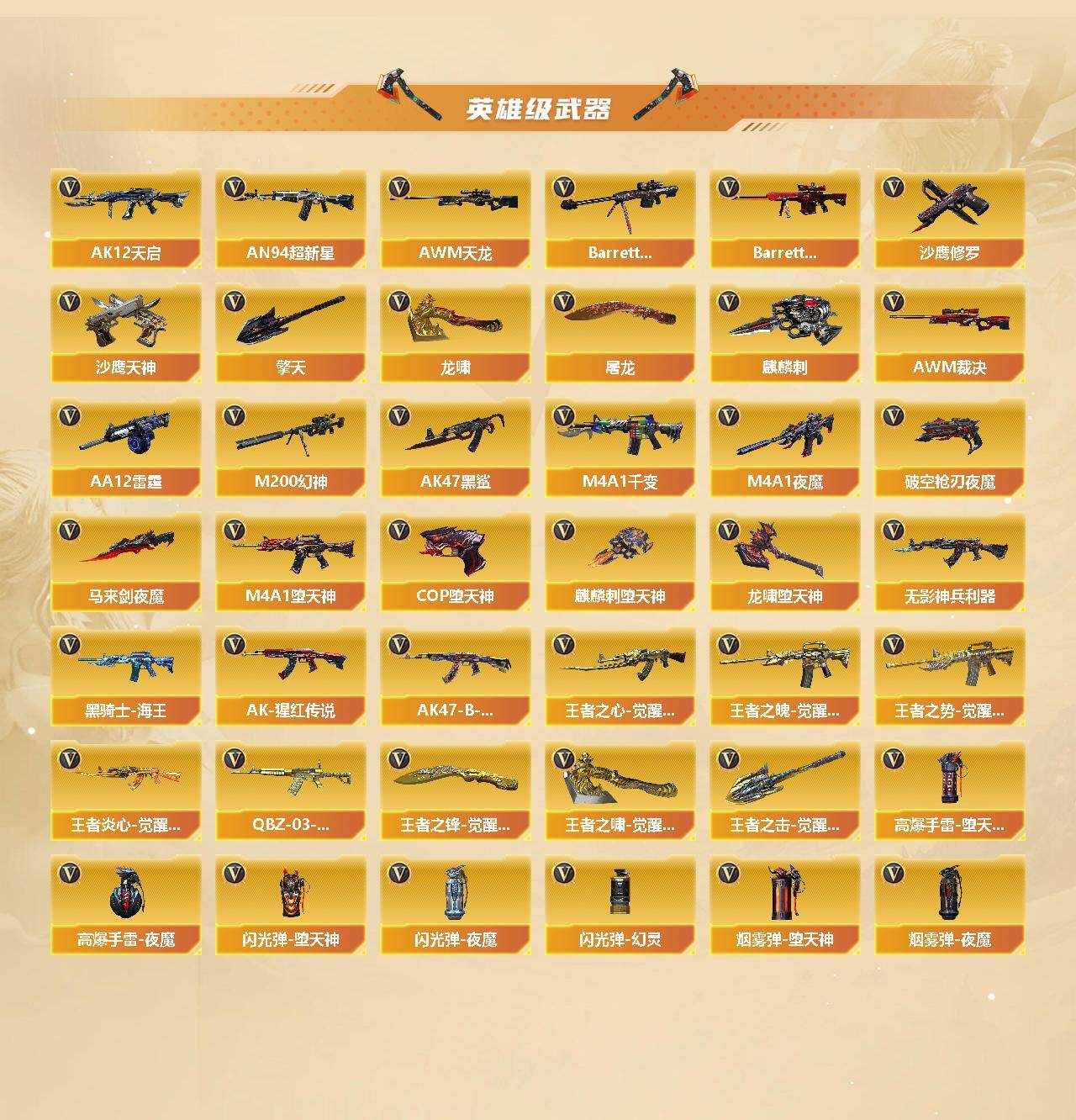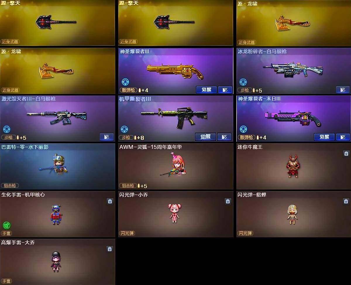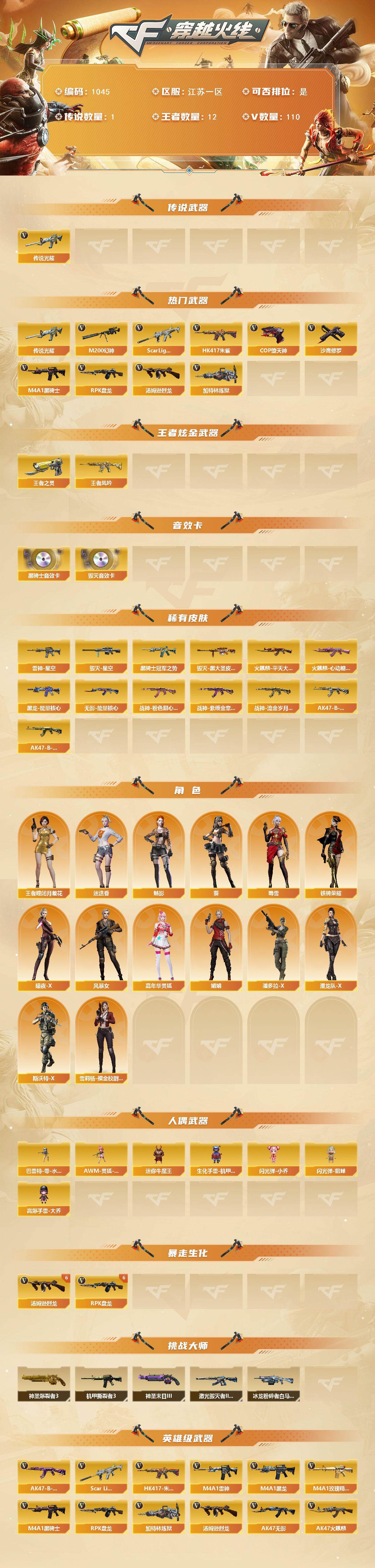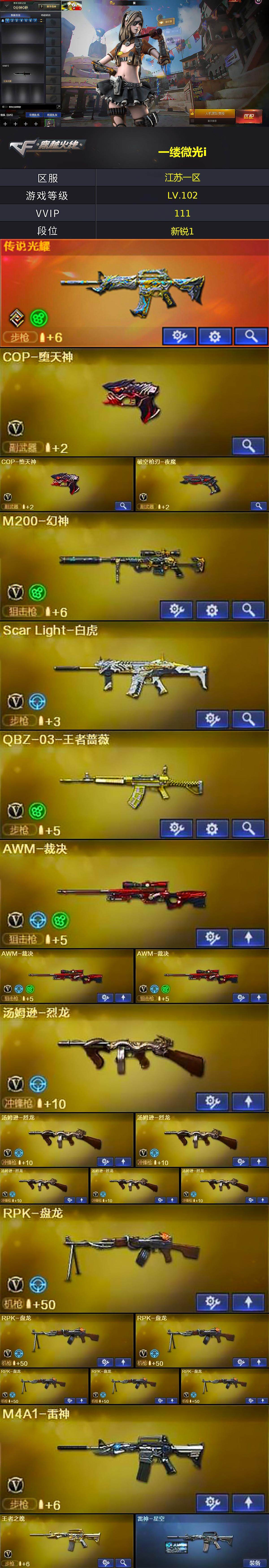 江苏一区-110v-12王者-0炫金 【传说武器】:传说光耀 【热门武器】:传说光耀,scar light-白虎,hk417-朱雀,m200-幻神,m4a1-黑骑士3,汤姆逊-烈龙6,rpk-盘龙6,加特林-炼狱2,cop-堕天神2,沙鹰-修罗3 【王者炫金武器】:王者凤吟,王者之灵 【