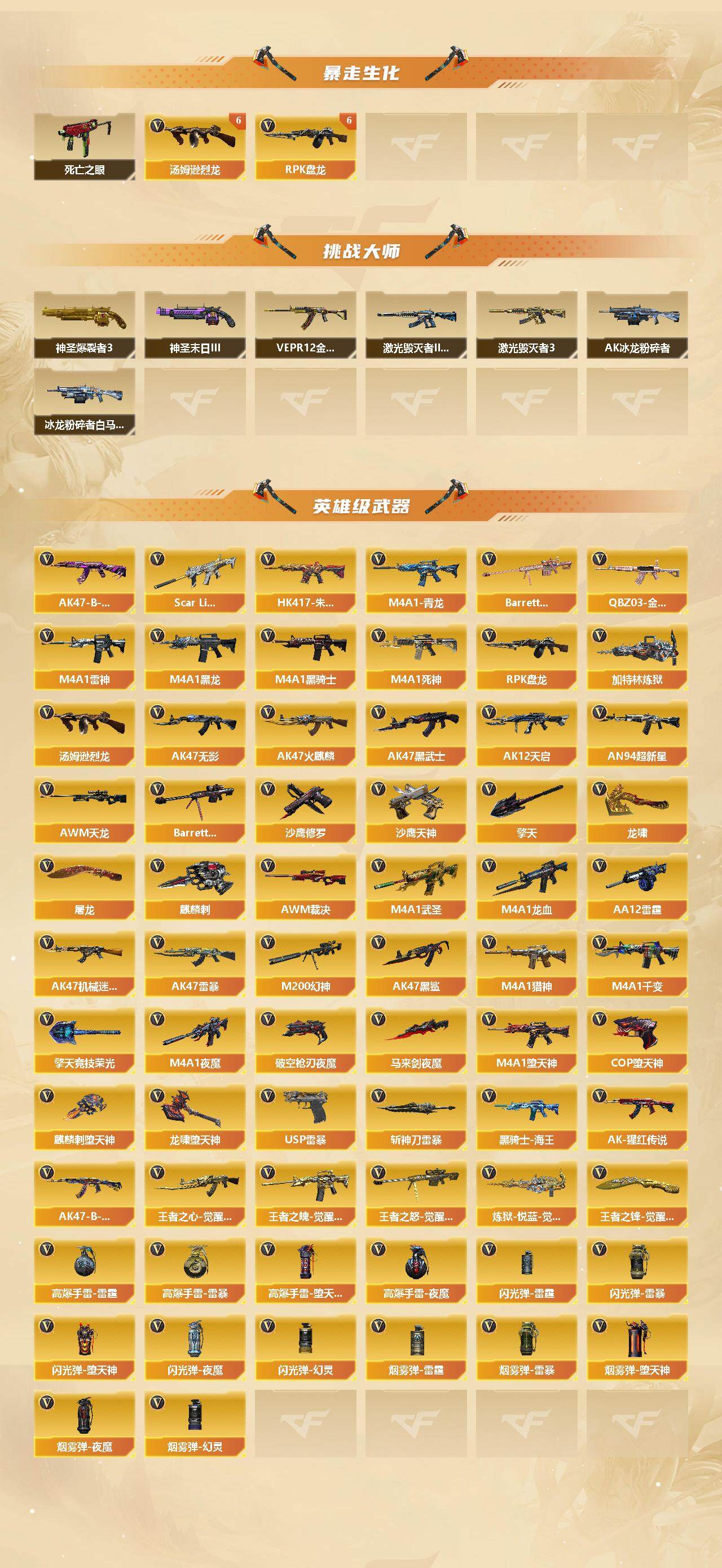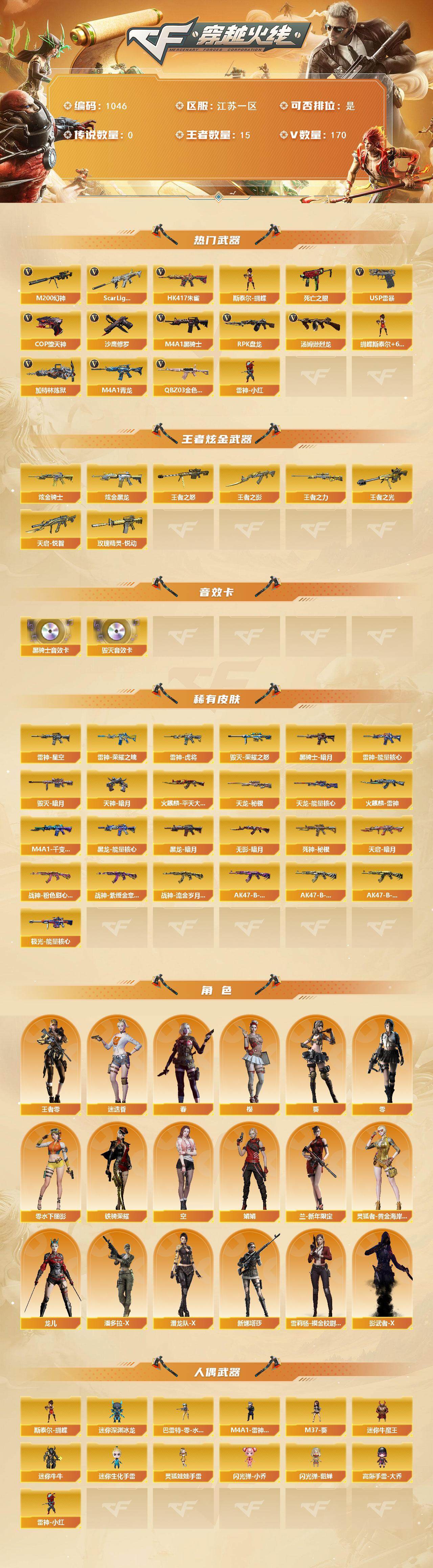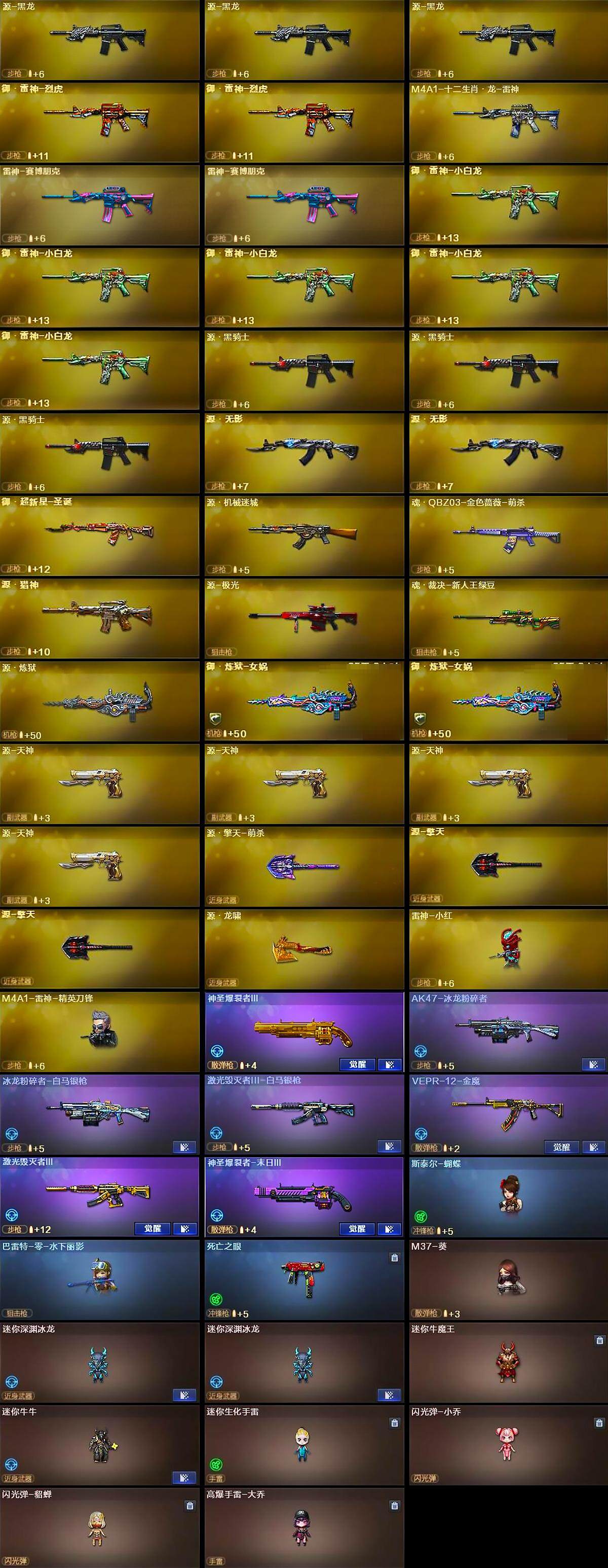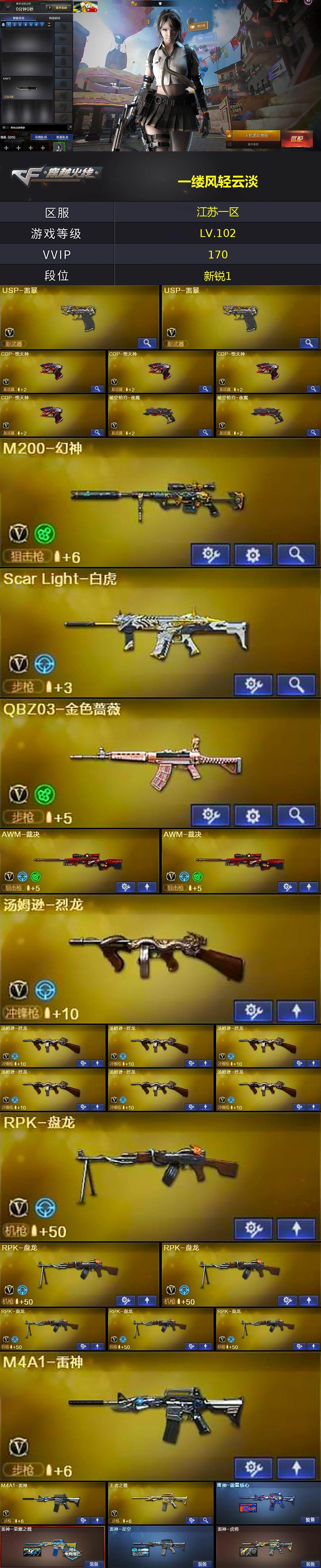 江苏一区-170v-15王者-2炫金 【热门武器】:q03-金色蔷薇,scar light-白虎,hk417-朱雀,m4a1-青龙,m200-幻神,死亡之眼,m4a1-黑骑士,汤姆逊-烈龙7,rpk-盘龙6,加特林-炼狱,斯泰尔-蝴蝶,雷神-小红,usp-雷暴2,cop-堕天神4,沙鹰-