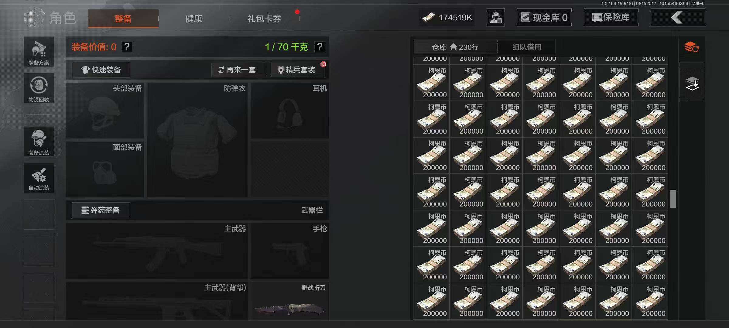 [10715993]暗区 可二次 现金号 1刀 176.4m 野战折刀 1金呛 旗帜·aek 1亿7千万现金 都市夜影套装 竞技·m4a1 竞技·aug 炎夏浪花·ar57 骑士之剑·ace31 饰金·vss 骑士之剑·mk14 6格保险体验卡 机密文件陈列 理想国陈列