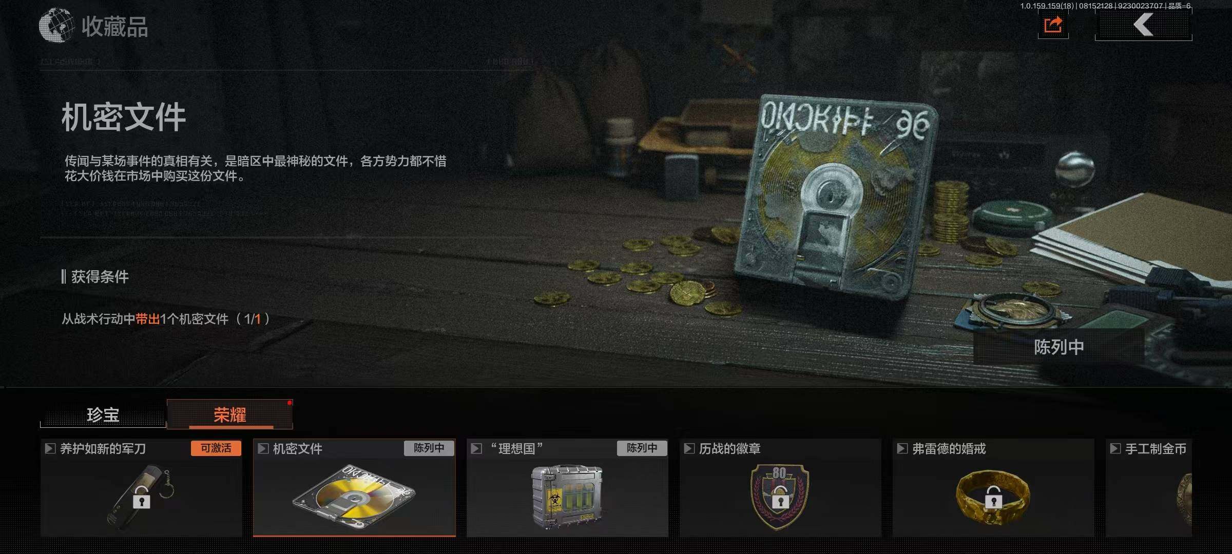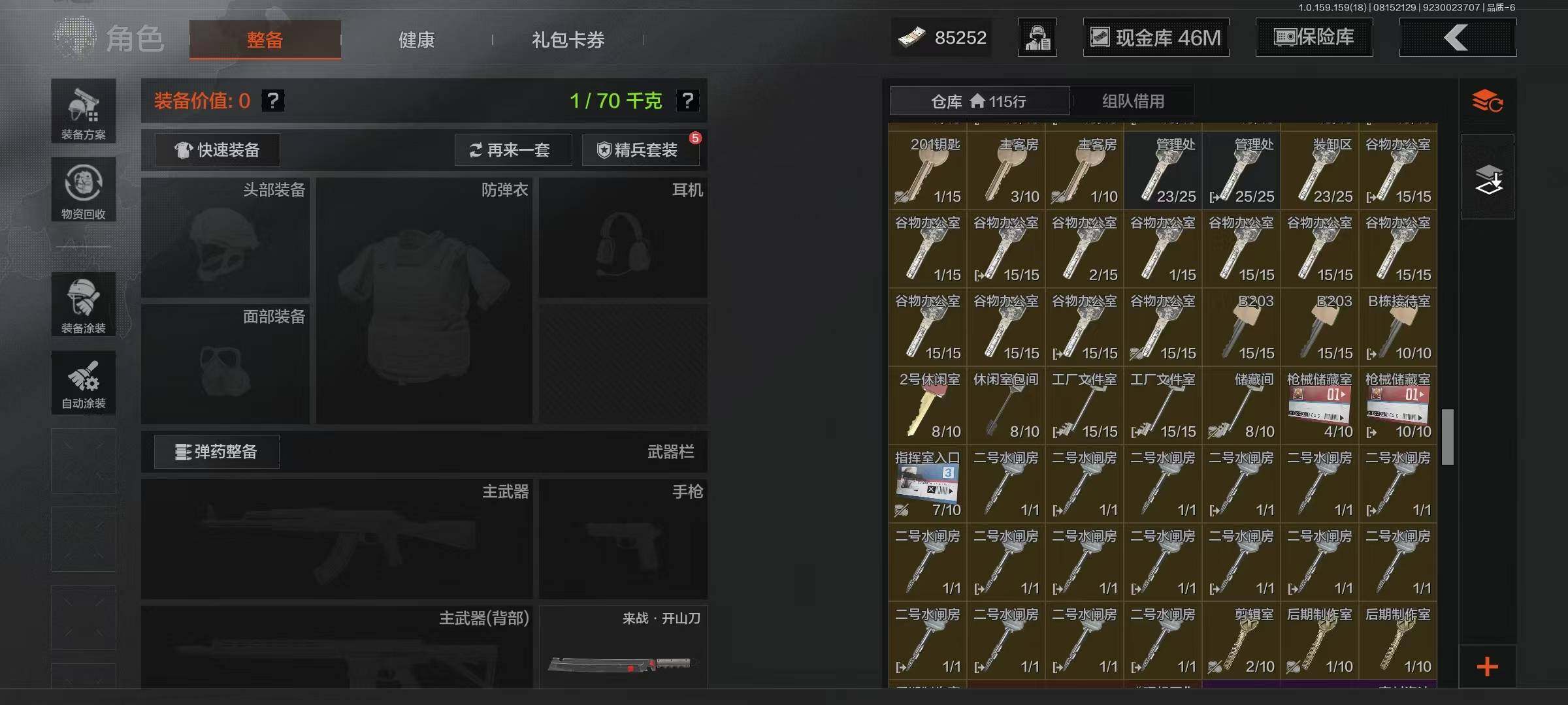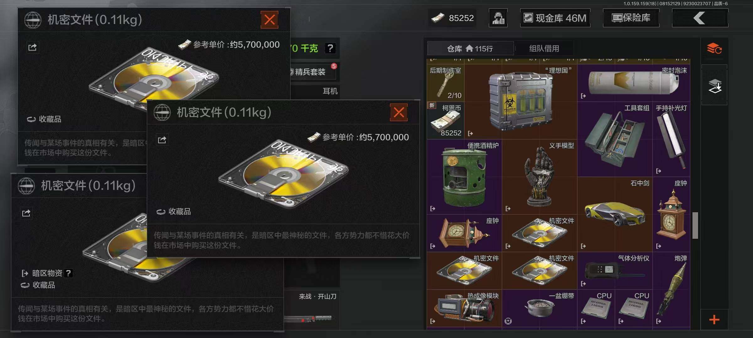 [10717001]暗区 可二次 欧皇摸金号 3机密 仓库价值78.1m 1金呛 4600万现金 蓝色咆哮·h416 机密文件 理想国 速降反光·户外运动套装 都市夜影套装 莫克斯·aks74u 炎夏浪花·ar57 湖冰倒影·mp5