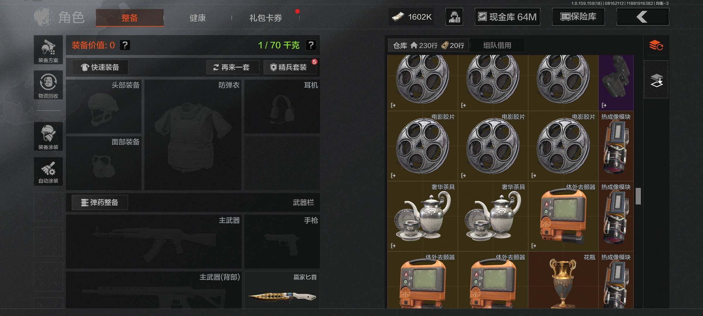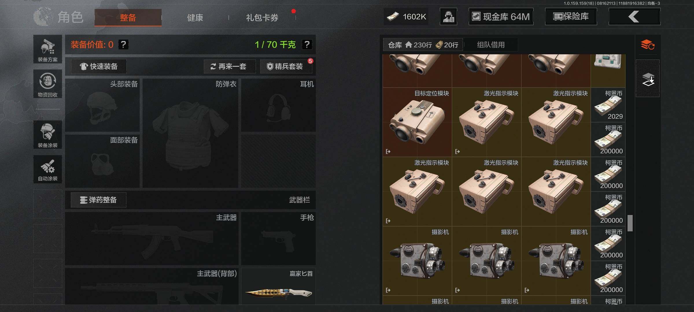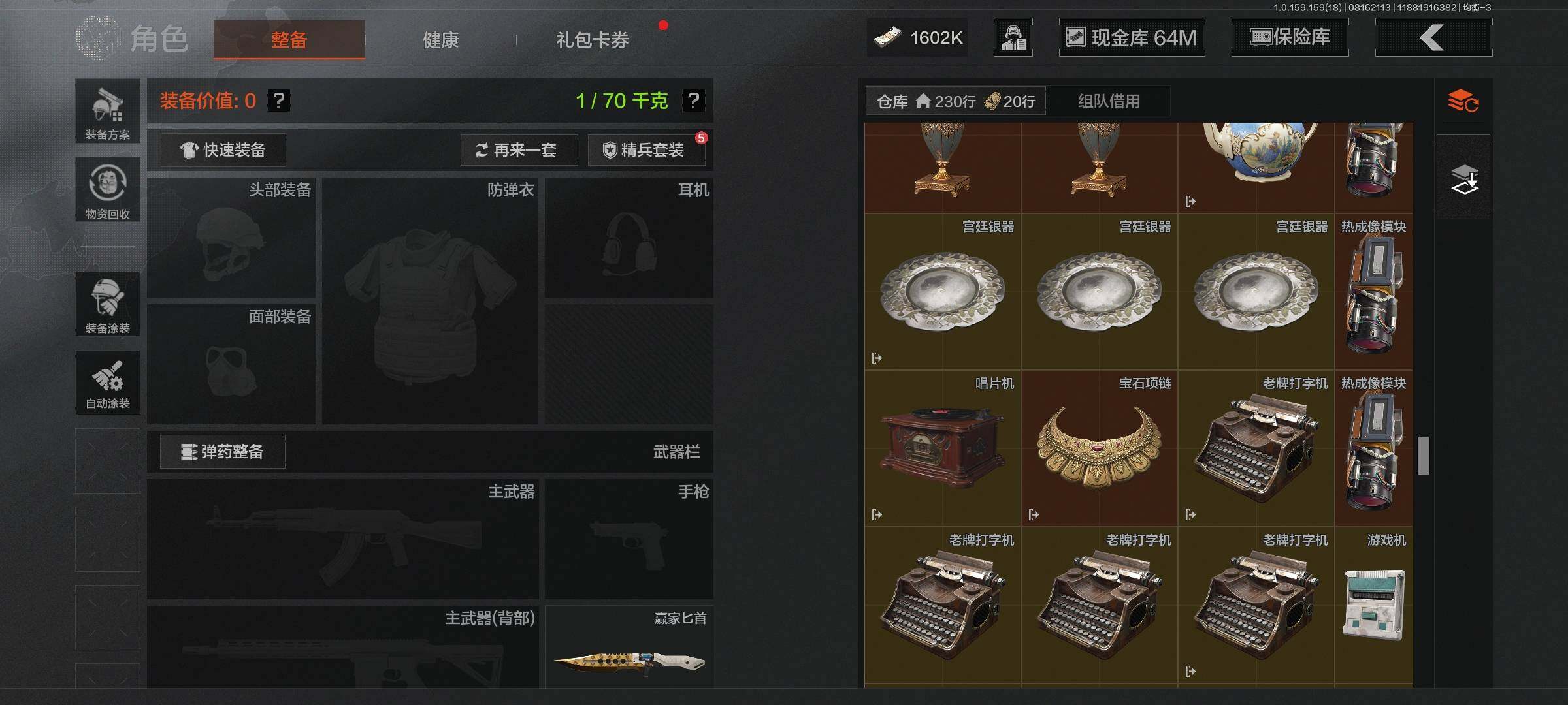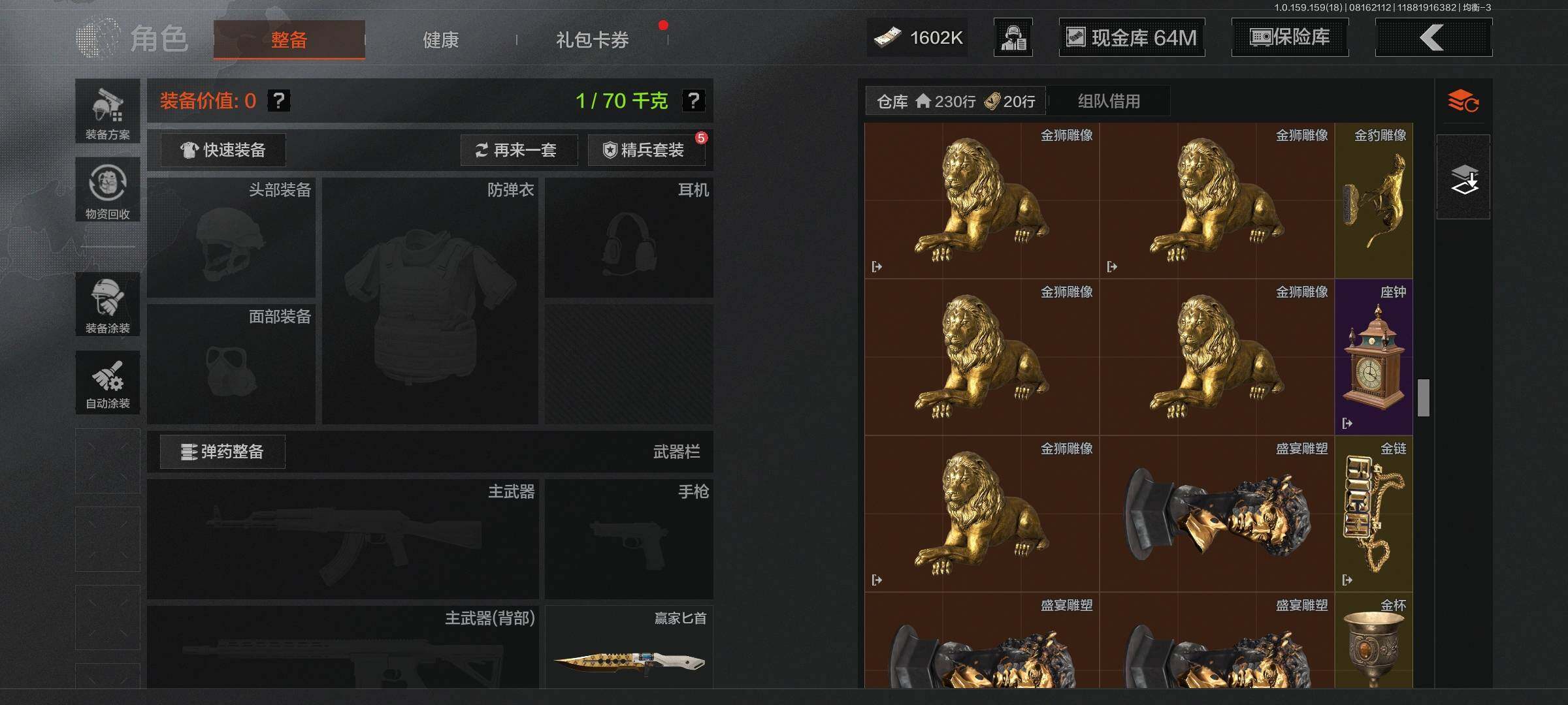 [10763834]暗区 可二次 欧皇号现金号 1刀 仓库价值125.3m 赢家匕首 6400万现金 火力倾泻akm 深水浴池dtmdr 火绒草aug 骑士之剑aks74u 都市夜影套装 金狮雕像 盛宴雕像 机密文件理想国陈列