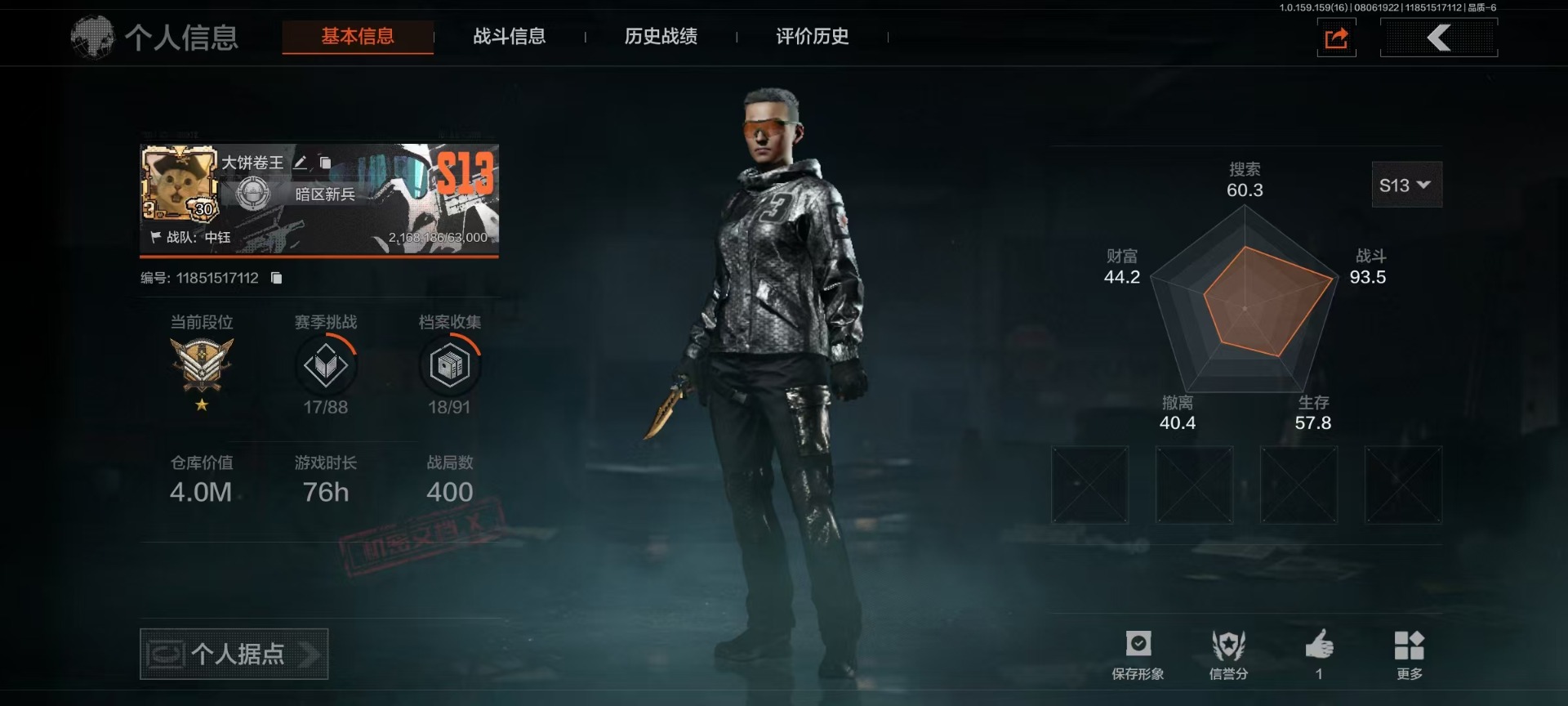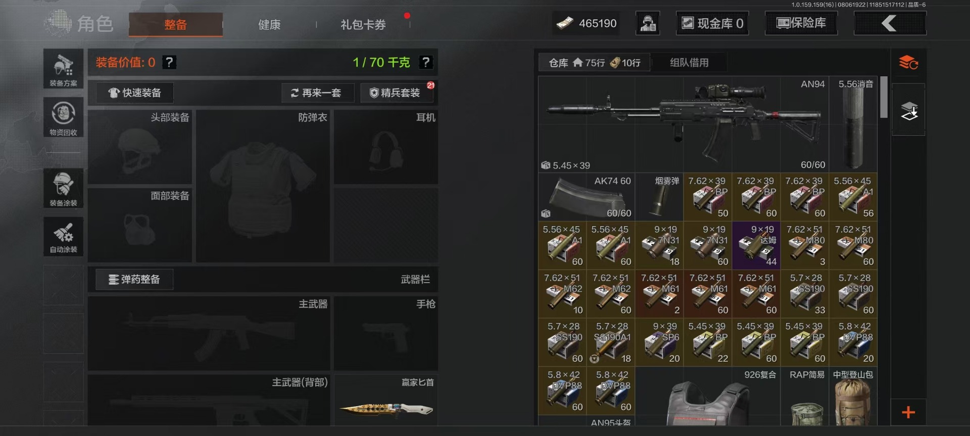 库存价值4.0 3近战武器 可修改实名 柯恩币数量:465190 近战武器:赢家匕首工兵铲来战·开山刀 紫色呛皮:火力倾泻·aug脊峰速降·m赢家·f2000 角色装扮(紫):都市夜影套装