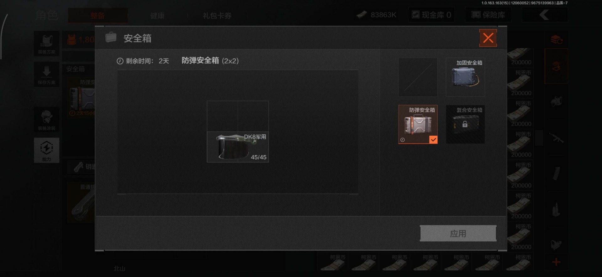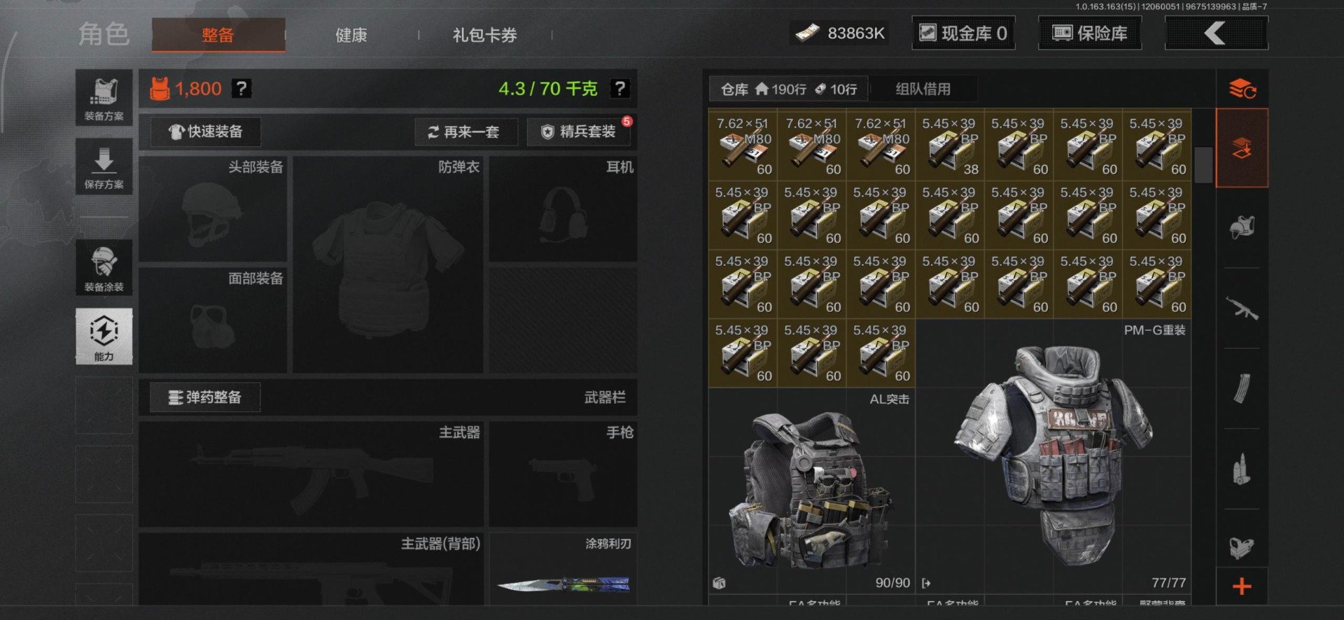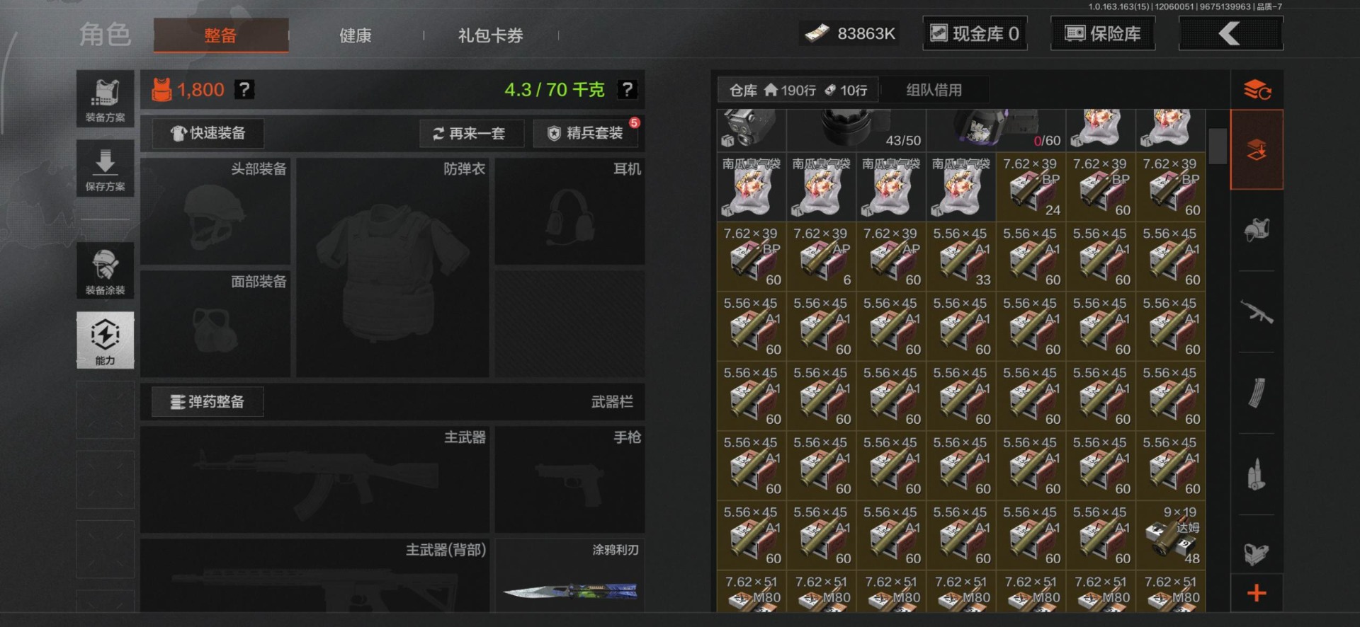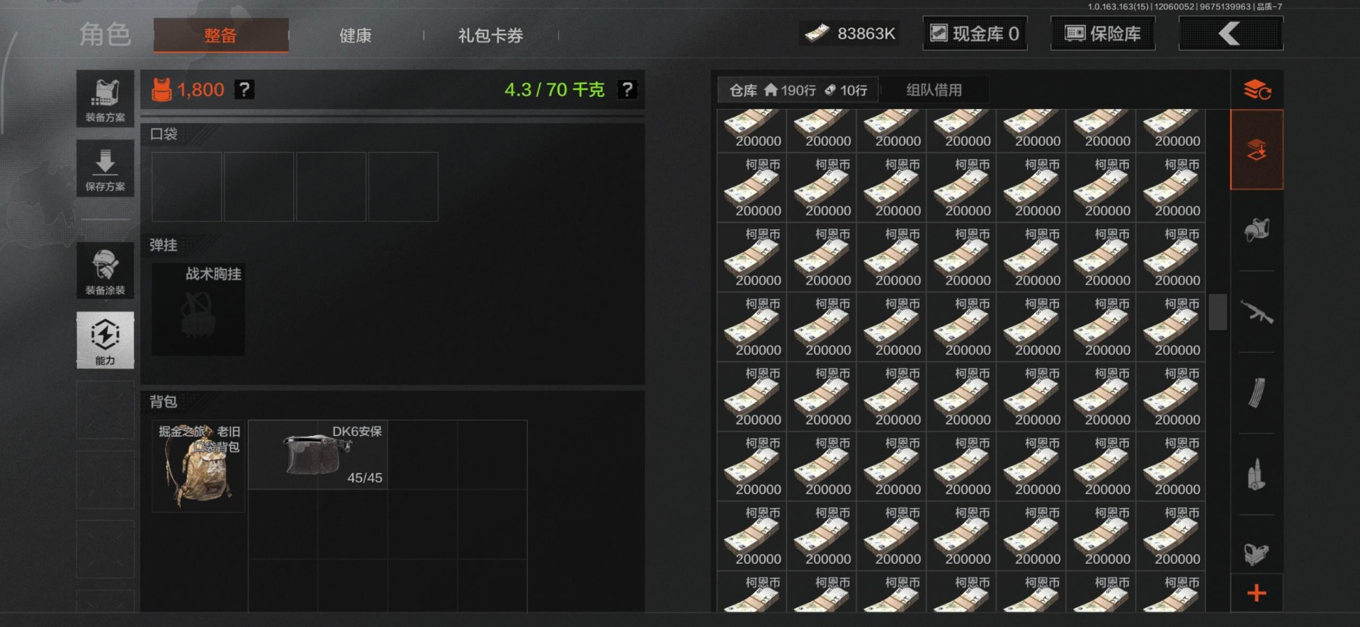 库存价值88.8 4近战武器 3金套装 10金呛皮 可修改实名 【柯恩币数量】:83863 【角色装扮(金)】:钢铁壁垒作战服机车朋克战衣脉冲·马克西姆 【近战武器】:工兵铲来战·开山刀涂鸦利刃裁决手杖剑 【金色呛皮】:告丧夜曲·aug利齿风暴·m浮鳞影青·q192旧王圣