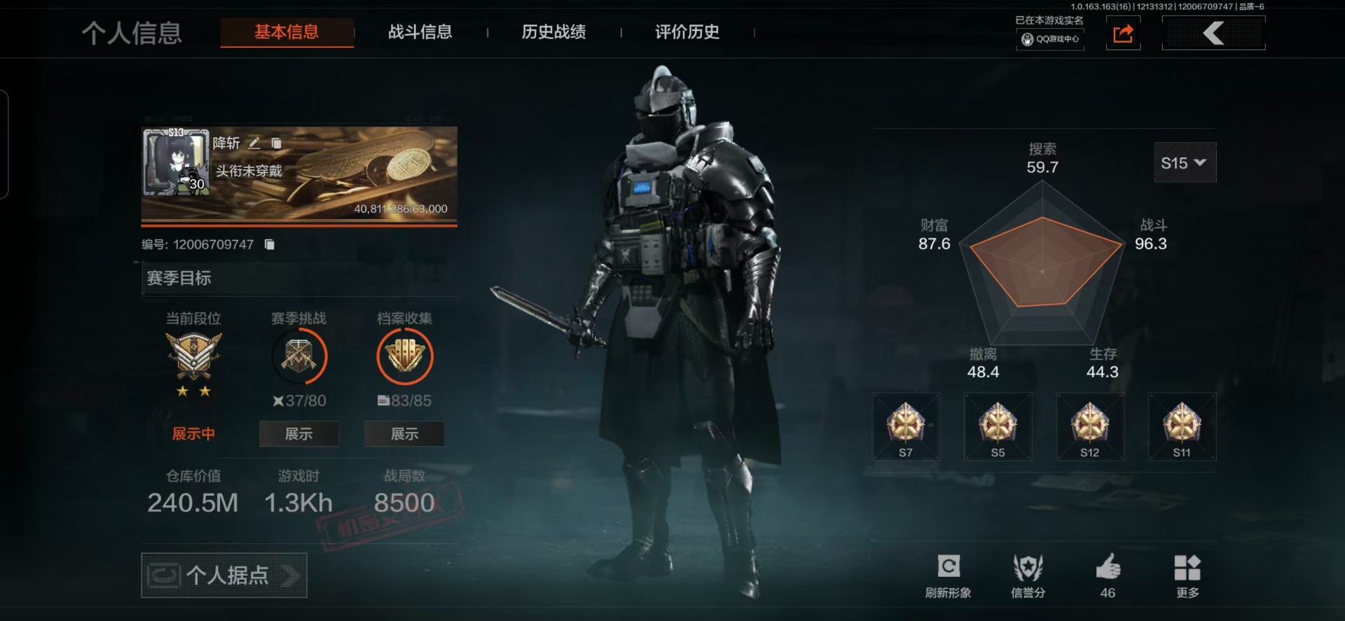 库存价值240.5 22近战武器 4金套装 13金呛皮 可修改实名 【柯恩币数量】:2071 【角色装扮(金)】:绅士西服矿山霸主常服不败坚守作战服噤声者吉利服 【近战武器】:空腔战术苍穹利爪收割者s-07折刀热能武器·补牢赢家匕首瀚星斩铁不屈烈怒盘牙·彻甲短刃三尺万仞·
