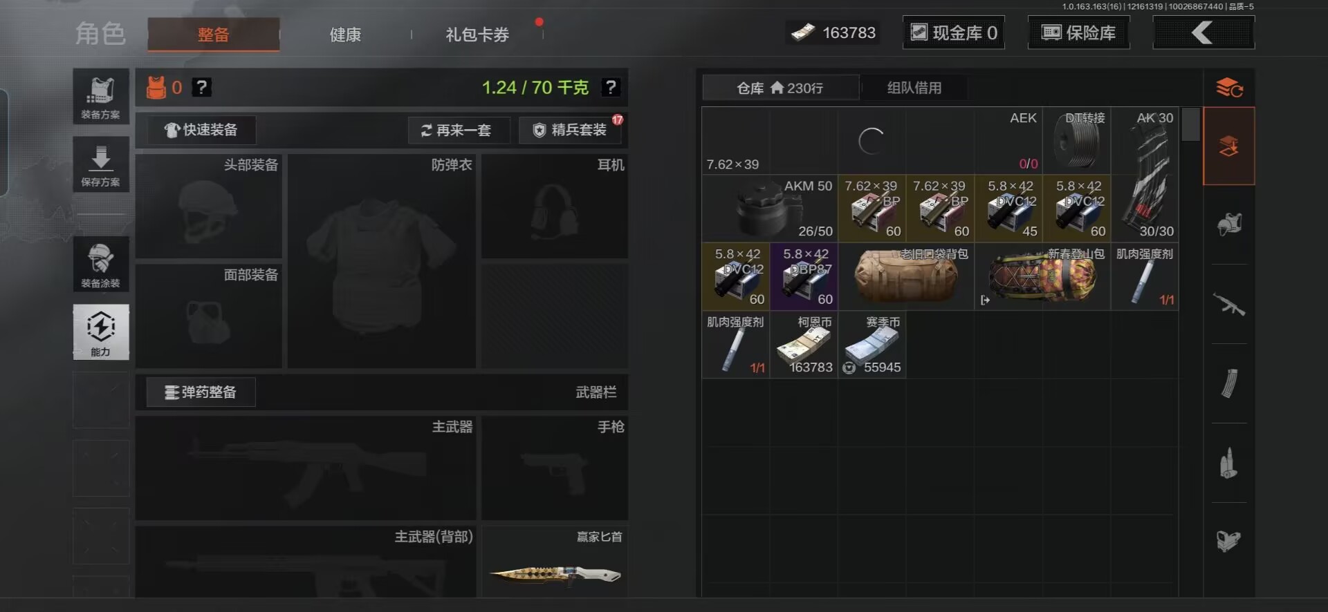 【暗区传说】安卓q-等级30-仓库价值504.2k-科恩币163k-【套装】 都市夜影套装 【呛皮】 旗帜·aek 战术大师·aek 【近战武器】 赢家匕首 来战-开山刀 工兵铲