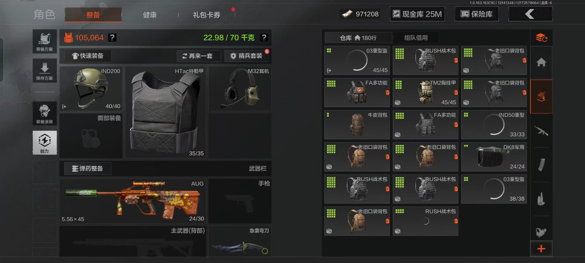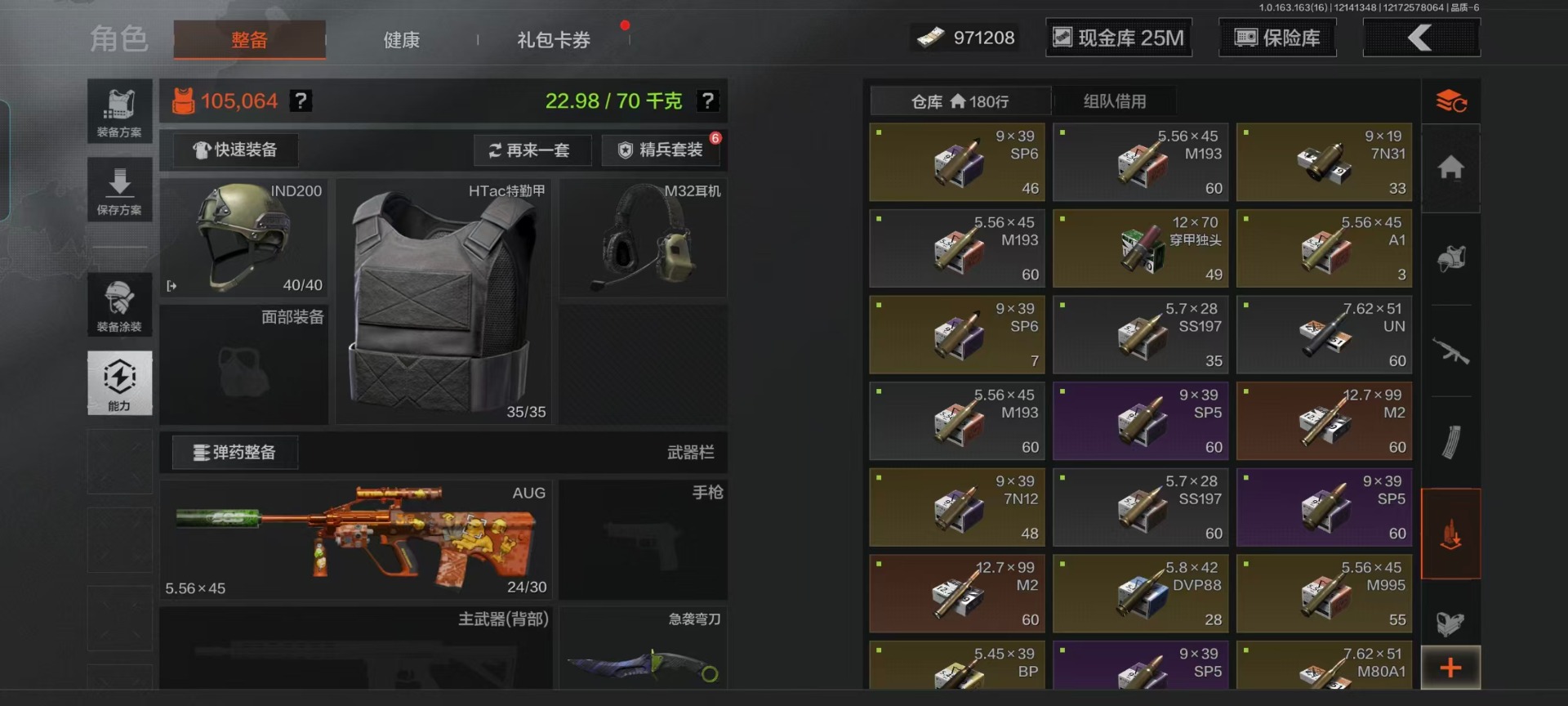库存价值121.6 3近战武器 3金呛皮 可修改实名 【柯恩币数量】:971208 【近战武器】:工兵铲来战·开山刀急袭弯刀 【金色呛皮】:伦琴幻影·fal旗帜·aek骑士之剑·vss 【紫色呛皮】:竞技·m110竞技·mdr竞技·ar57德尔塔小队·h416火力倾泻·aug旗