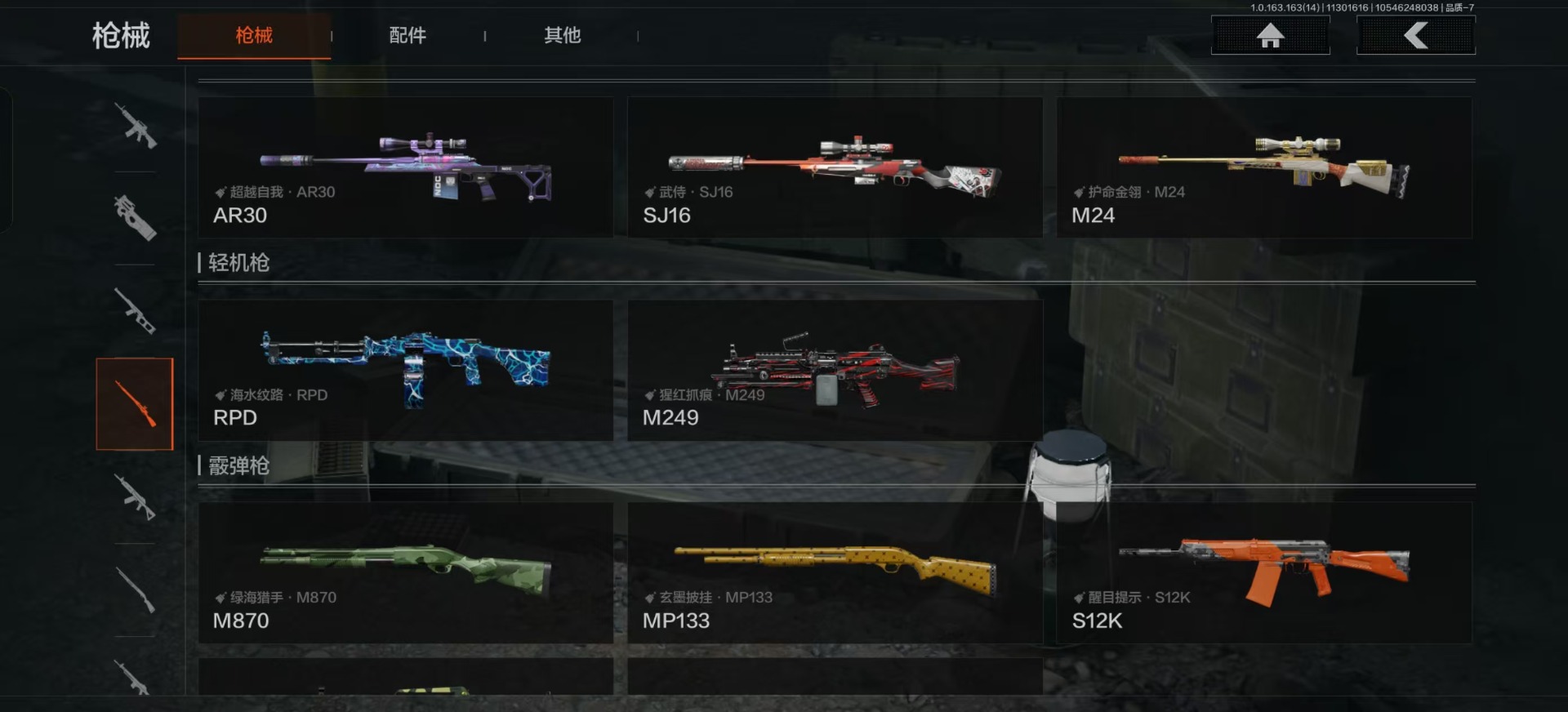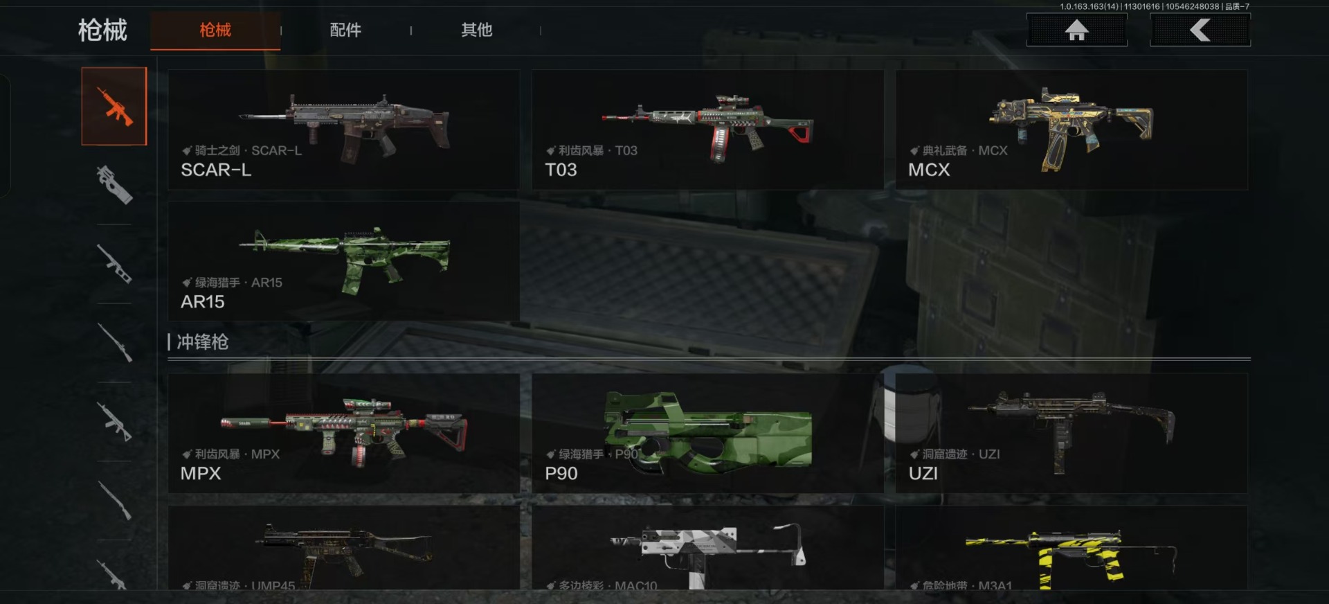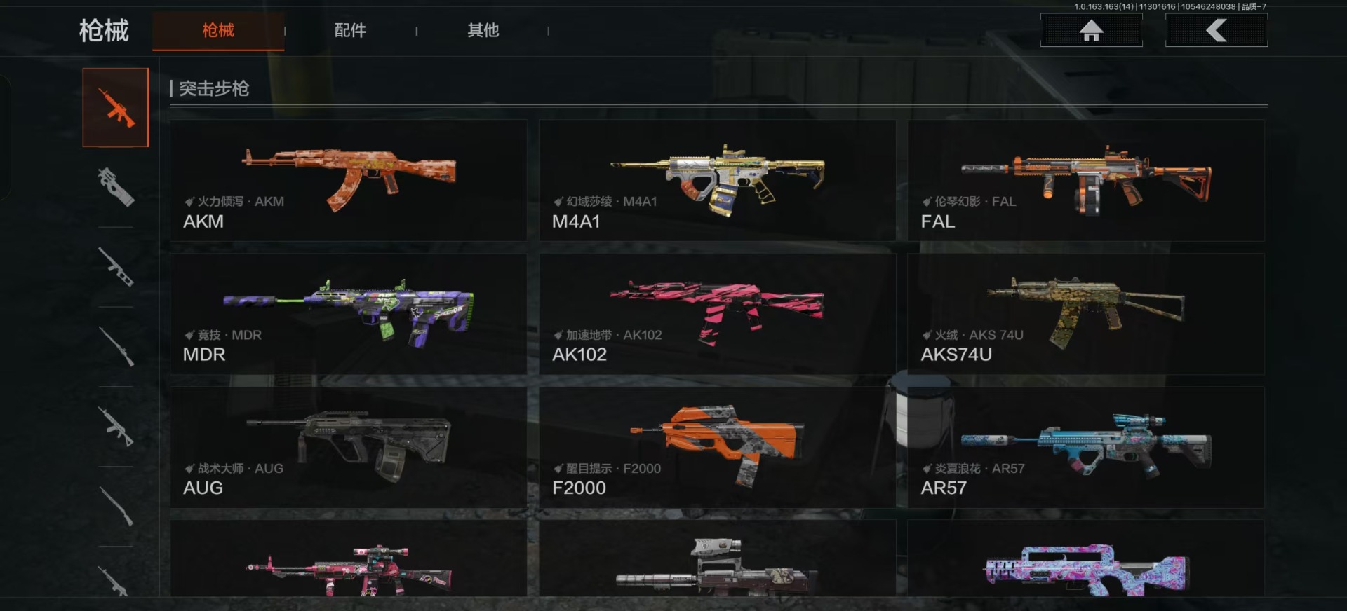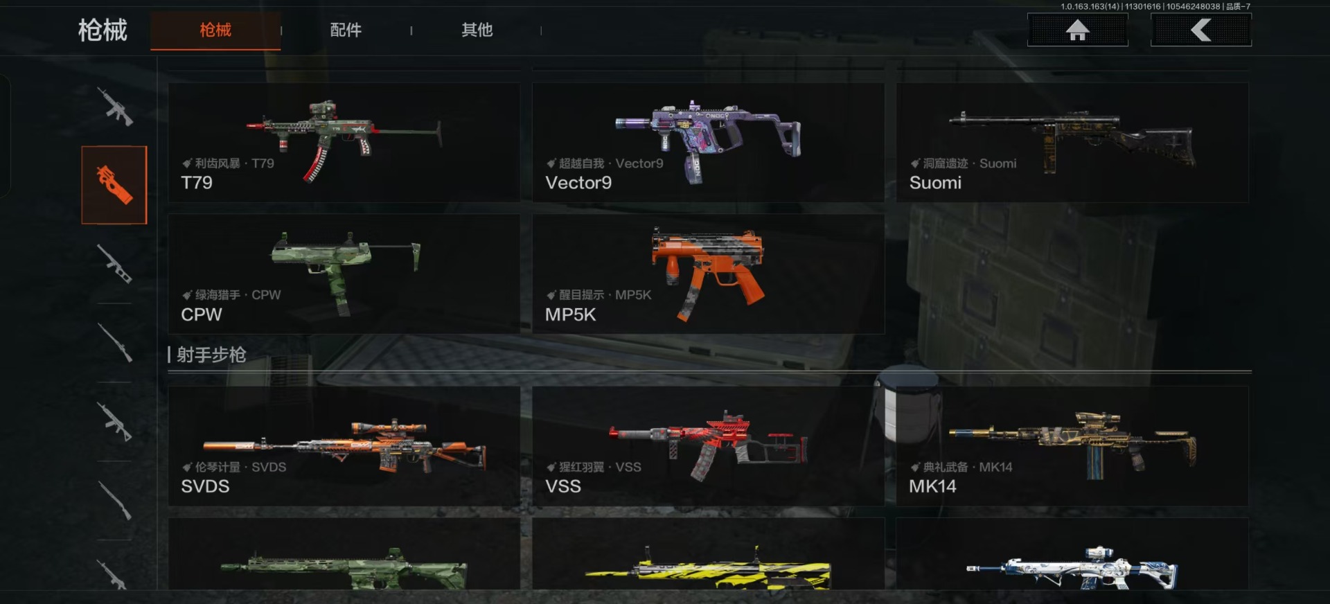 库存价值9.7 3近战武器 2金呛皮 可修改实名 【柯恩币数量】:143442 【近战武器】:苍穹利爪s-07折刀工兵铲 【金色呛皮】:利齿风暴·m伦琴幻影·fal 【紫色呛皮】:武侍·sj16超越自我·vect9超越自我·ar30竞技·mdr利齿风暴·t03利齿风暴·t
