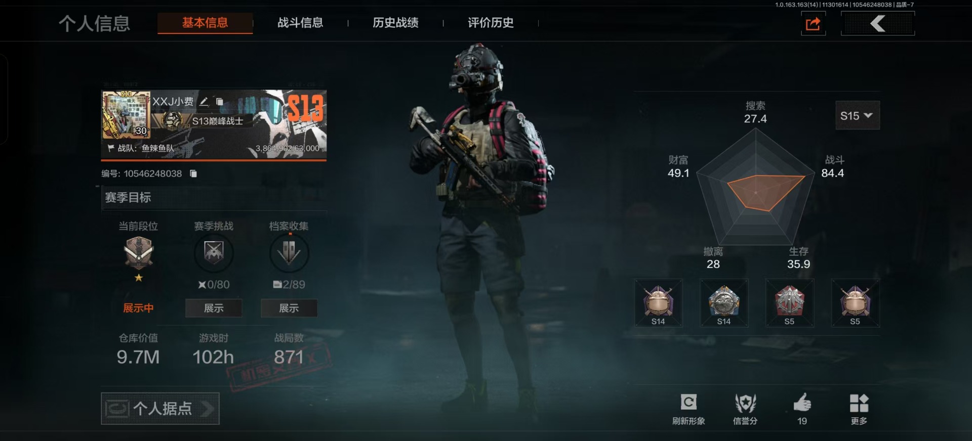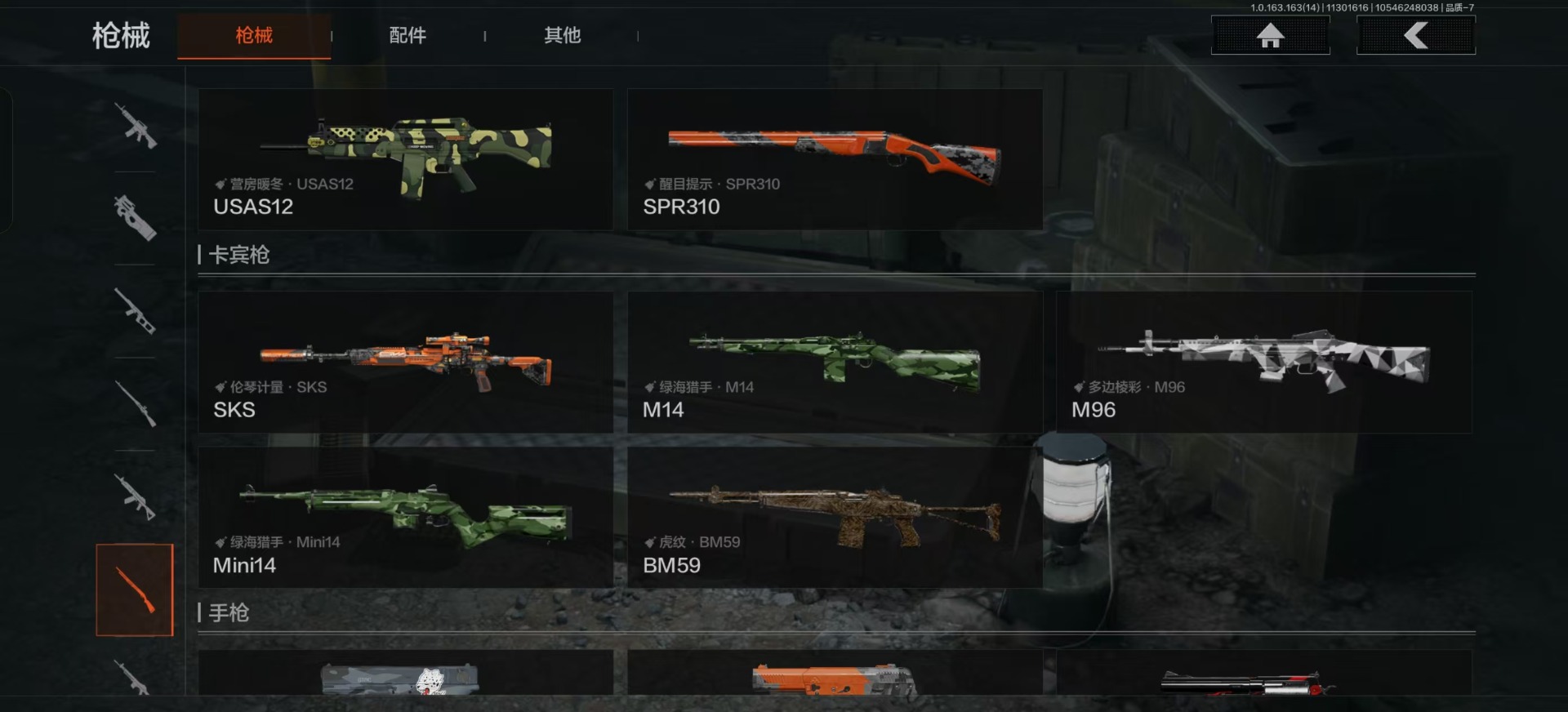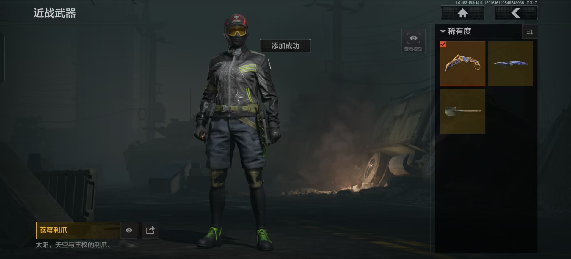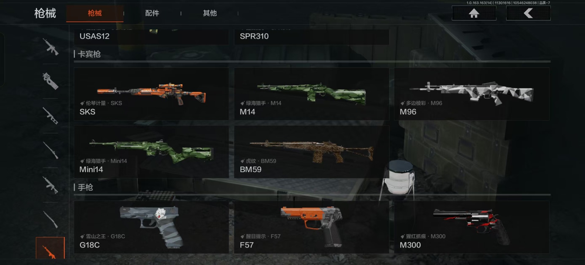 库存价值9.7 3近战武器 2金呛皮 可修改实名 【柯恩币数量】:143442 【近战武器】:苍穹利爪s-07折刀工兵铲 【金色呛皮】:利齿风暴·m伦琴幻影·fal 【紫色呛皮】:武侍·sj16超越自我·vect9超越自我·ar30竞技·mdr利齿风暴·t03利齿风暴·t