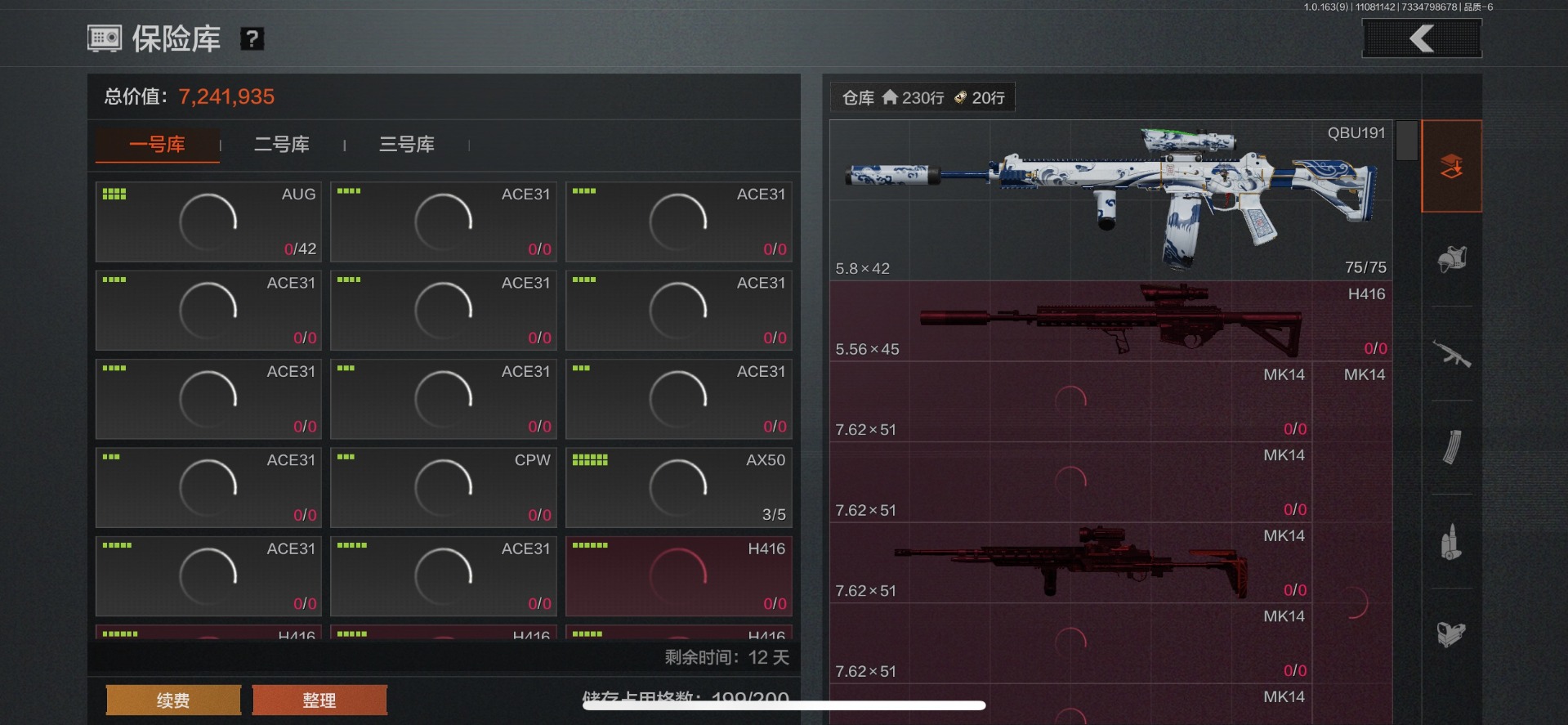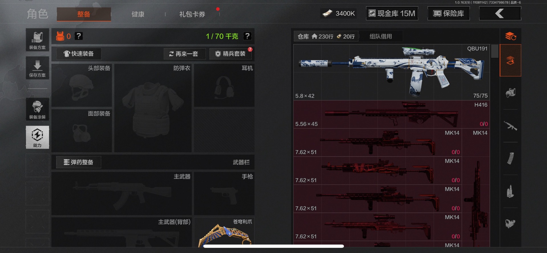[14682567]库存价值31.2 3近战武器 4金呛皮 可修改实名 【柯恩币数量】:3400 【近战武器】:苍穹利爪热能武器·补牢工兵铲 【金色呛皮】:利齿风暴·m伦琴幻影·fal旧王圣谕·q191旧王圣谕·vss 【紫色呛皮】:高塔之内·vss竞技·mdr利齿风暴·t