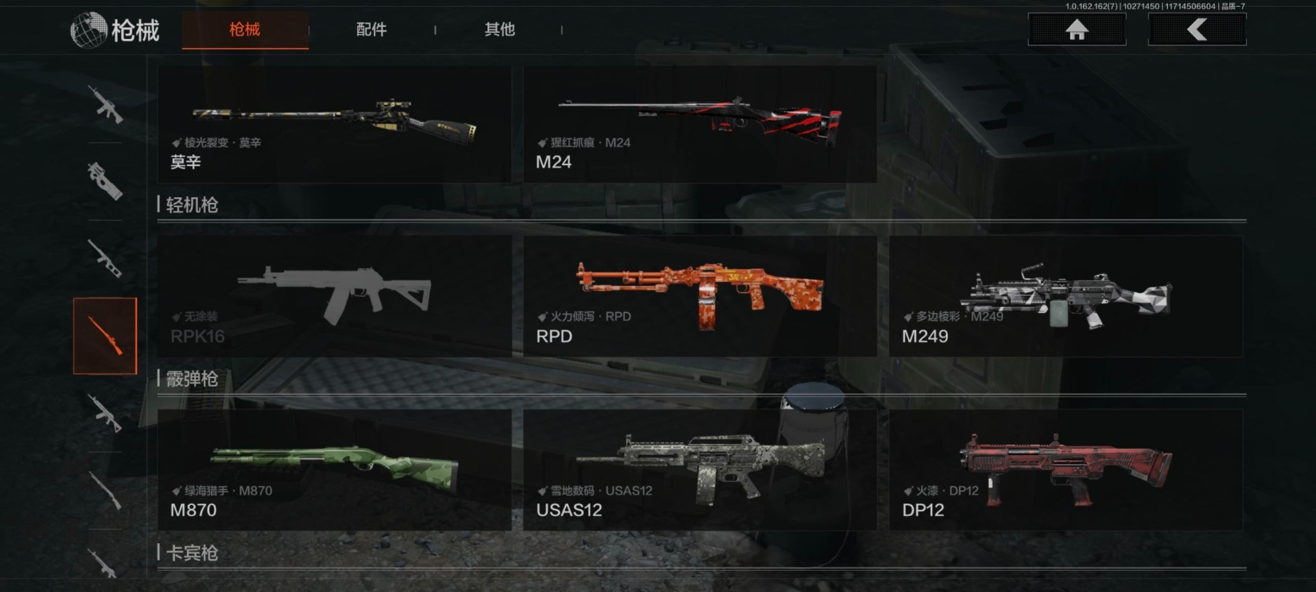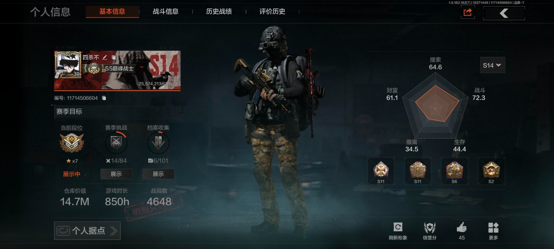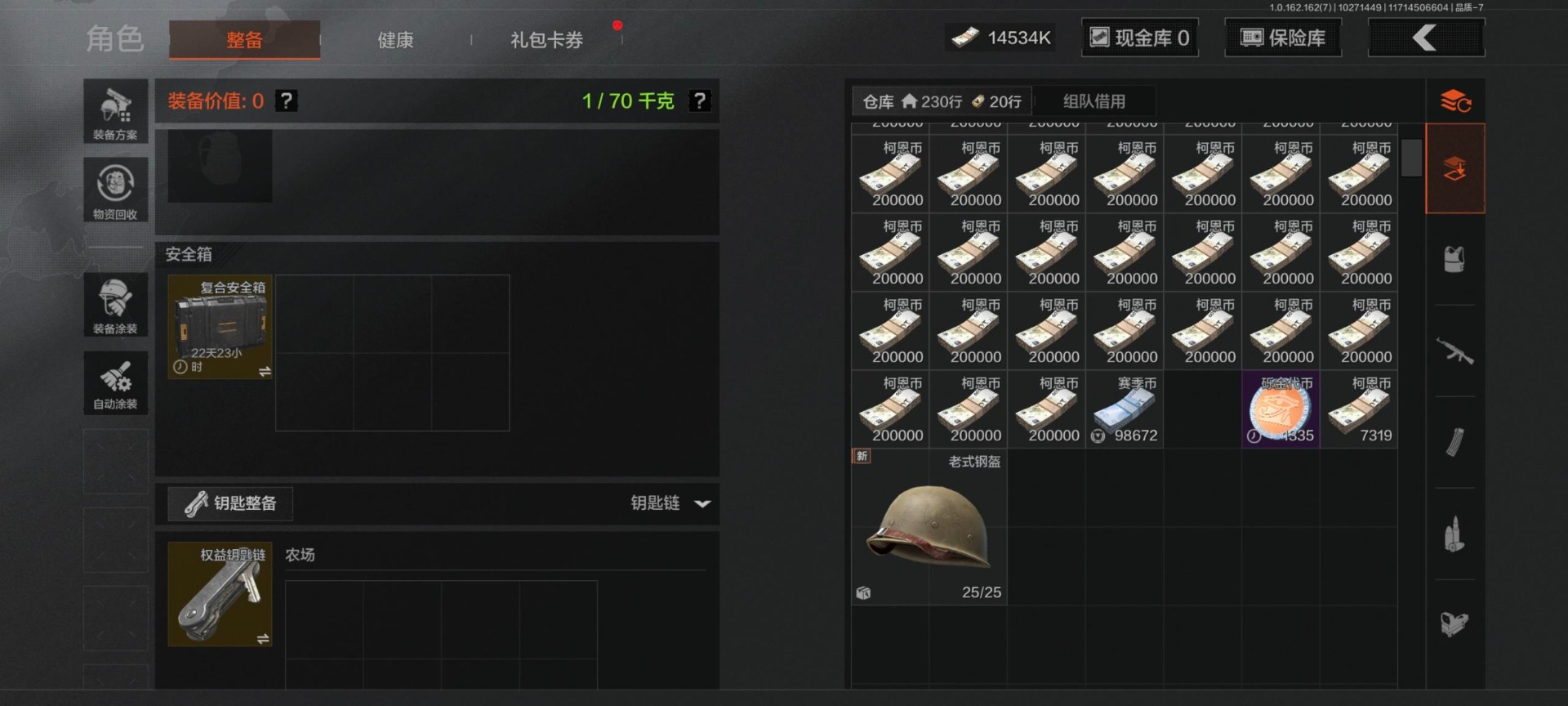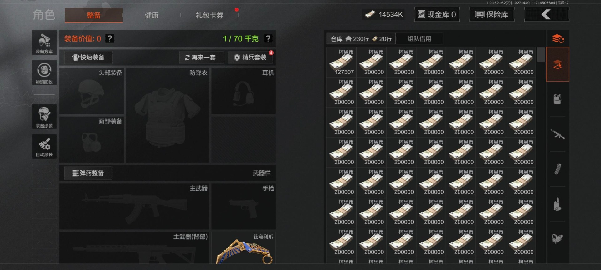 [14683967]库存价值14.7 3近战武器 3金呛皮 可修改实名 【柯恩币数量】:14534 【近战武器】:突击匕首苍穹利爪收割者 【金色呛皮】:告丧夜曲·aug棱光裂变·qbu191利齿风暴·m 【紫色呛皮】:火力倾泻·rpd棱光裂变·莫辛棱光裂变·ace31棱光裂变·ak74n棱光裂变·ak102棱光裂变·akm火力倾泻·aug典礼武备·mk14幻域莎绫·m4a1典礼武备·groza莫克斯·aks74u利齿风暴·t03利齿风暴·t79猩红羽翼·vss鱼跃丹青·dt mdr鱼跃丹青·qbu191鱼跃丹青·t85缟兵玄墨·m11007式林地迷彩·q191湖冰倒影·mp5涂鸦·g18c粉绒臻选·an94